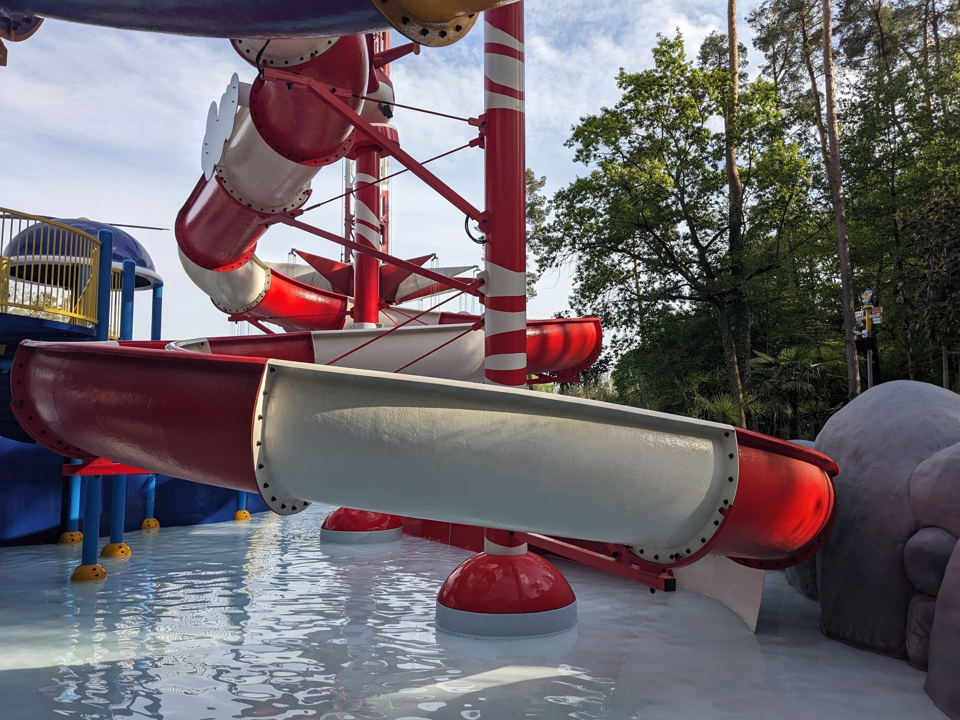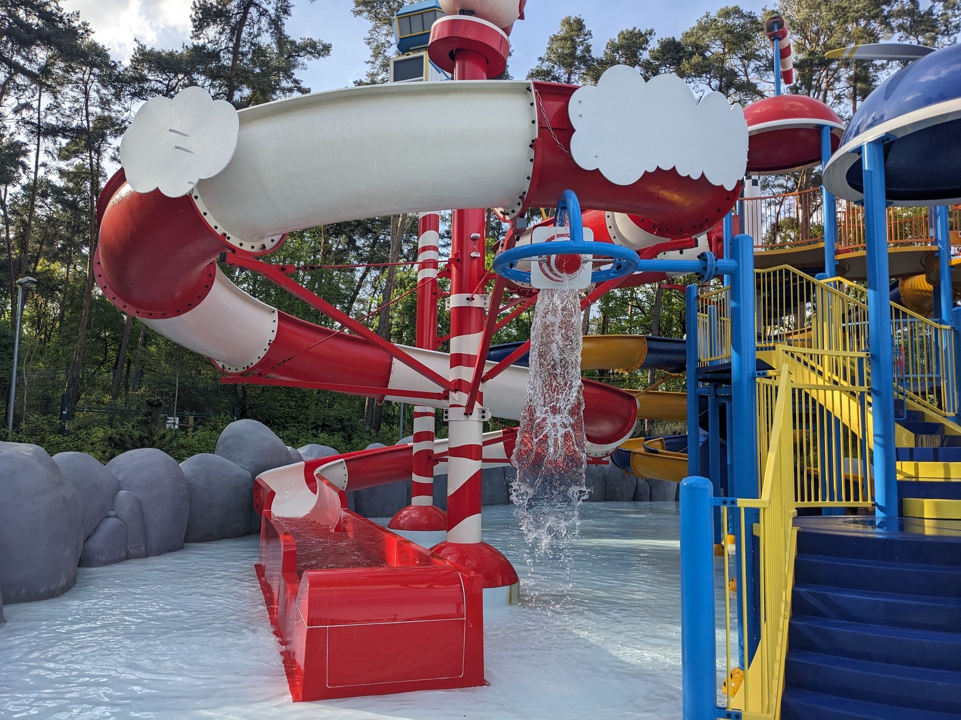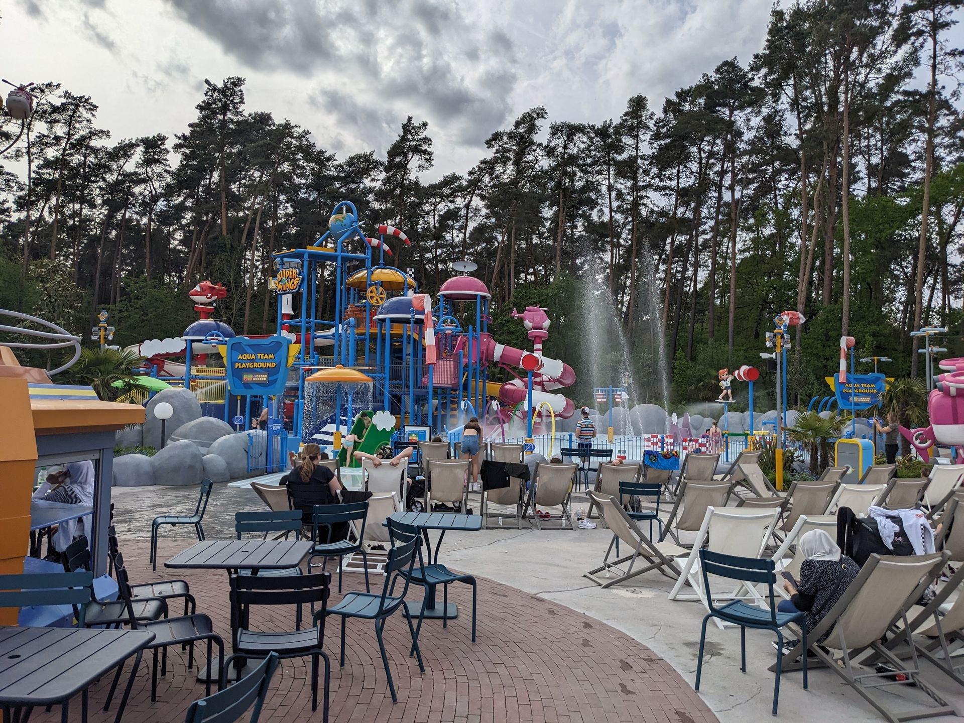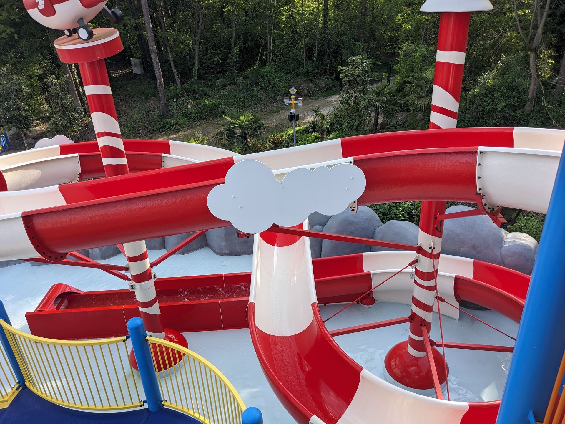 Doch uns zieht eher die letztjährige Neuheit hier her, die eben schon im Hintergrund zu sehen war: Der Wasserspielplatz Super Wings mit durchaus 3 ausgewachsenen Rutschen: