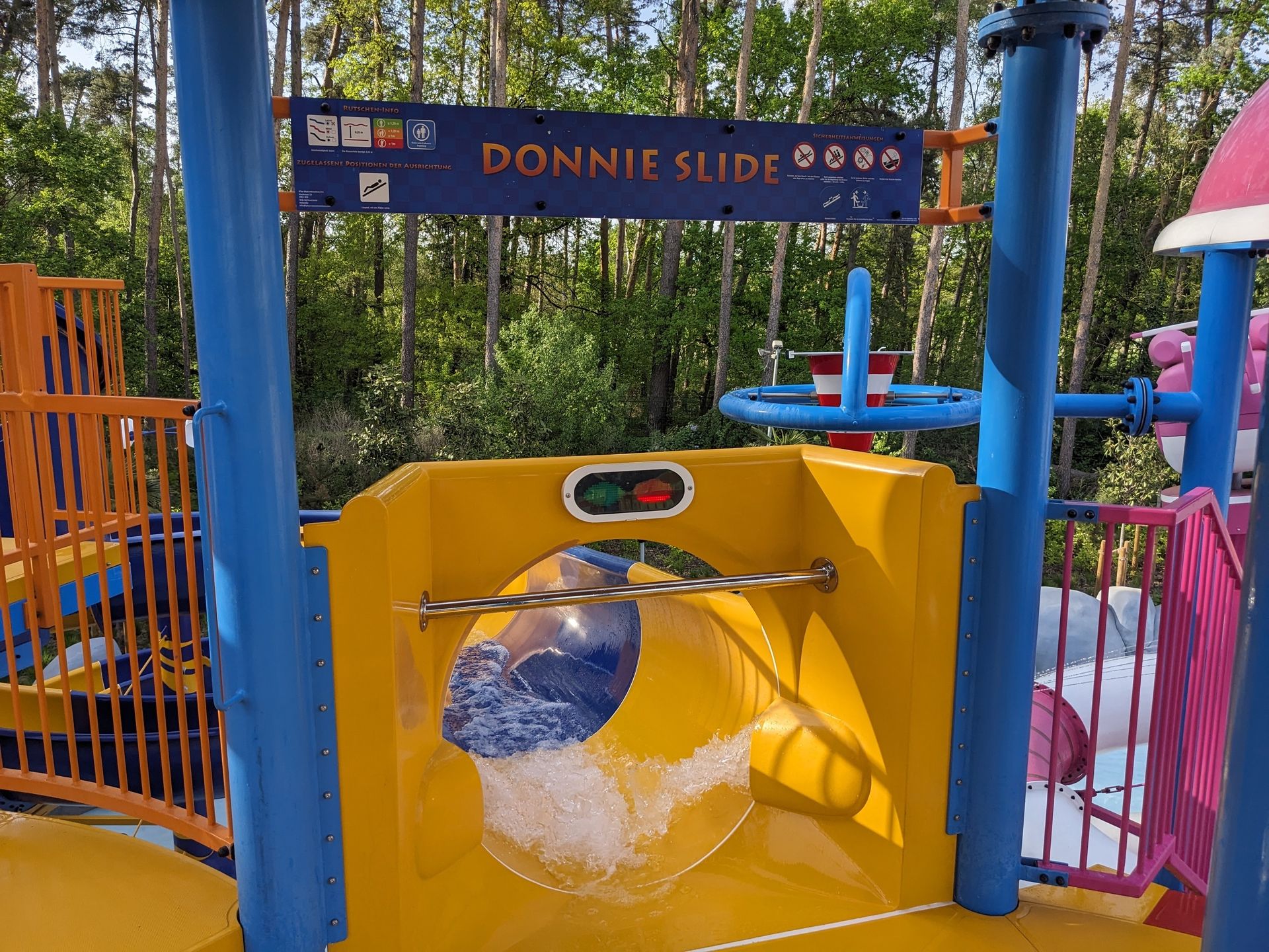 Mit Daylightringen und angenehmen Gefälle kommt hier schon etwas Speedgefühl auf immer im Kreis nach unten bis in den Auslauf. Dieser ist in Zeiten der heutigen sanften Flachwasserausläufe etwas gewöhnungsbedürftig: Denn die Rutsche endet in einer recht hoch gefüllten aber tiefer als die Rutsche liegenden Wanne, so dass das ganze auch etwas von einem Plumpsauslauf hat.
