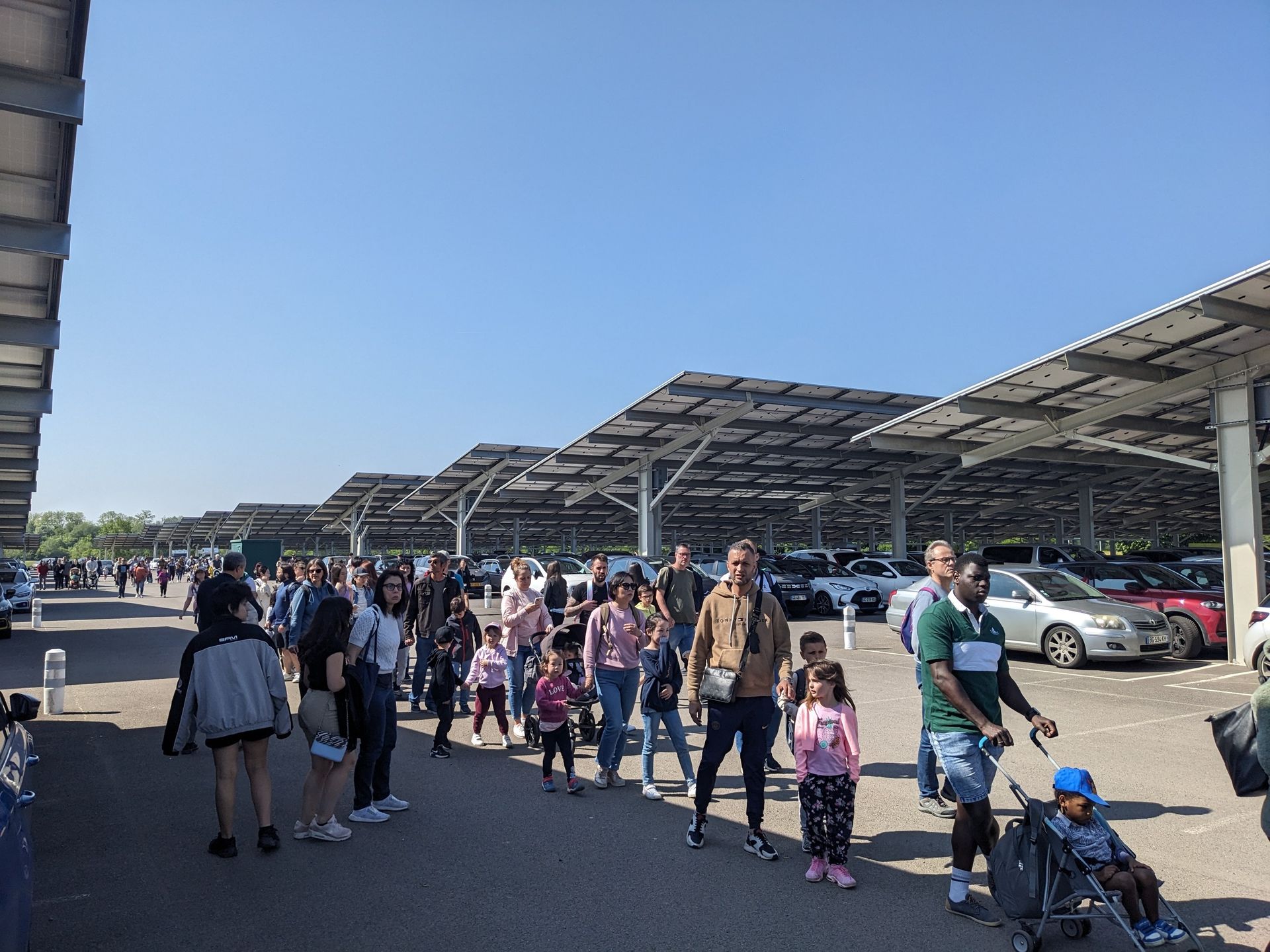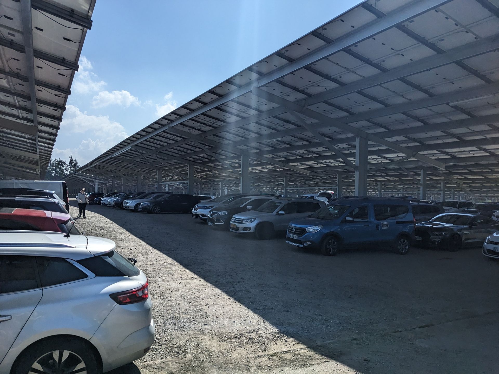 Schön ist aber, dass der Parkplatz inzwischen mit Solaranlagen überdacht ist. Dadurch sind jetzt endlich Parkreihen erkennbar, statt früher nur einem komplett leeren großen Schotterplatz.