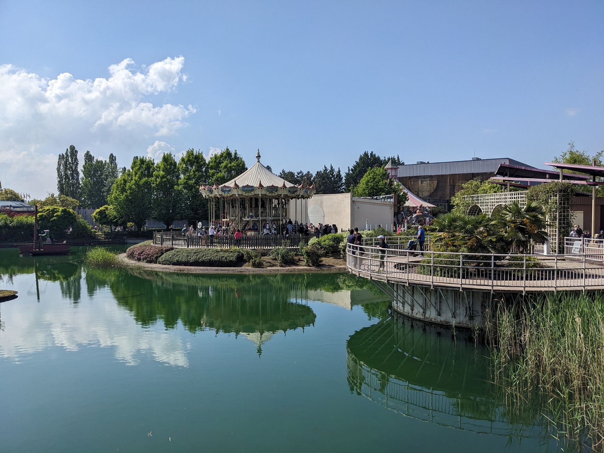 Blick zurück auf das schön gelegene klassische Karussell, vorne rechts das Musikinstrumente-Karussell ist nicht mehr im Park: