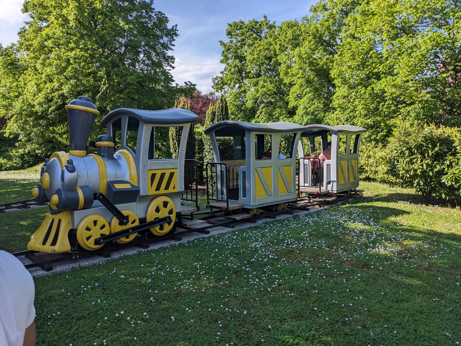 Ein Bimmelbahn für die Kleinen. Das Problem dabei: Die Kleinen dürfen nicht alleine fahren (erst ab 1m), Es darf aber auch maximal eine Begleitperson pro Wagen mitfahren, in der Lok keine. Bedeutet, dass pro Fahrt in der Regel zwei Elternteile und zwei Kinder mitfahren... Super Kapazität!