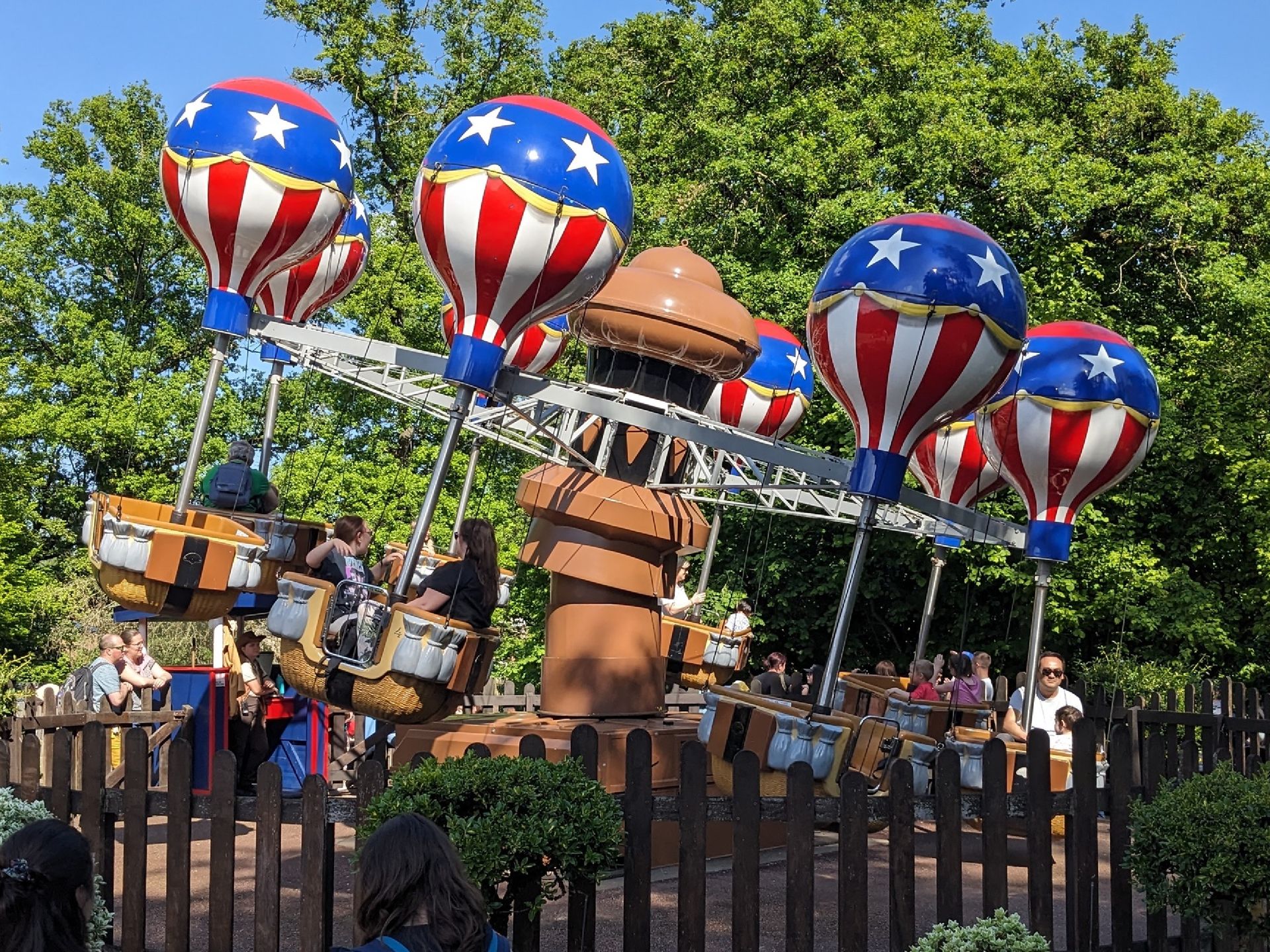 Es folgt eine Kinderecke. Leider wieder mit seltsamen Beladungen: Beim Ballonkarussell durften maximal 4 Erwachsene Begleitpersonen pro Fahrt mitfahren, so dass die anderen 4 Gondeln regelmäßig komplett leer blieben bei über 20 Minuten Wartezeit. 3 dicke 15jährige durften die restlichen Godeln aber füllen...