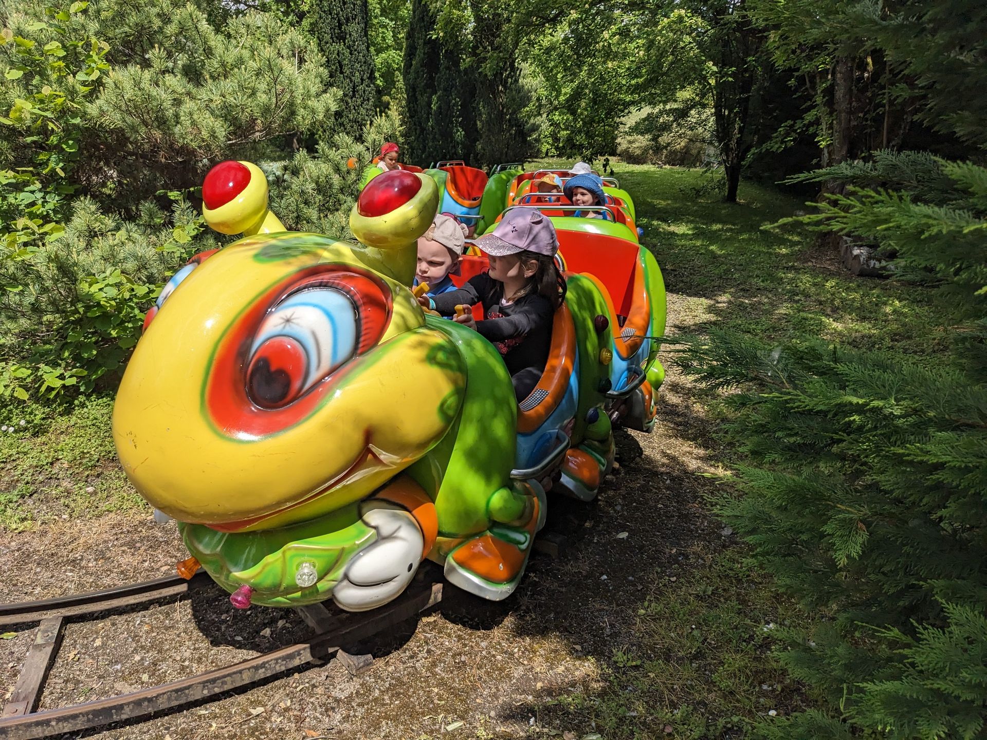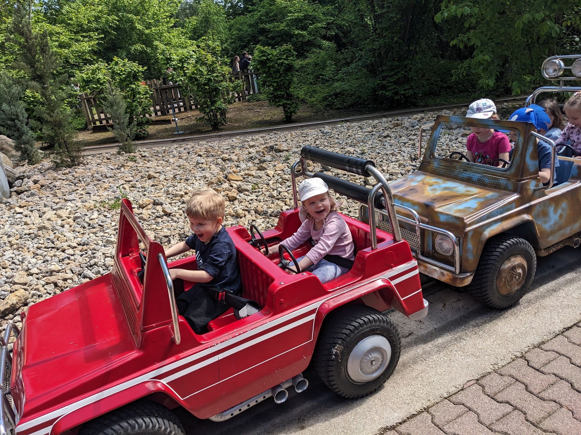 Weiter gehts zu Kindereisenbahn: Und wieder gilt das Gleiche wie bei der anderen Eisenbahn: Meist sind (hier mit einem Wagen mehr) 3 Elternteile mit 3 Kindern an Bord...