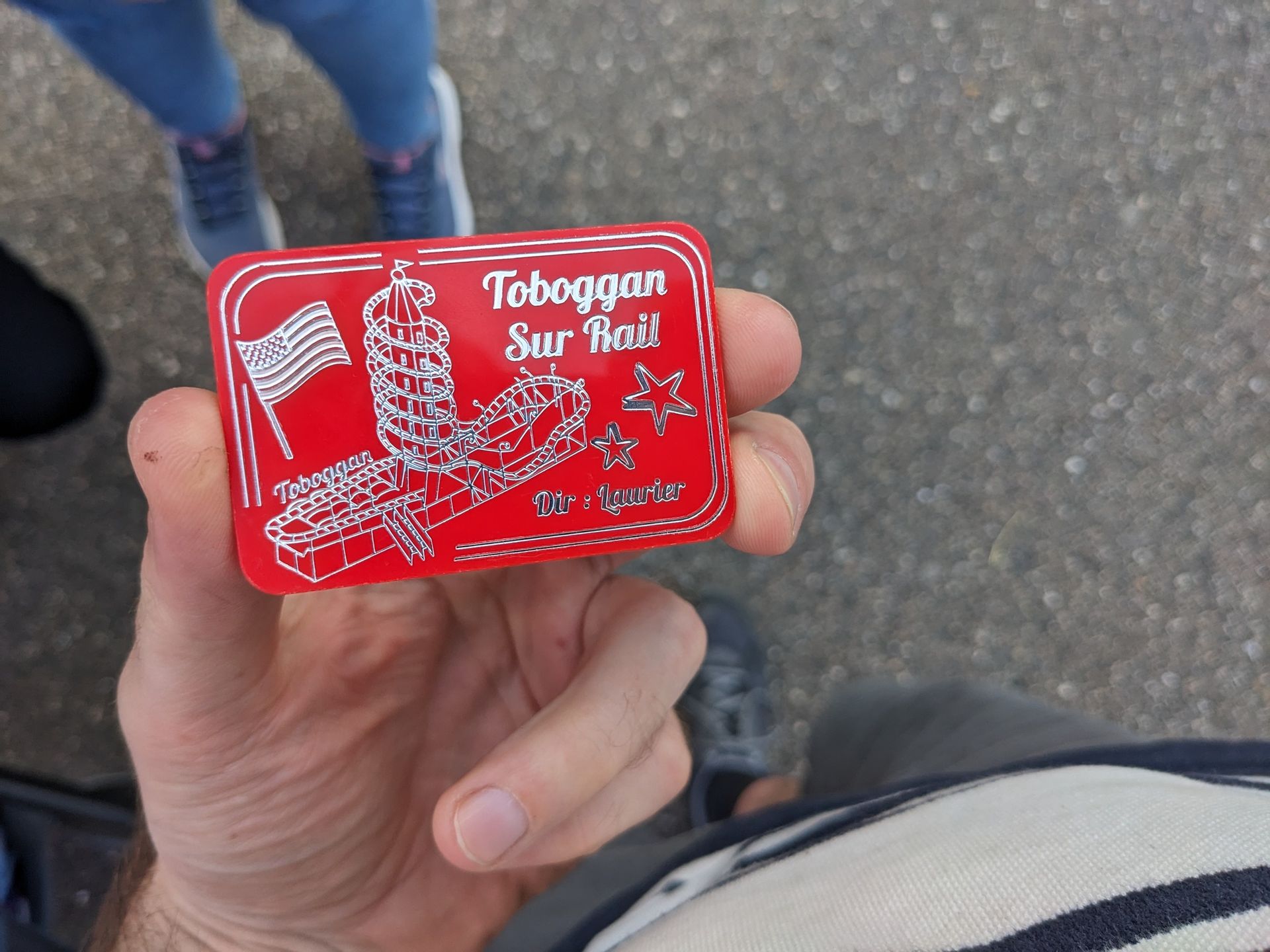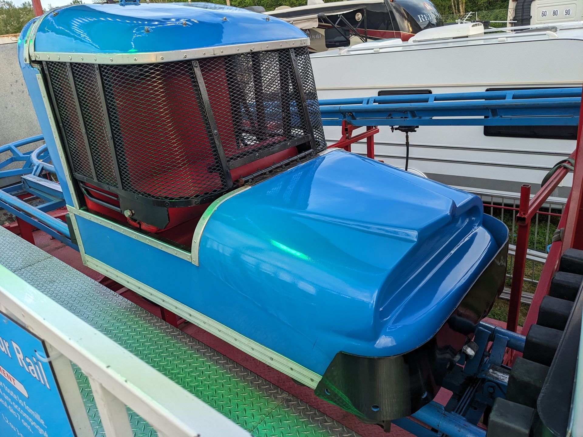 Immer noch vollkommen Banane die Dinger... Man zwängt sich in den kleinen Käfig mit ausgestreckten Beinen vorne unter der Haube. Und dann geht es per Kettenlift im Inneren des Rohres senkrecht nach oben bevor die Achterbahnfahrt beginnt.
