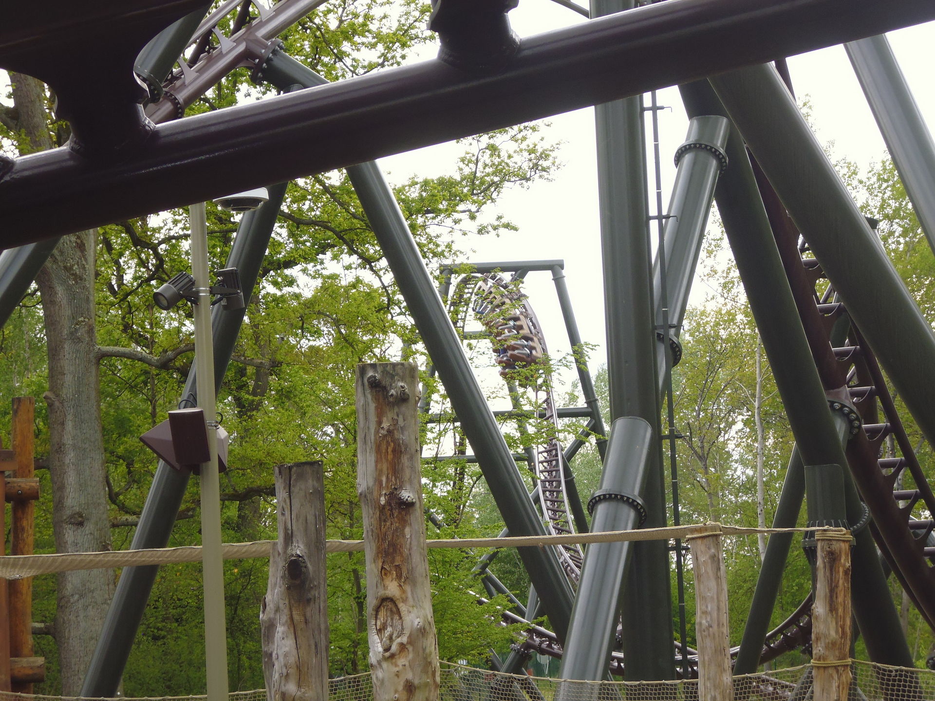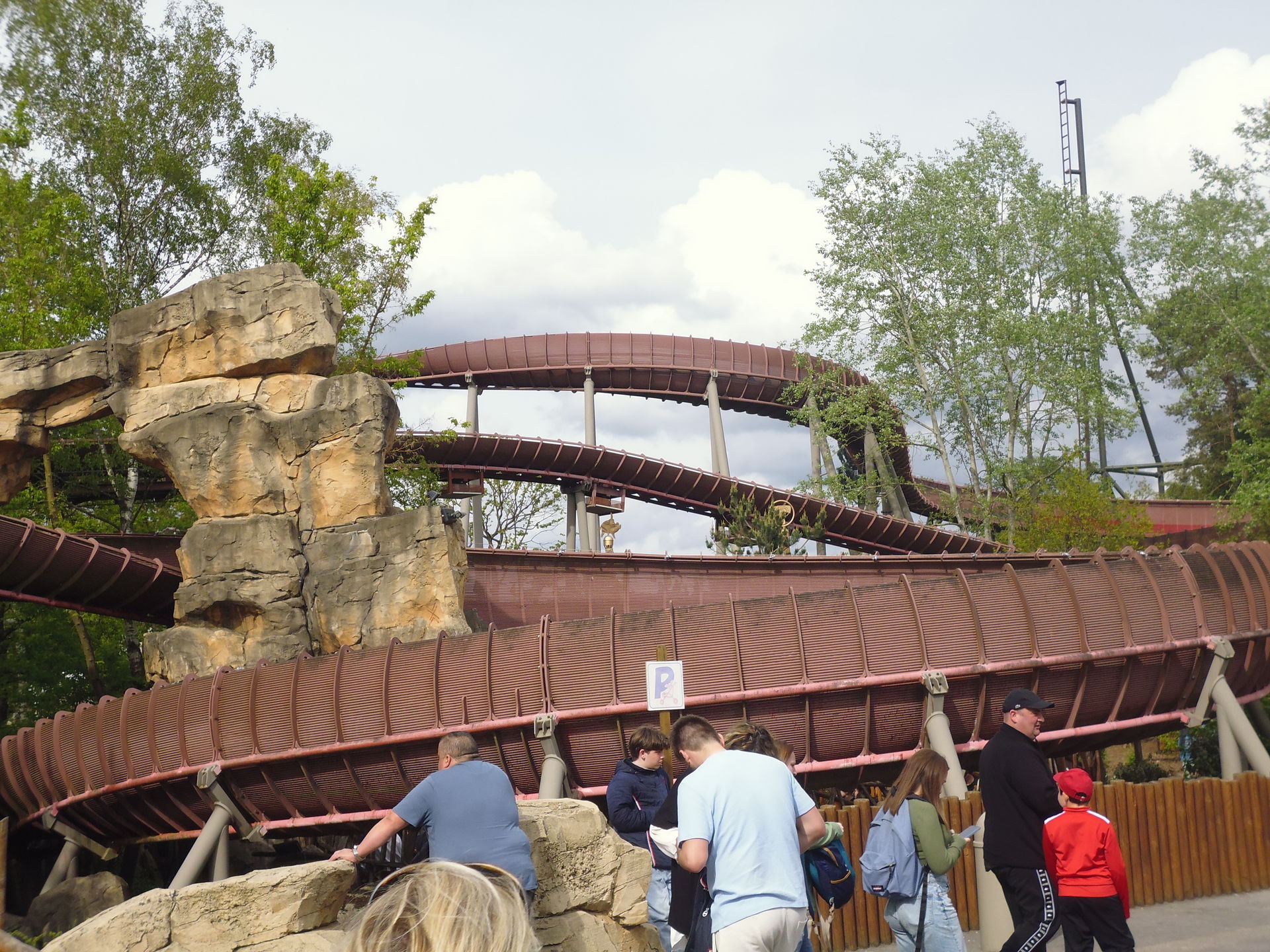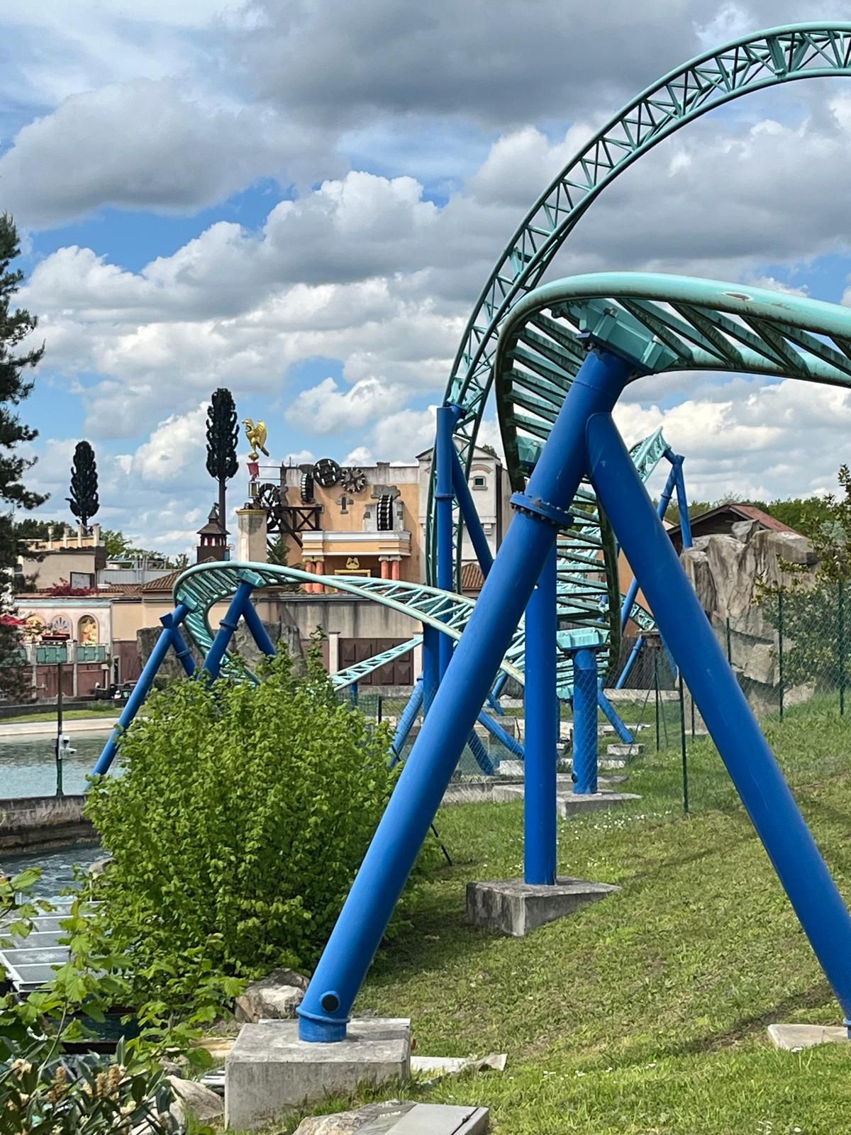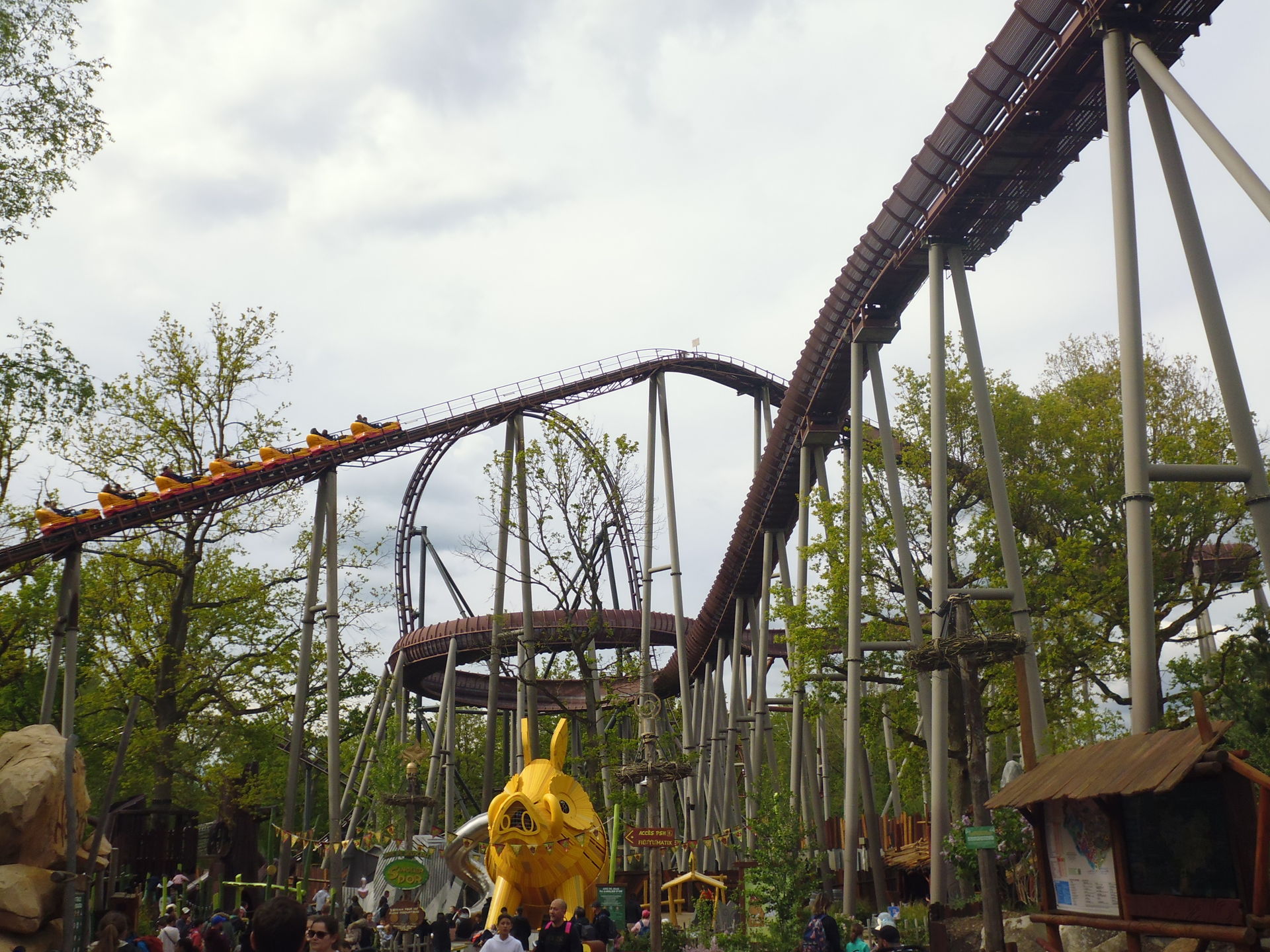 So oder so ist in der Talsohle dann reichlich Schwung für den verborgenen Teil der Bahn angesammelt. Am ehesten könnte man diesen als Parkgast wohl von der Warteschlange für die hoch über dem gesamten neuen Themenbereich verlaufende Bobbahn Trace du Hourra aus fotografisch festhalten; zu einem Fährtchen damit ist es jedoch wegen der durch die Nähe zur Neuheit konstant langen Wartezeit nicht mehr gekommen. Zumal wir die Anlage alle schon kennen und sie mich vor fünf Jahren sogar ein wenig enttäuscht hat, da sich die Bobfahrzeuge im Vergleich zur Erstvisite nicht mehr so krude und airtimig von der Liftkette lösten.