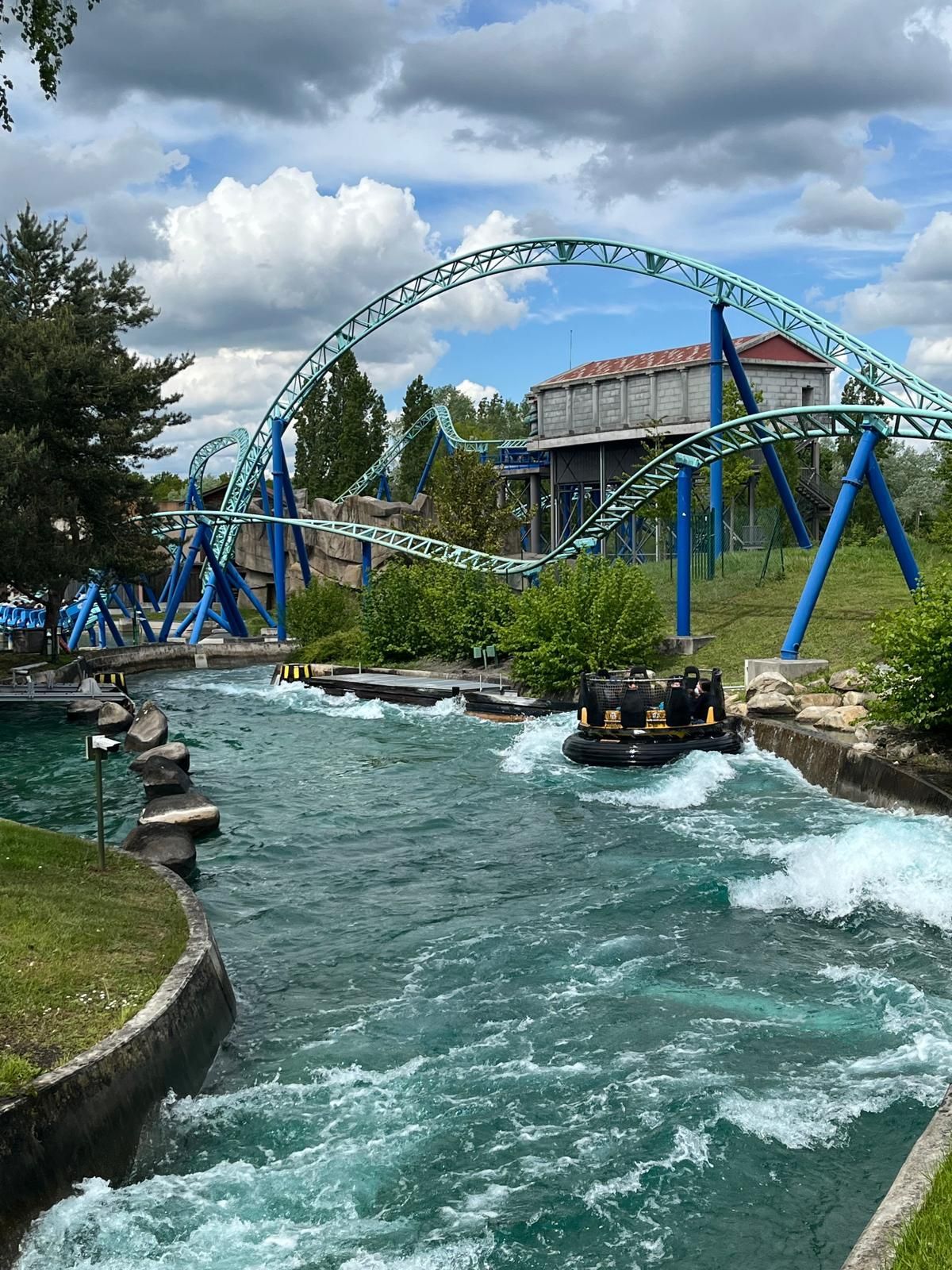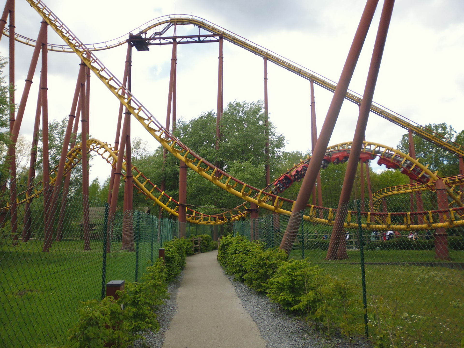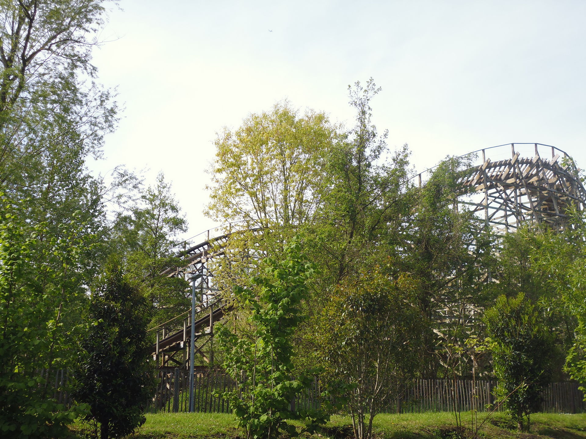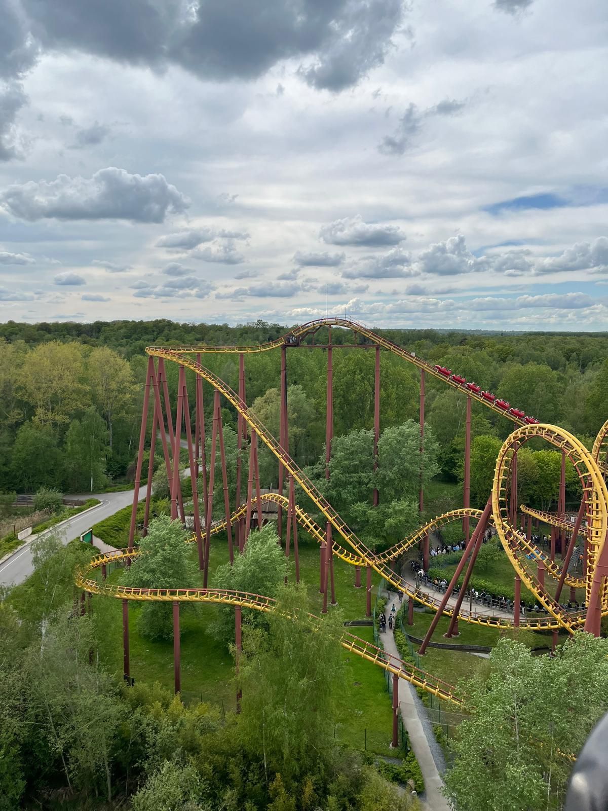 So oder so ist in der Talsohle dann reichlich Schwung für den verborgenen Teil der Bahn angesammelt. Am ehesten könnte man diesen als Parkgast wohl von der Warteschlange für die hoch über dem gesamten neuen Themenbereich verlaufende Bobbahn Trace du Hourra aus fotografisch festhalten; zu einem Fährtchen damit ist es jedoch wegen der durch die Nähe zur Neuheit konstant langen Wartezeit nicht mehr gekommen. Zumal wir die Anlage alle schon kennen und sie mich vor fünf Jahren sogar ein wenig enttäuscht hat, da sich die Bobfahrzeuge im Vergleich zur Erstvisite nicht mehr so krude und airtimig von der Liftkette lösten.