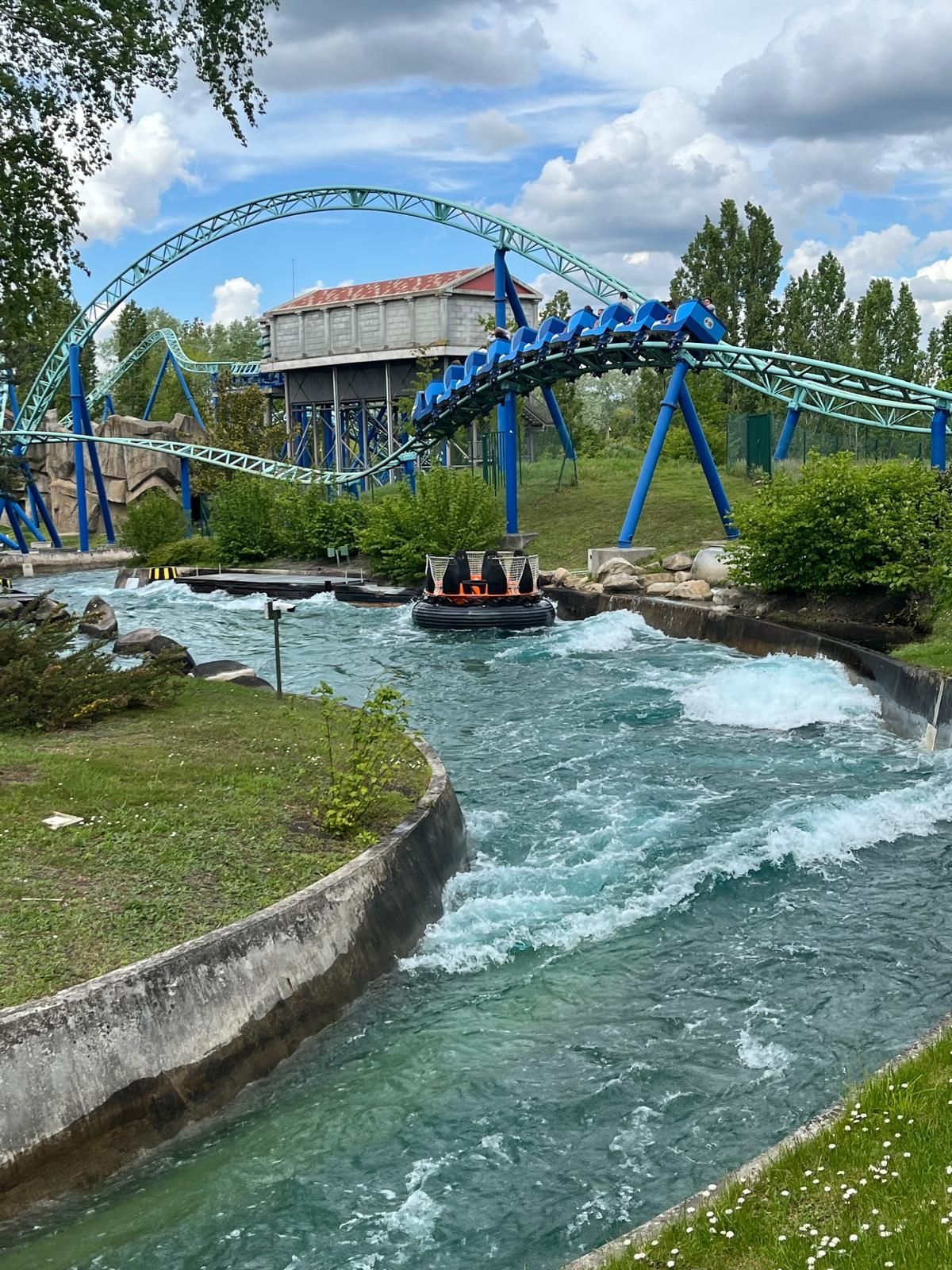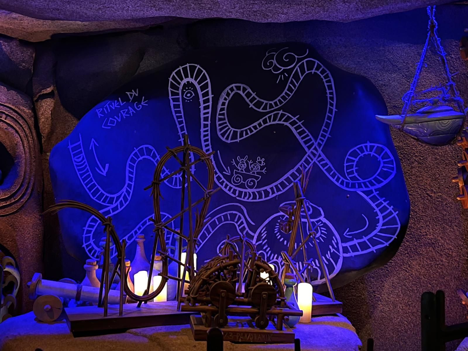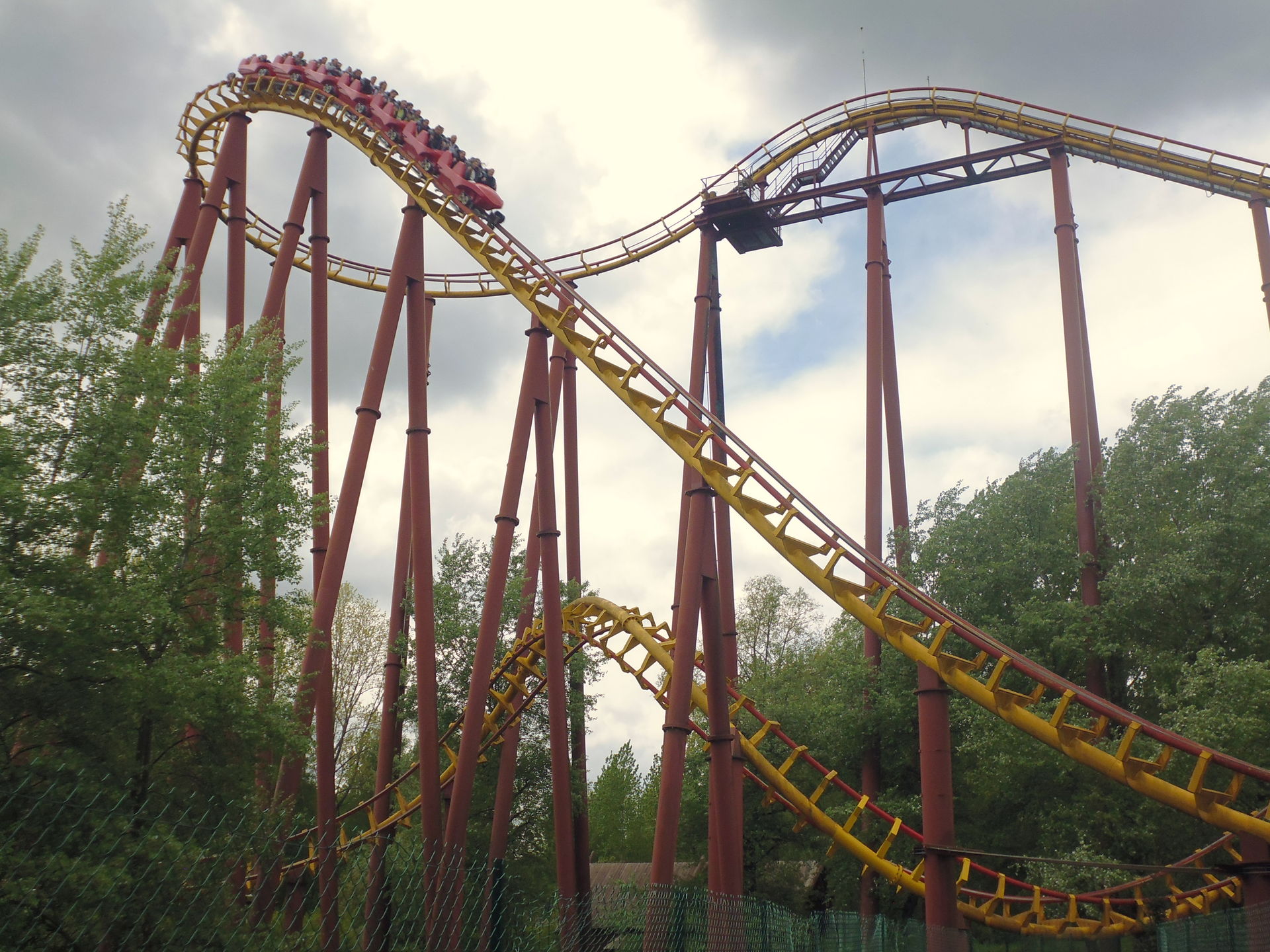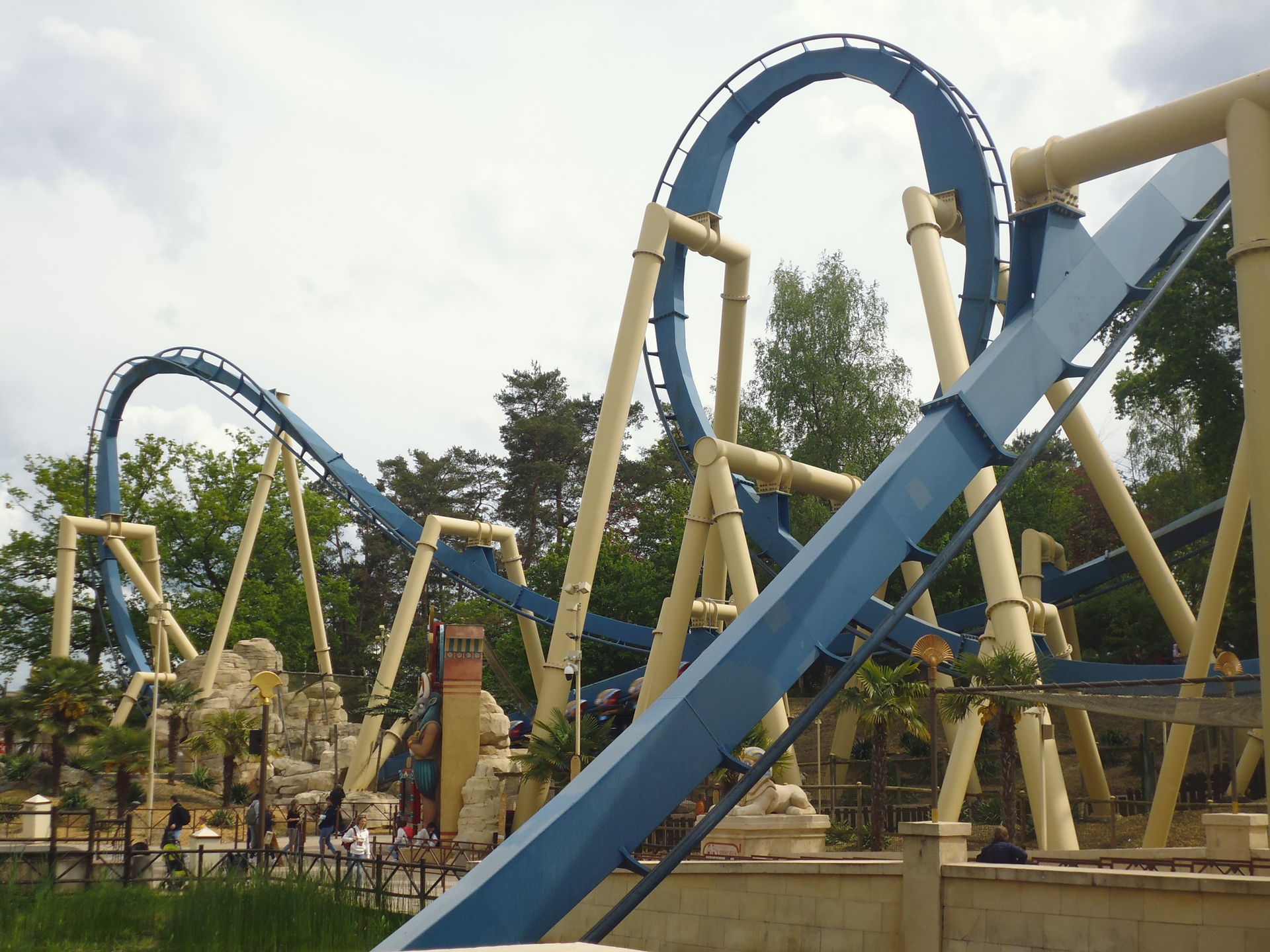 So oder so ist in der Talsohle dann reichlich Schwung für den verborgenen Teil der Bahn angesammelt. Am ehesten könnte man diesen als Parkgast wohl von der Warteschlange für die hoch über dem gesamten neuen Themenbereich verlaufende Bobbahn Trace du Hourra aus fotografisch festhalten; zu einem Fährtchen damit ist es jedoch wegen der durch die Nähe zur Neuheit konstant langen Wartezeit nicht mehr gekommen. Zumal wir die Anlage alle schon kennen und sie mich vor fünf Jahren sogar ein wenig enttäuscht hat, da sich die Bobfahrzeuge im Vergleich zur Erstvisite nicht mehr so krude und airtimig von der Liftkette lösten.