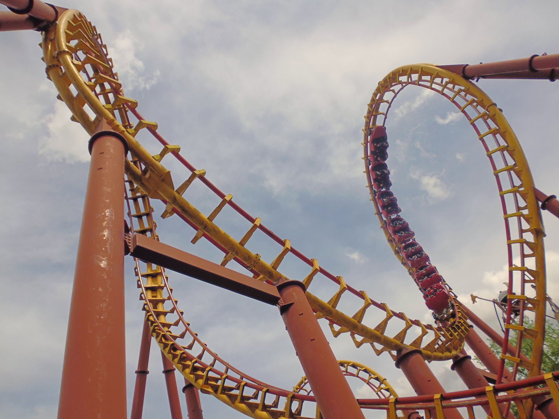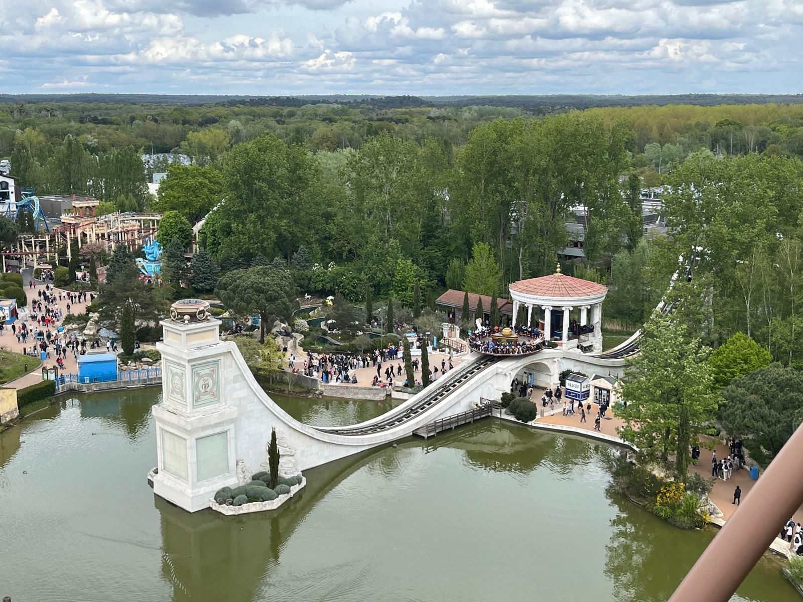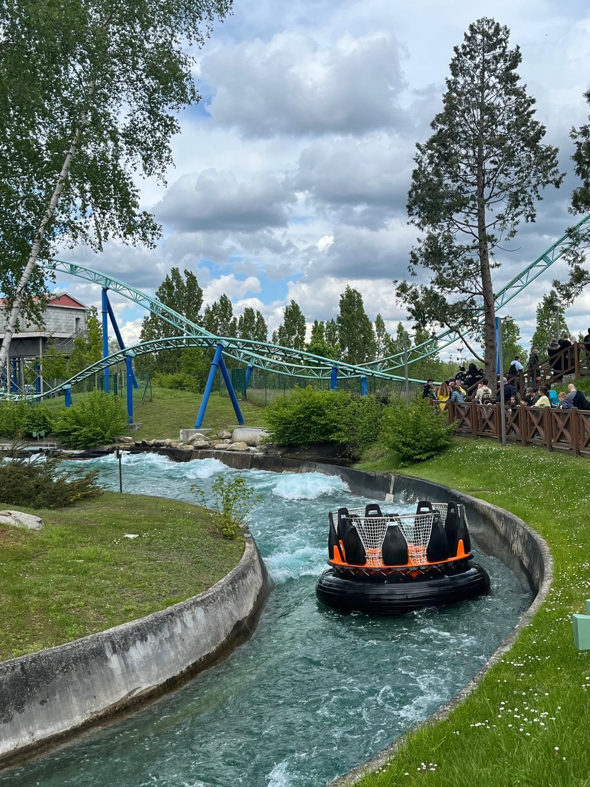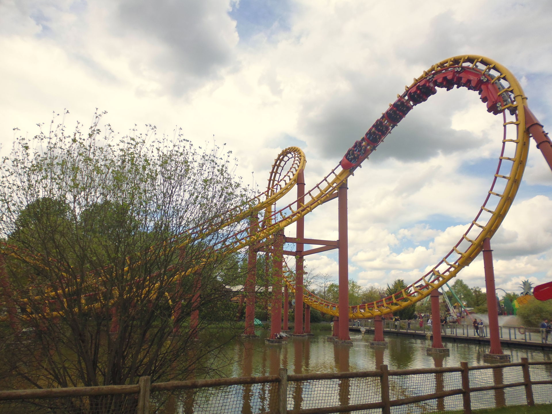 So oder so ist in der Talsohle dann reichlich Schwung für den verborgenen Teil der Bahn angesammelt. Am ehesten könnte man diesen als Parkgast wohl von der Warteschlange für die hoch über dem gesamten neuen Themenbereich verlaufende Bobbahn Trace du Hourra aus fotografisch festhalten; zu einem Fährtchen damit ist es jedoch wegen der durch die Nähe zur Neuheit konstant langen Wartezeit nicht mehr gekommen. Zumal wir die Anlage alle schon kennen und sie mich vor fünf Jahren sogar ein wenig enttäuscht hat, da sich die Bobfahrzeuge im Vergleich zur Erstvisite nicht mehr so krude und airtimig von der Liftkette lösten.