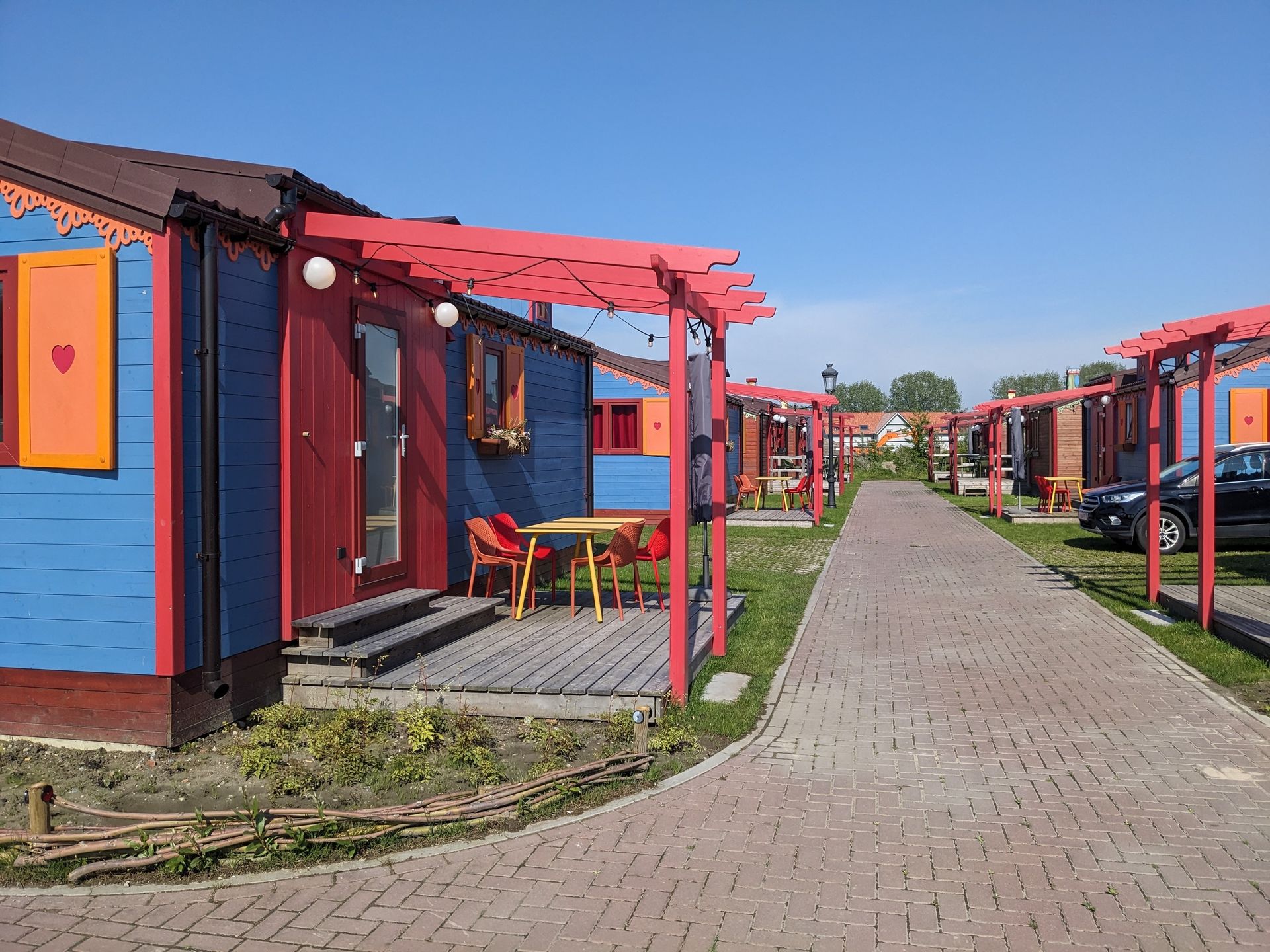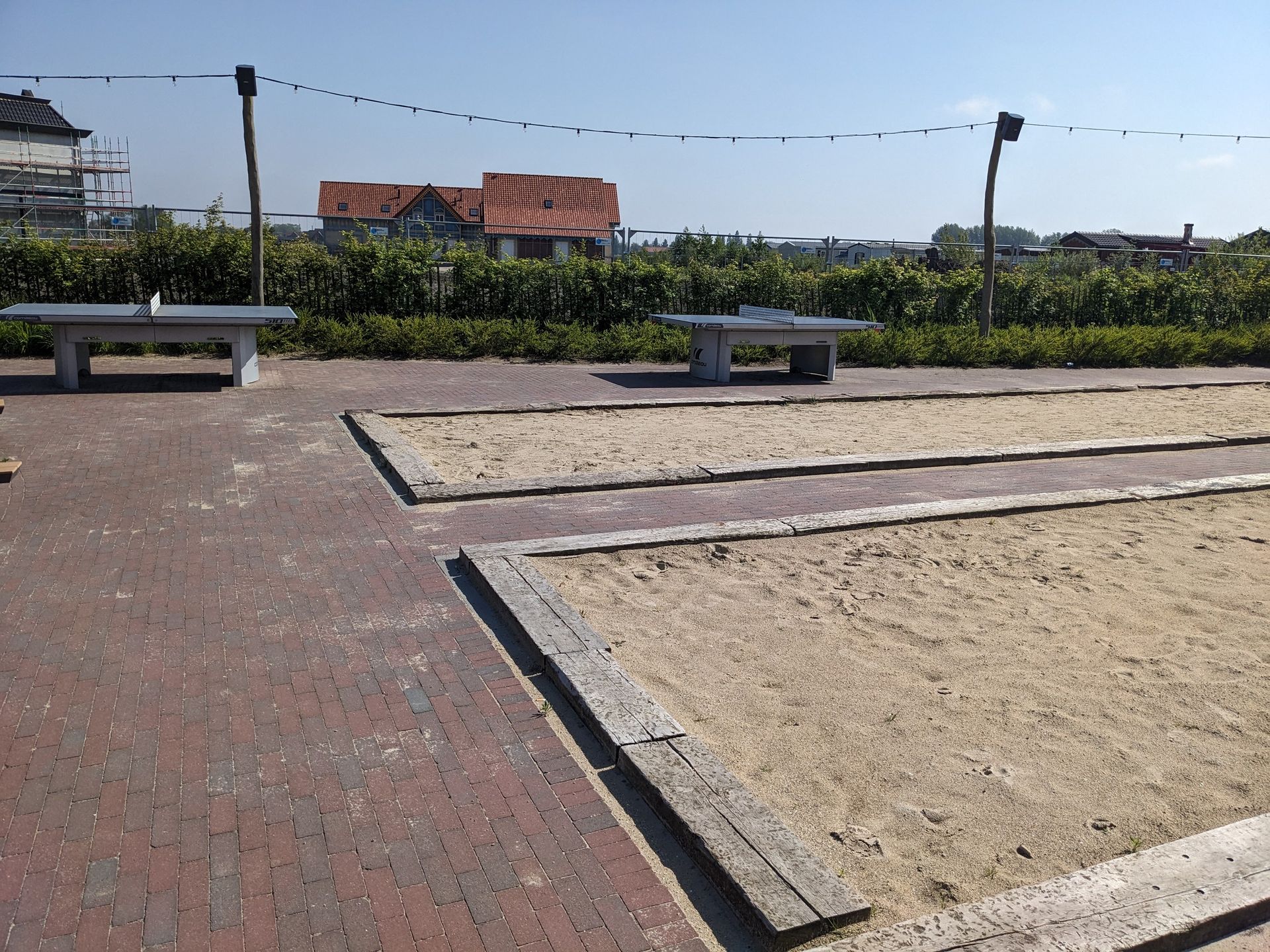 Der rechte Platzteil besteht weitgehend noch aus Dauercampern. Offenbar hat man erstmal den Betrieb fortgesetzt und ersetzt nun nach Bedarf die Dauercamper durch feste Hütten, die vermietet werden. Bisher sind das, meine ich, drei Reihen vom Mittelweg Richtung Baustelle: