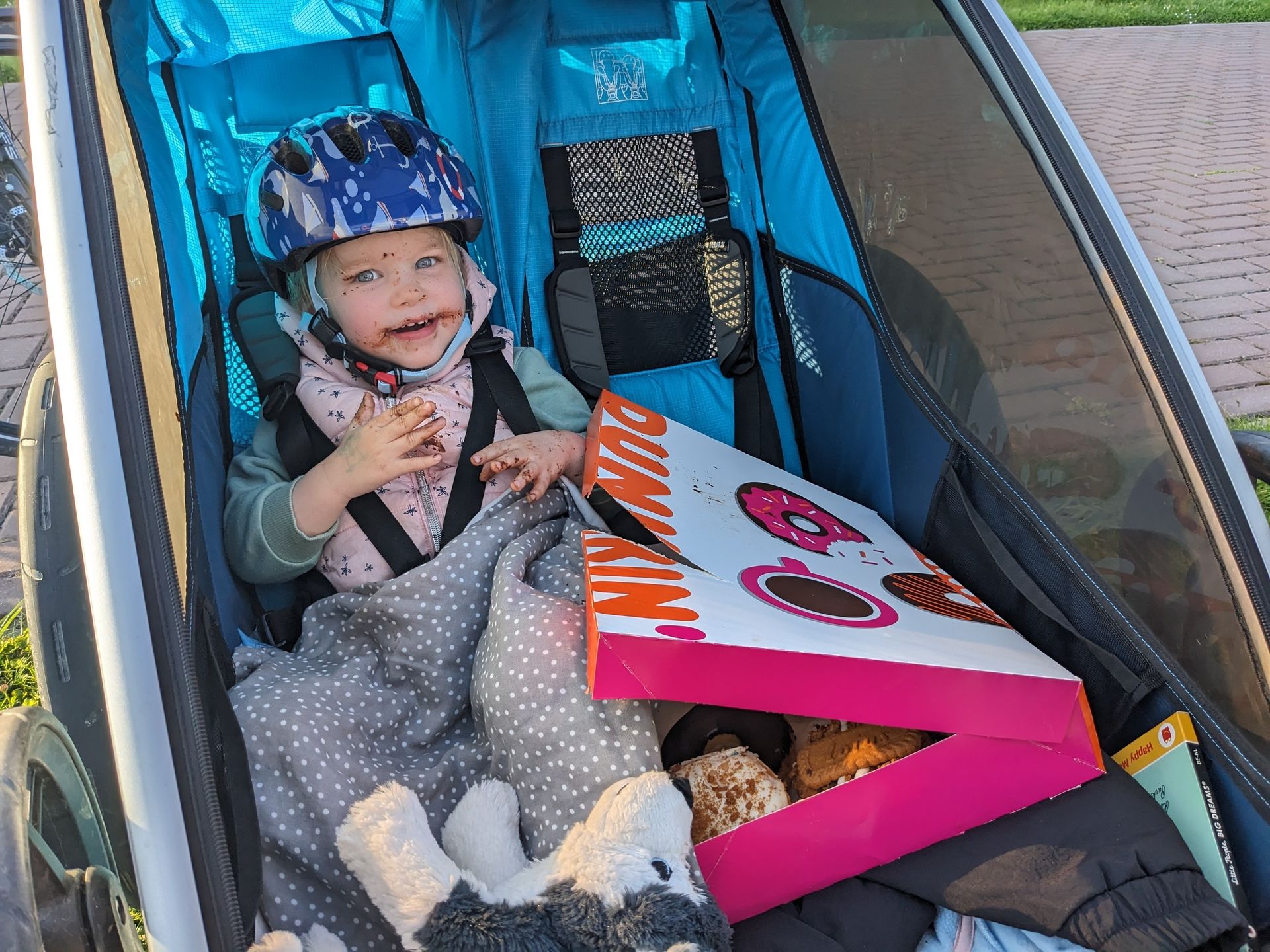 In Ostende haben wir uns noch ein paar Donats geholt und sind wieder zurückgefahren. Während der Straßenbahnfahrt ist Marie eingeschlafen. Für die kurze Strecke mit dem Fahrrad haben wir den Karton dann in den Anhänger neben das schlafende Kind gestellt. War ein Fehler, wie sich herausstellte, als wir auf dem Camping ankamen: