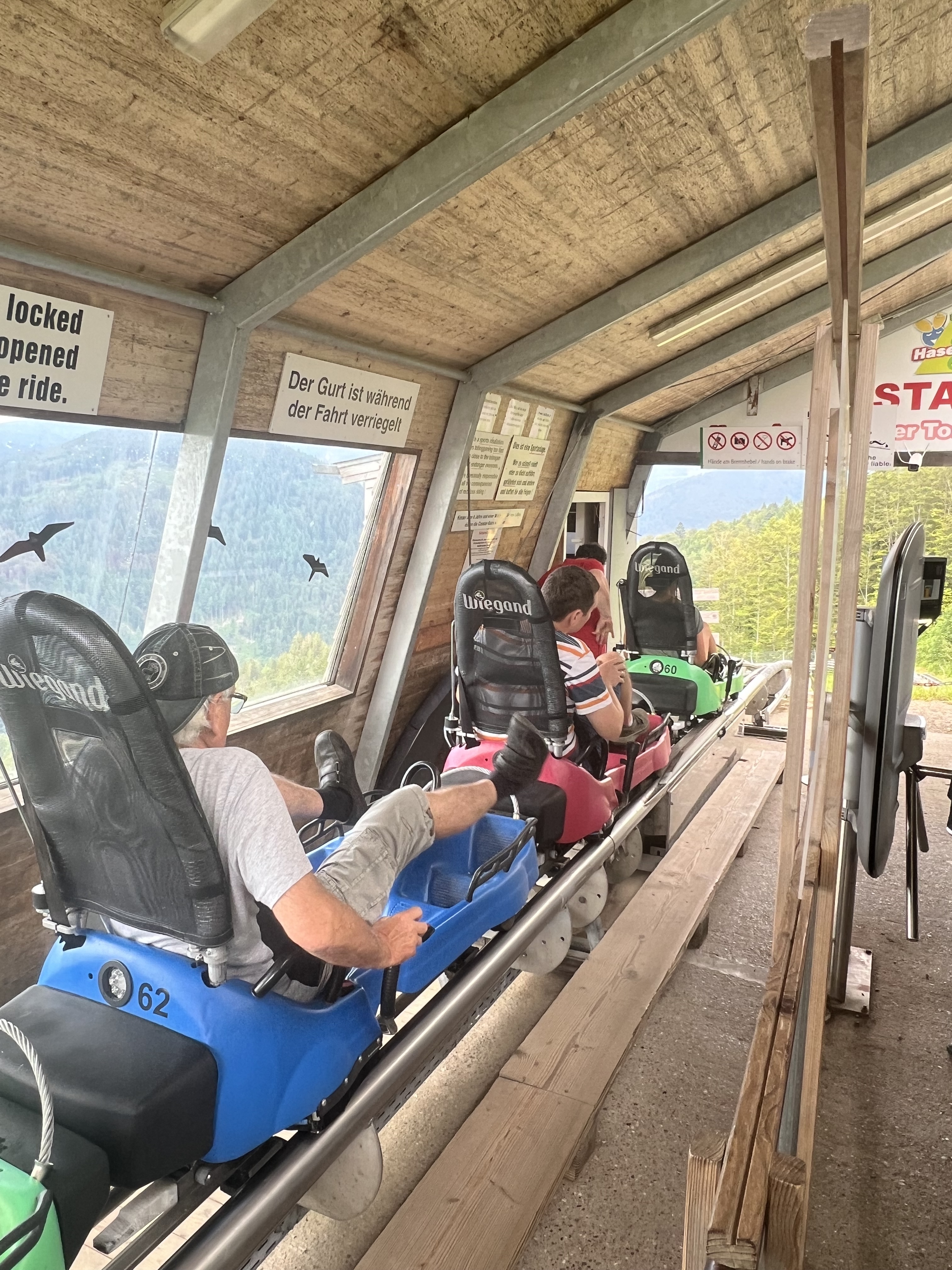 Schon bei der Auffahrt konnte man sehen, wieviele Schlitten im Schneckentempo fuhren oder gar auf der Strecke hielten, weil es doch arg viele Bremserfahrer*innen gab. Trug nicht gerade zu Thomas Laune bei. Aus der Seilbahn gingen dann von ihm ich auch einige Rufe zu den talwärts schleichenden Fahrer*innen hinunter.