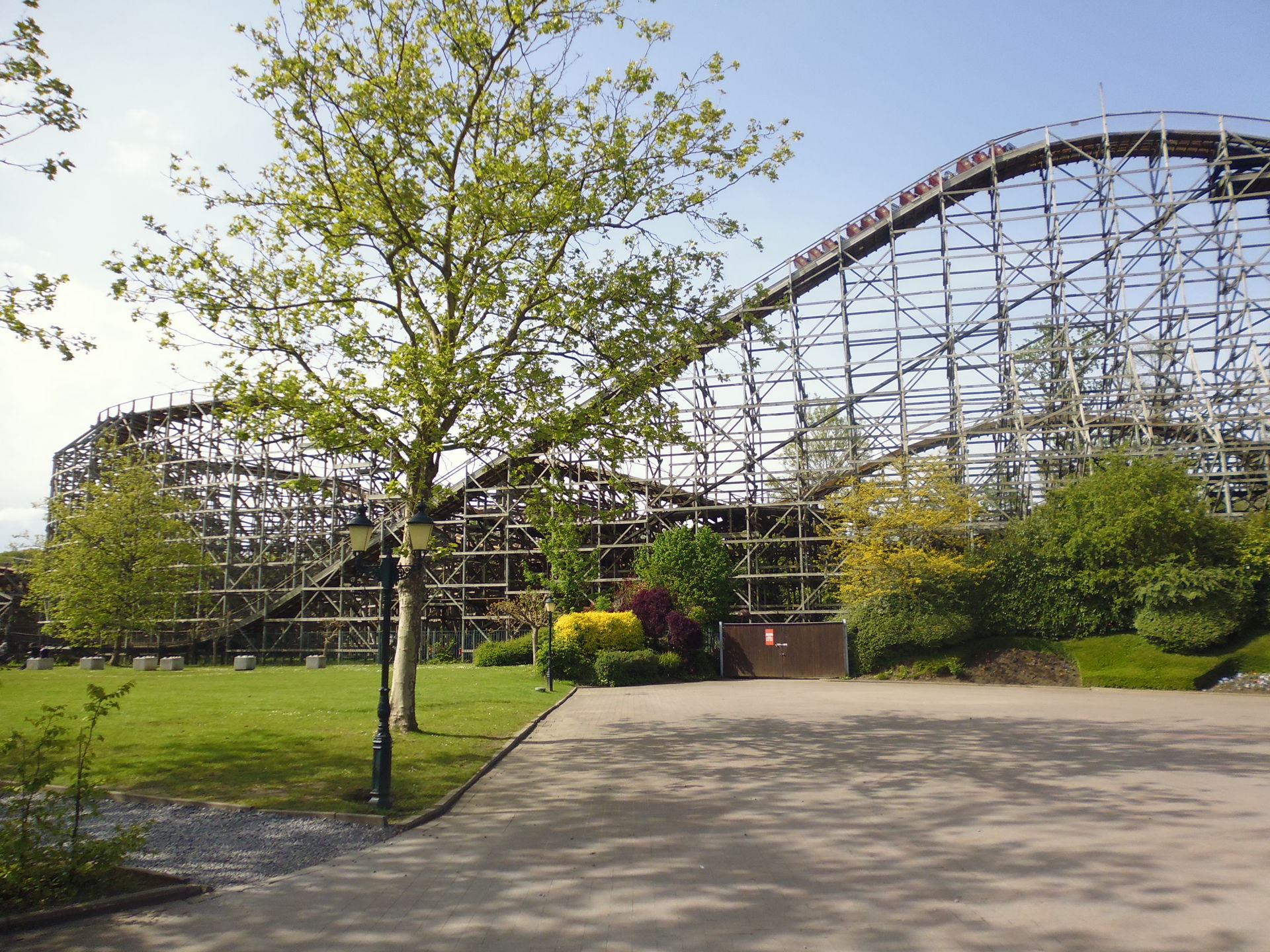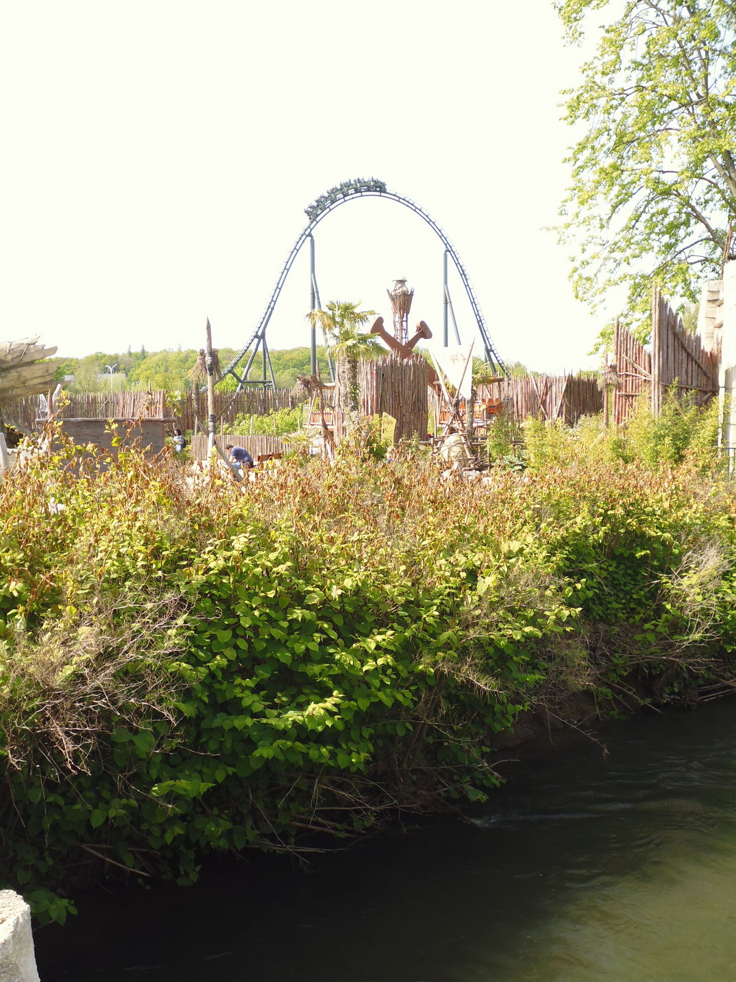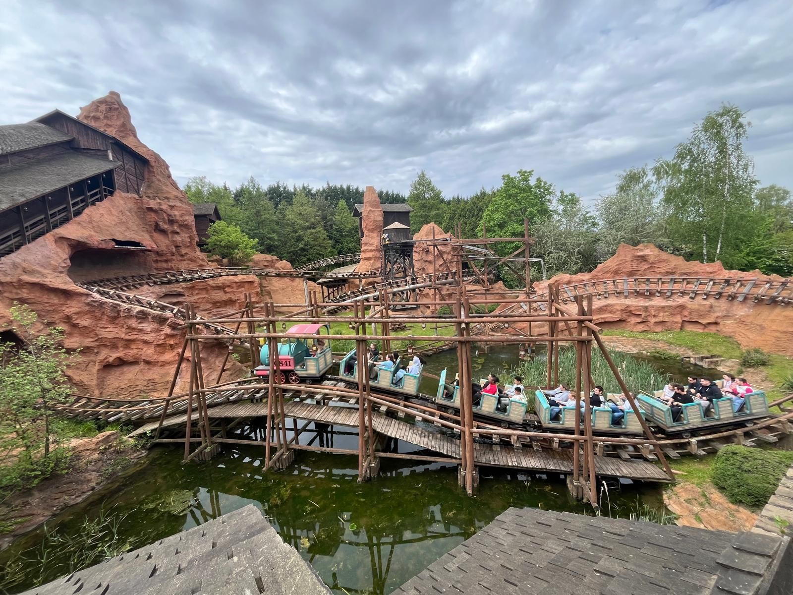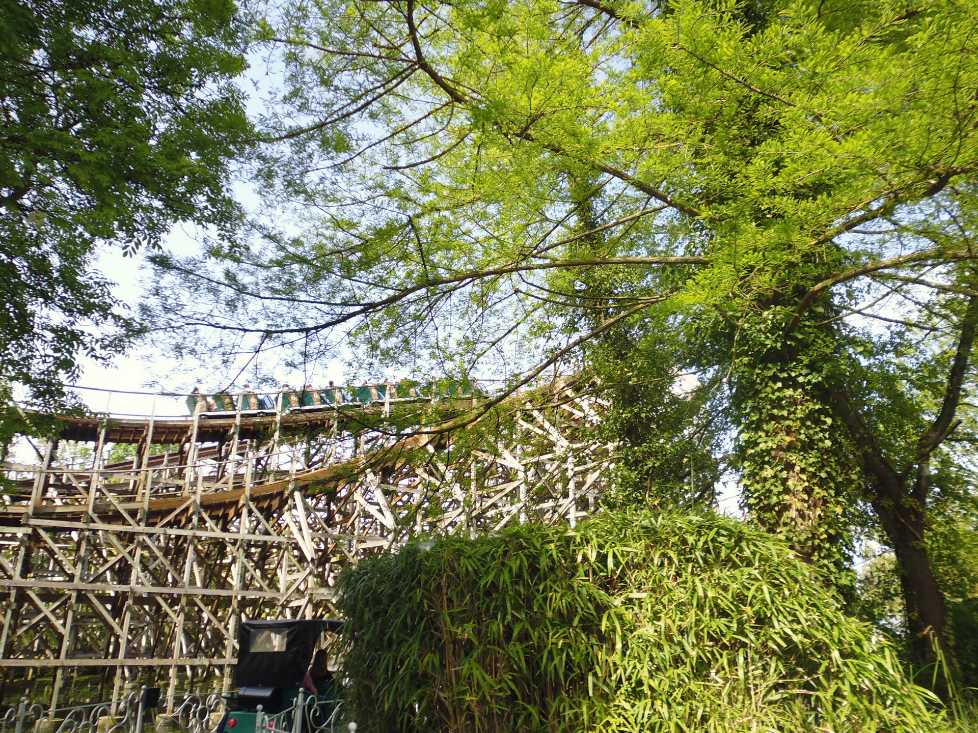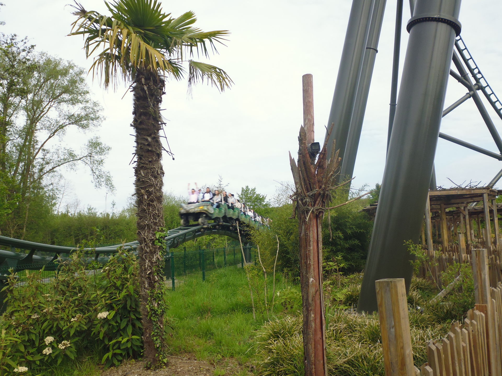 Zwischenzeitlich waren wir wieder beim Durchgangspunkt nach der Mainstreet des Parks angelangt, und statteten der von hier gesehen linken der beiden Fabelwesen-Bahnen des Parks, dem Vekoma-Woodie Loup-Garou, einen Besuch ab.