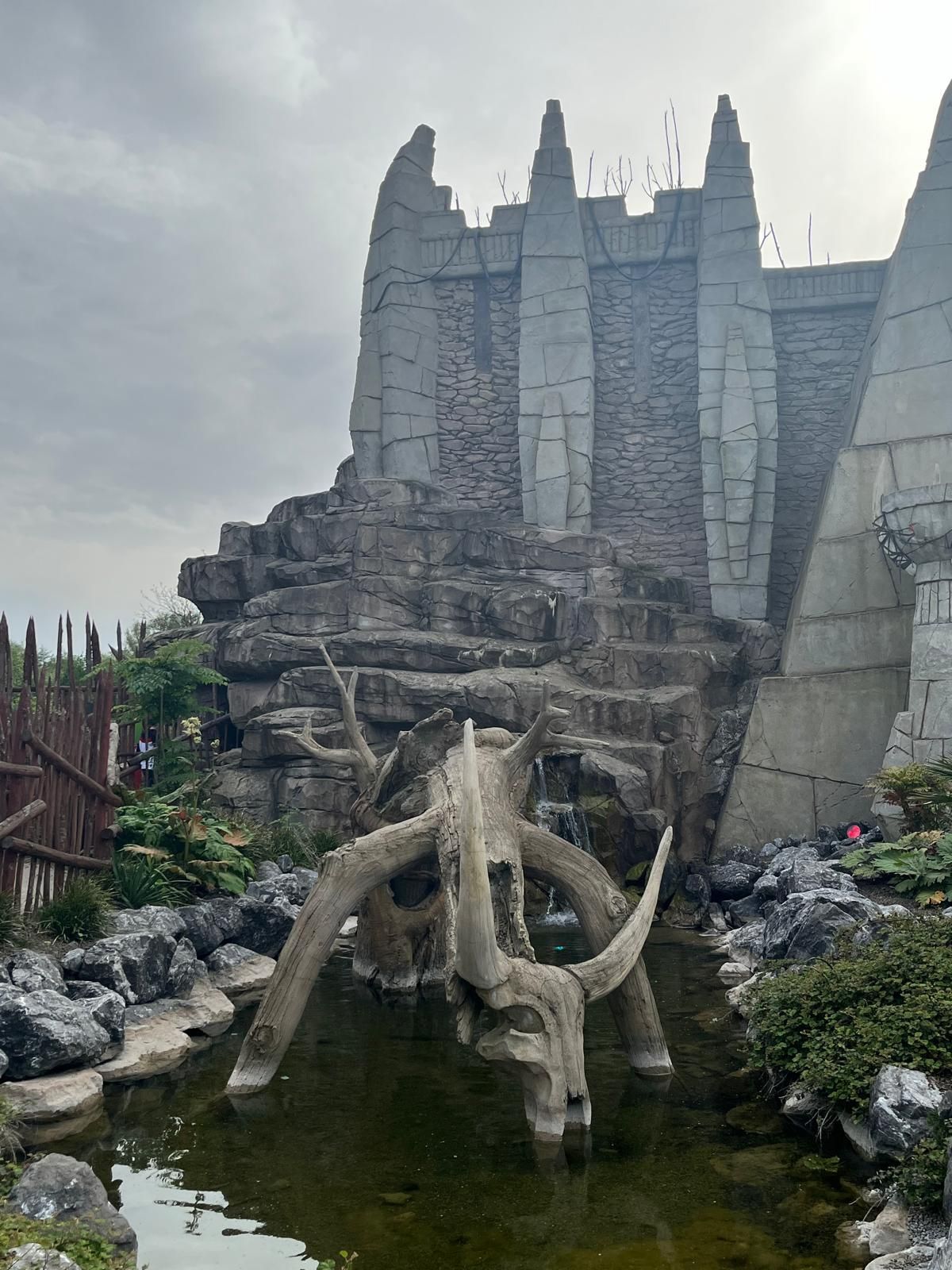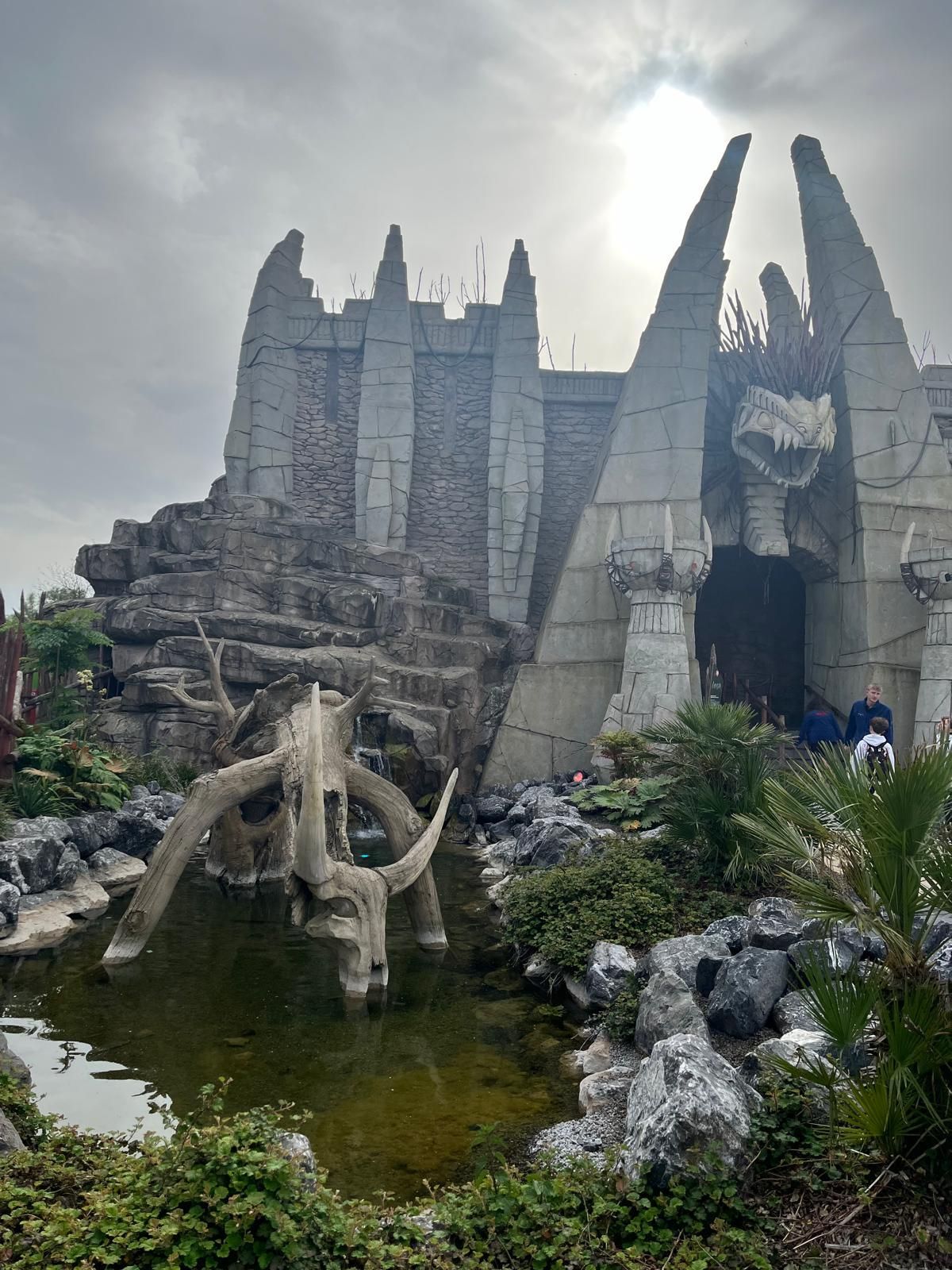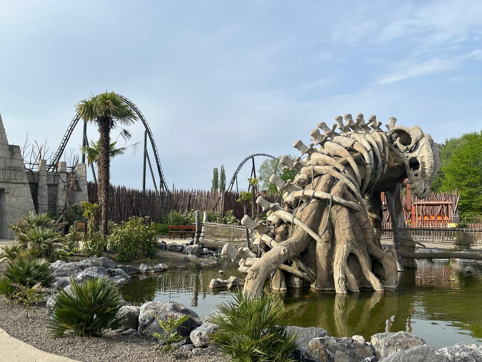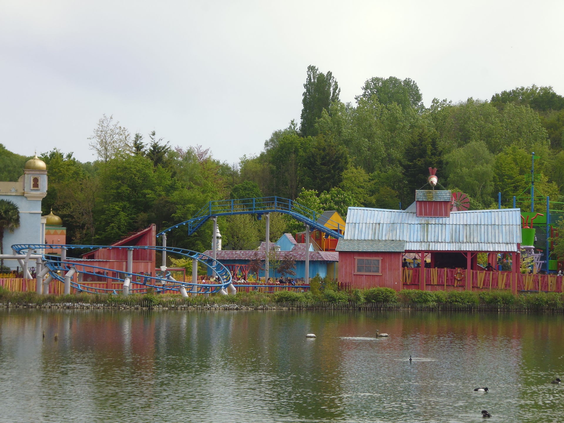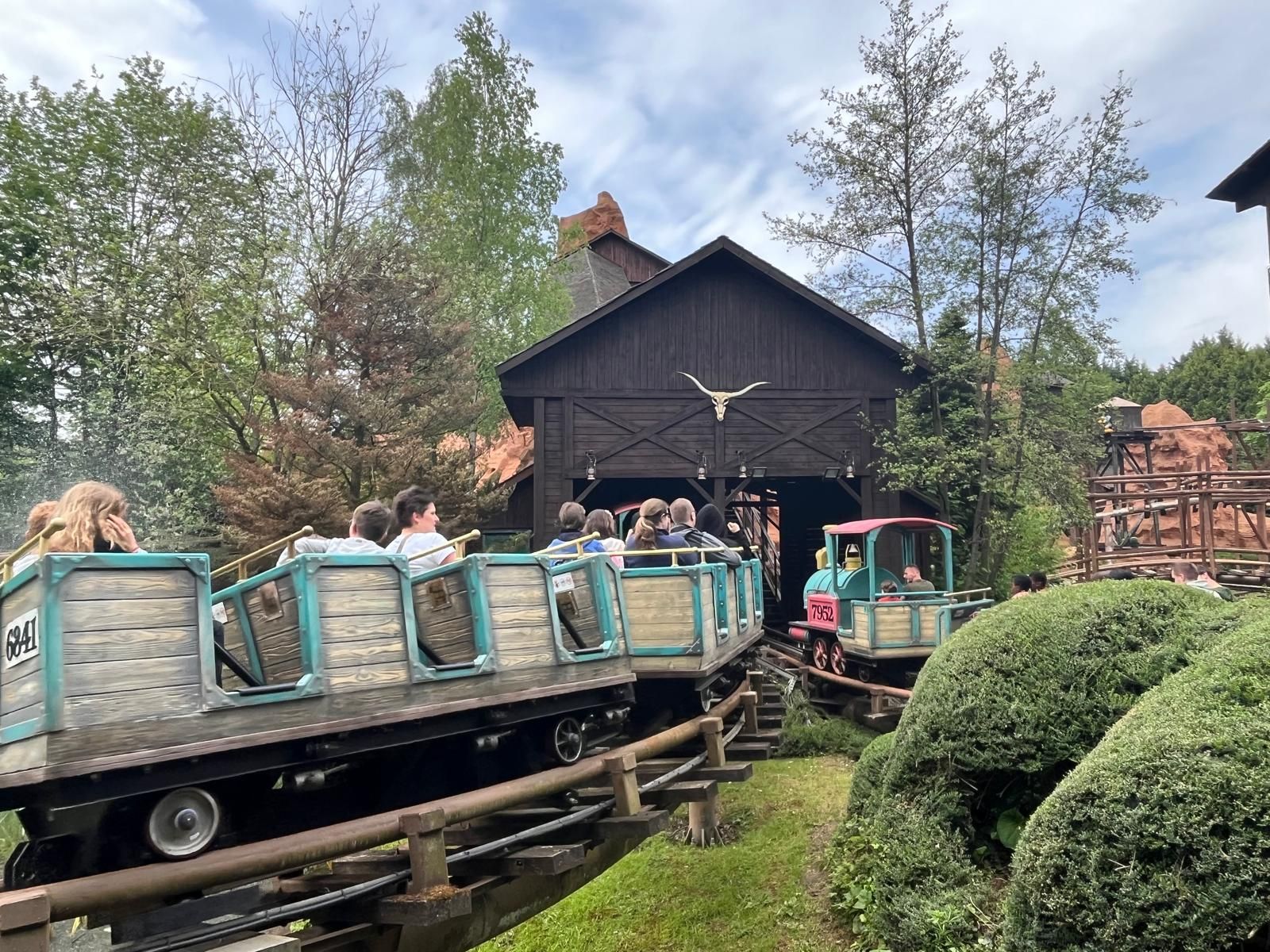 Zwischenzeitlich waren wir wieder beim Durchgangspunkt nach der Mainstreet des Parks angelangt, und statteten der von hier gesehen linken der beiden Fabelwesen-Bahnen des Parks, dem Vekoma-Woodie Loup-Garou, einen Besuch ab.