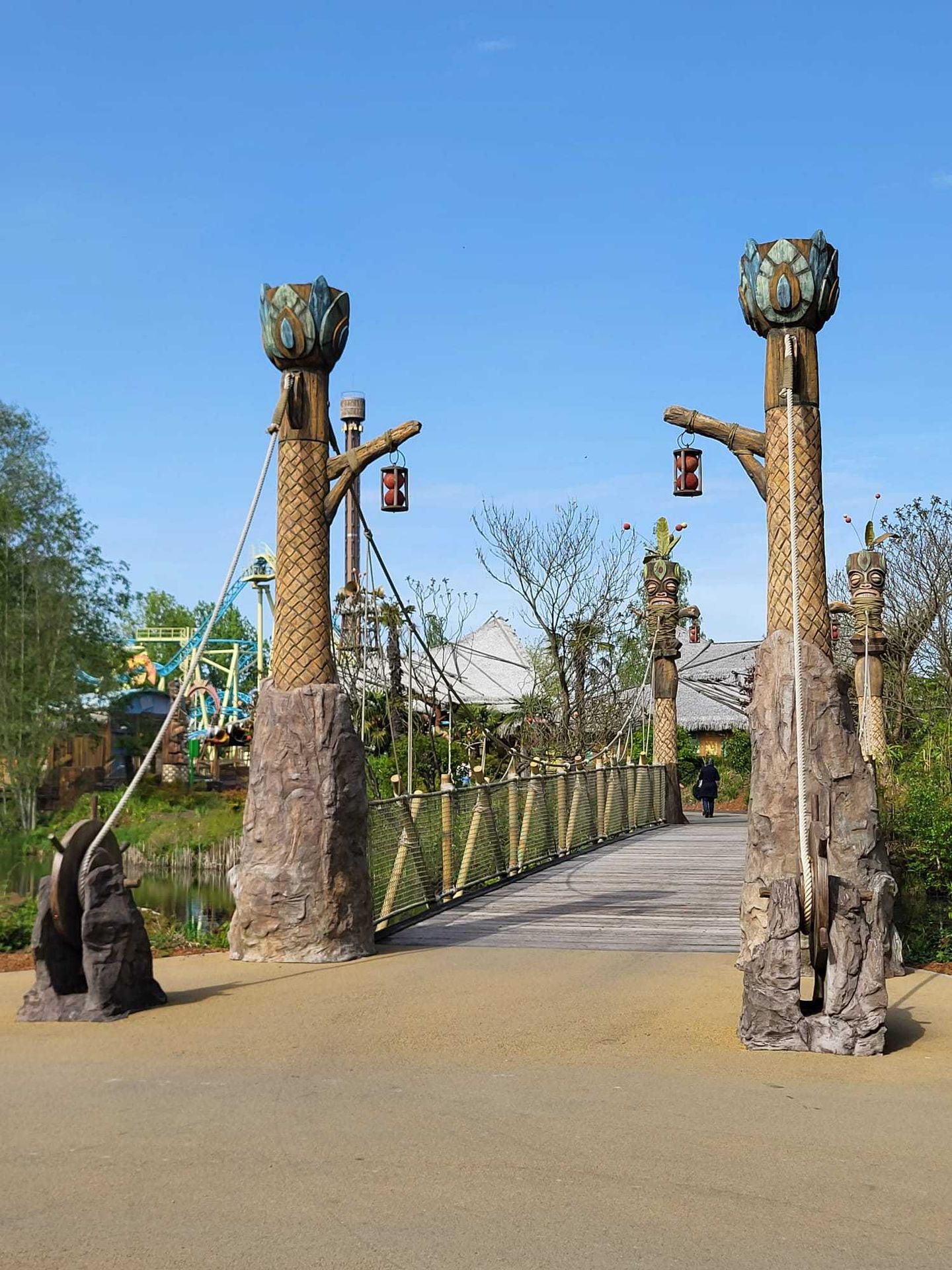 Aber von all dem ist heute freilich nichts mehr zu merken - hocherfreut erreichten wir alsbald den opulent gestalteten Vorplatz der Bahn, wo das beim Erstbesuch kennengelernte Dschungel-Thema rund um die damalige Neuheit Tiki-Waka trotz Brückenquerung über die unglückselige Dyle nahtlos fortgesetzt wird. Linguistische und philosophische Side Note: Bin ich ein böser Mensch, dass ich es zum Brüllen komisch finde, in den zwecks Vermeidung von Wortwiederholungen konsultierten Synonymen zu «Unglück» ausgerechnet das nur wenige Kilometer entfernte Waterloo als Begriff anzutreffen?