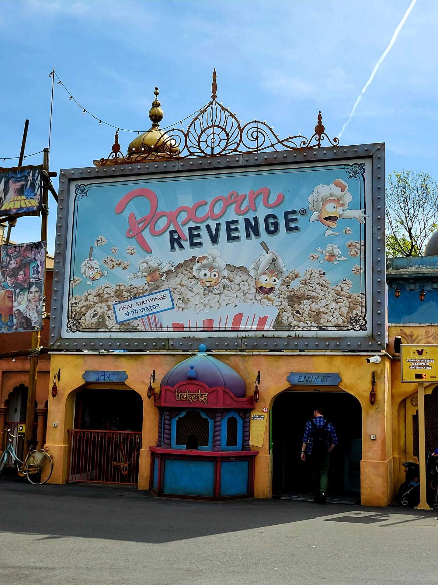 Zum guten Glück war hier durchgehen angesagt. Die gesamte Attraktion ist im Grunde als Bollywood-Kino gestaltet, mit zahlreichen Requisiten und Filmplakaten, deren Titel alle auf schrullige Weise Bezug auf den namensgebenden Puffmais nehmen.