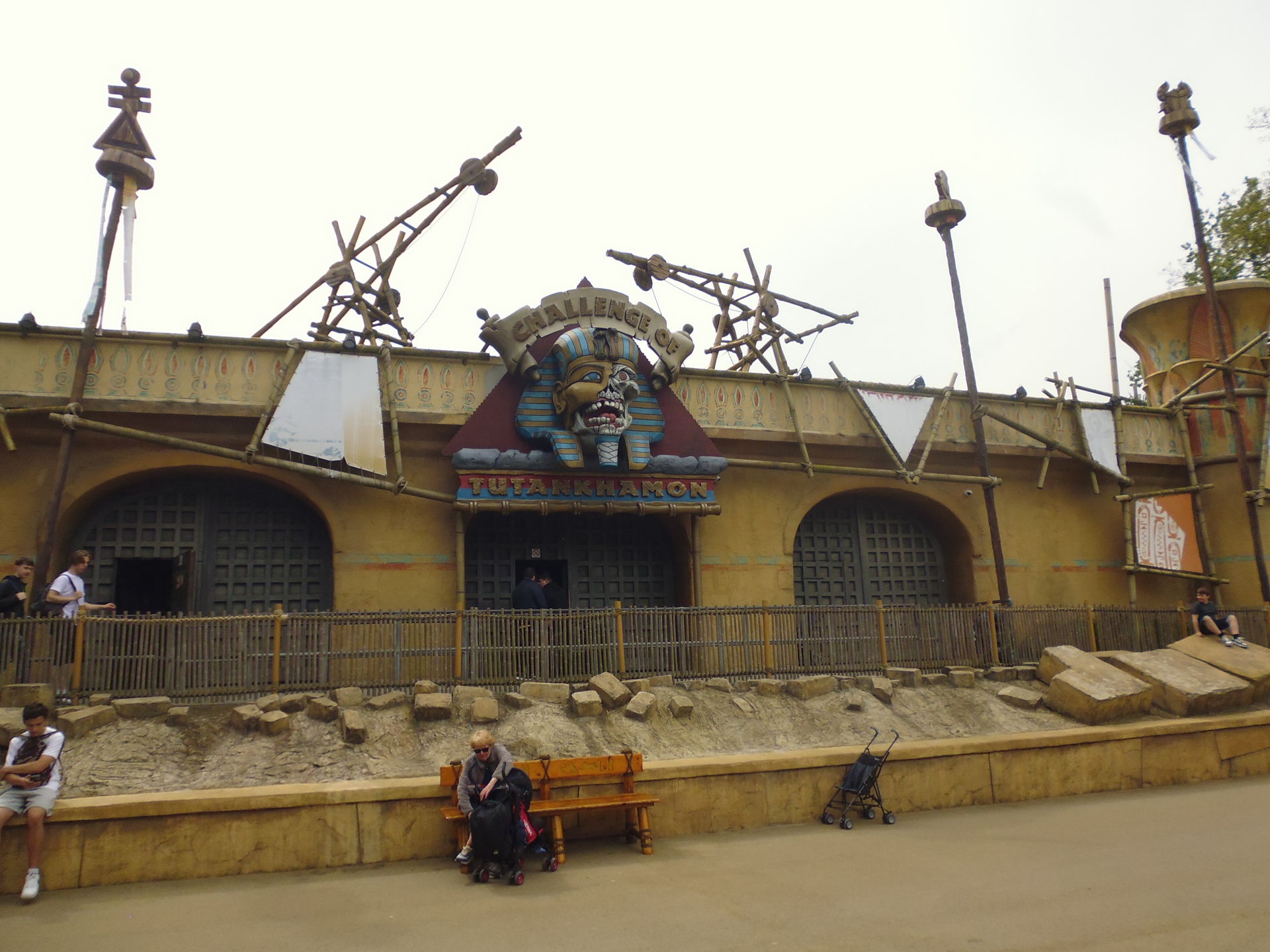 Daraufhin kundschaftete ich noch ein paar Fotospots aus und holte vor unserem nächsten Treffpunkt sitzend, dem zweiten Shooting-Darkride im Park, Challenge of Tutankhamon, per WLAN noch etwas Korrespondenz auf. Und als ob das nicht Beschäftigung und Kurzweil genug gewesen wäre, sprach mich da ein Parkmitarbeiter auf Französisch an, ob ich ihm nicht ein paar allgemeine Fragen für ihre Besucherstatistik beantworten könne. Regelrecht verblüfft darüber, dass sein Park offenkundig Achterbahnverrückte aus der Schweiz anzieht, bat er mich darum, mir noch eine tiefergehende Sondage per E-Mail schicken zu dürfen. Die habe ich daheim dann auch teilweise ausgefüllt, hab aber ehrlicherweise irgendwann vor dem starren und etwas ungeschickt fabrizierten Design-Korsett kapituliert und mich nur noch durchgeklickt - man musste z.B. unbedingt die Wartezeit an den Ladenkassen im Park bewerten, obgleich man gerade zuvor angegeben hat, da gar nichts gekauft zu haben. Wirkte halt ein bisschen laienhaft, zog sich in der einen oder anderen Form leider durch die ganze Umfrage.