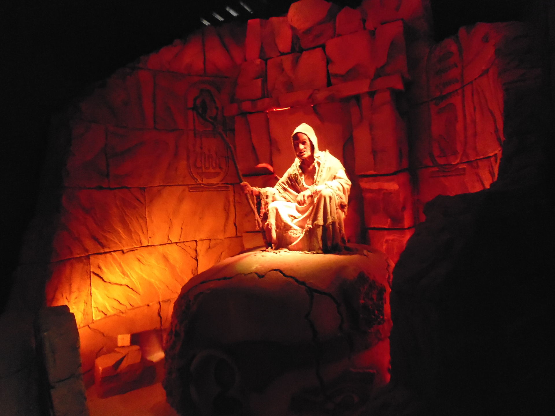 Die Wartezeitangabe in der App aktualisierte sich praktisch im Minutentakt auf alle möglichen Werte zwischen 15 und 35 Minuten, obschon die Schlange im Grunde eigentlich immer gleich lang aussah. Schlussendlich standen wir dann etwa 15-20 Minuten in den wirklich schaurig schön gemachten Katakomben mit Artefakten und zweisprachig plappernden Animatronics.