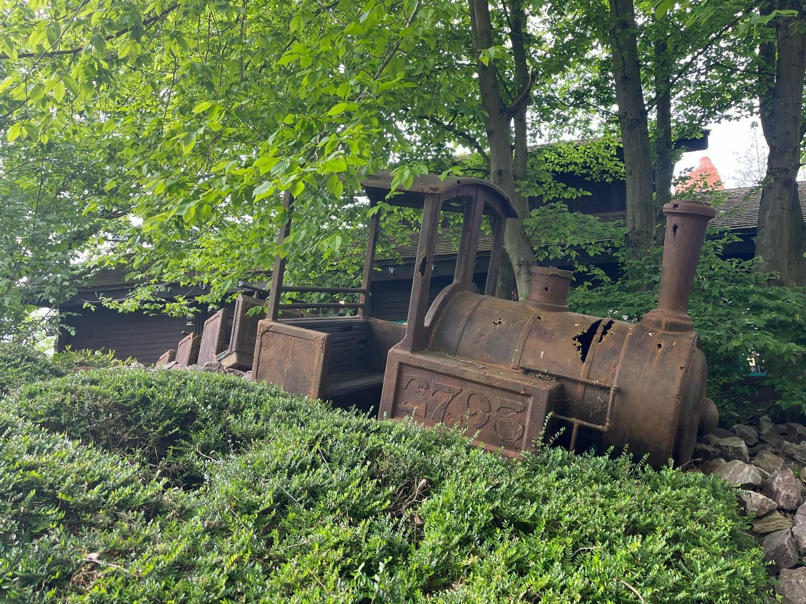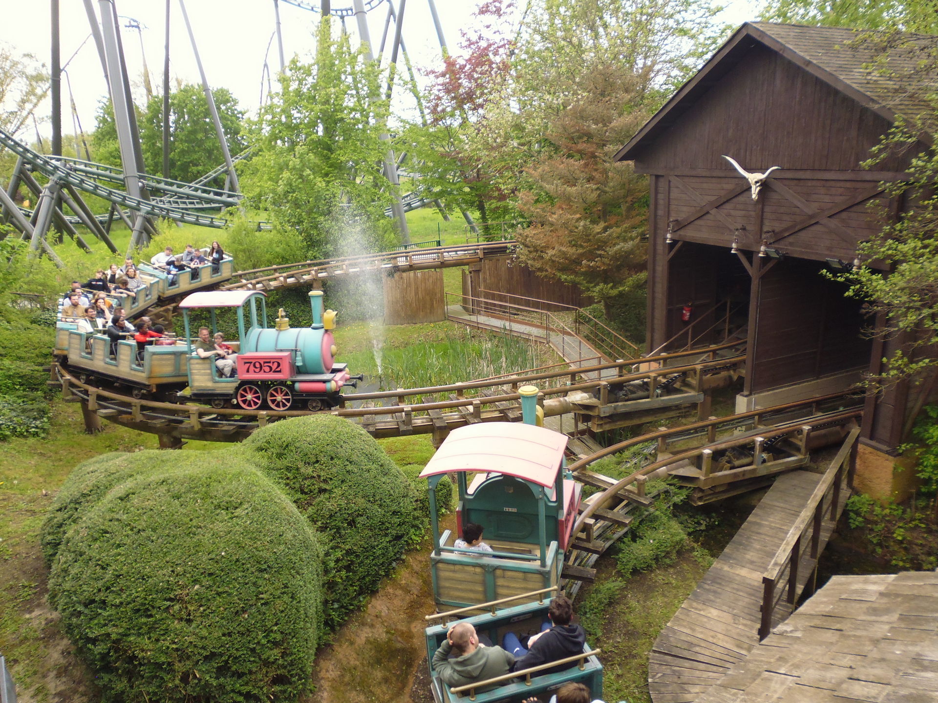 Im Verlaufe des Nachmittags habe ich insgesamt vier Fahrten mit der Oldtimer-Strecke Melody Road unternommen, um den vom Park aus doch arg kamerascheuen Werwolf doch noch wirkungsvoll fotografisch festhalten zu können. Aber der erhoffte Shot mit einem Zug auf dem von da adrett abbildbaren First Drop wollte sich einfach nicht ergeben, sei es durch gelegentlichen Stau der Oldtimer oder den halt nach wie vor äusserst behäbig tuckernden Lifthill von Loup-Garou.