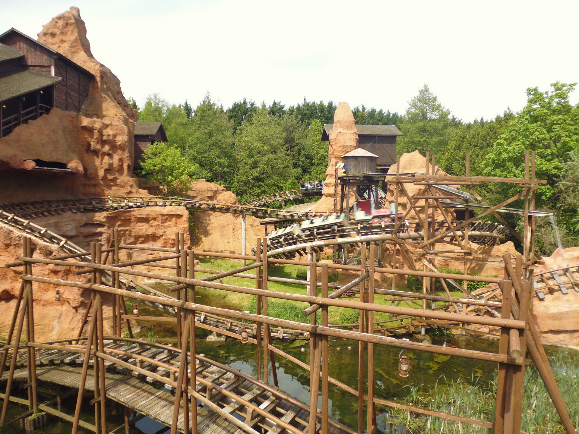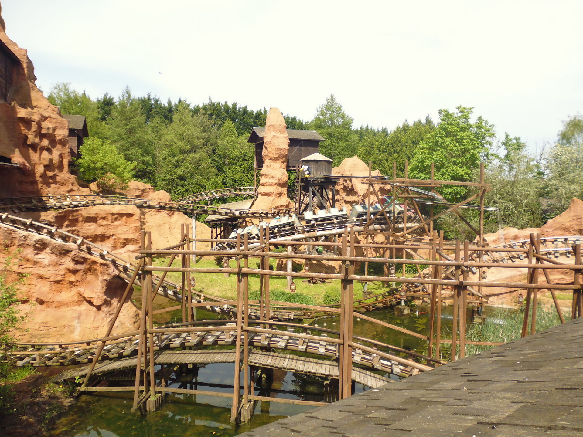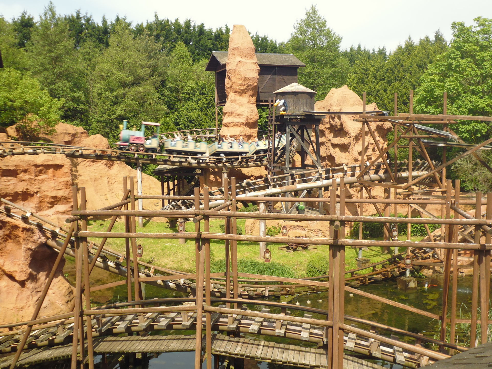 Wie beim letzten Mal war die geschätzte Wartezeit viel zu lang angegeben: Angezeigt wurden meine ich 25 Minuten, gedauert hat es nicht einmal zehn. Und das eigentlich auch nur, weil wir ein paar Leute vorgelassen haben, um die von da besonders toll aussehenden Schlüsselstellen von Kondaa mit Zügen festhalten zu können. Bei unserer wie immer spassigen Fahrt waren wir wegen einer kleinen Abfertigungsverzögerung auf dem ersten Lifthill leider nicht gleichauf mit dem Zug nebenan, weil sich ein Elternpaar zu dritt mit einem ihrer Kinder in eine Reihe setzen wollte - da musste sich der Papa dann noch zu mir gesellen. Aber naja, Jammern auf hohem Niveau - Vekoma Minetrains sind einfach spitze, erst recht so hübsch in die Szenerie eingebettete Exemplare wie dieses hier.