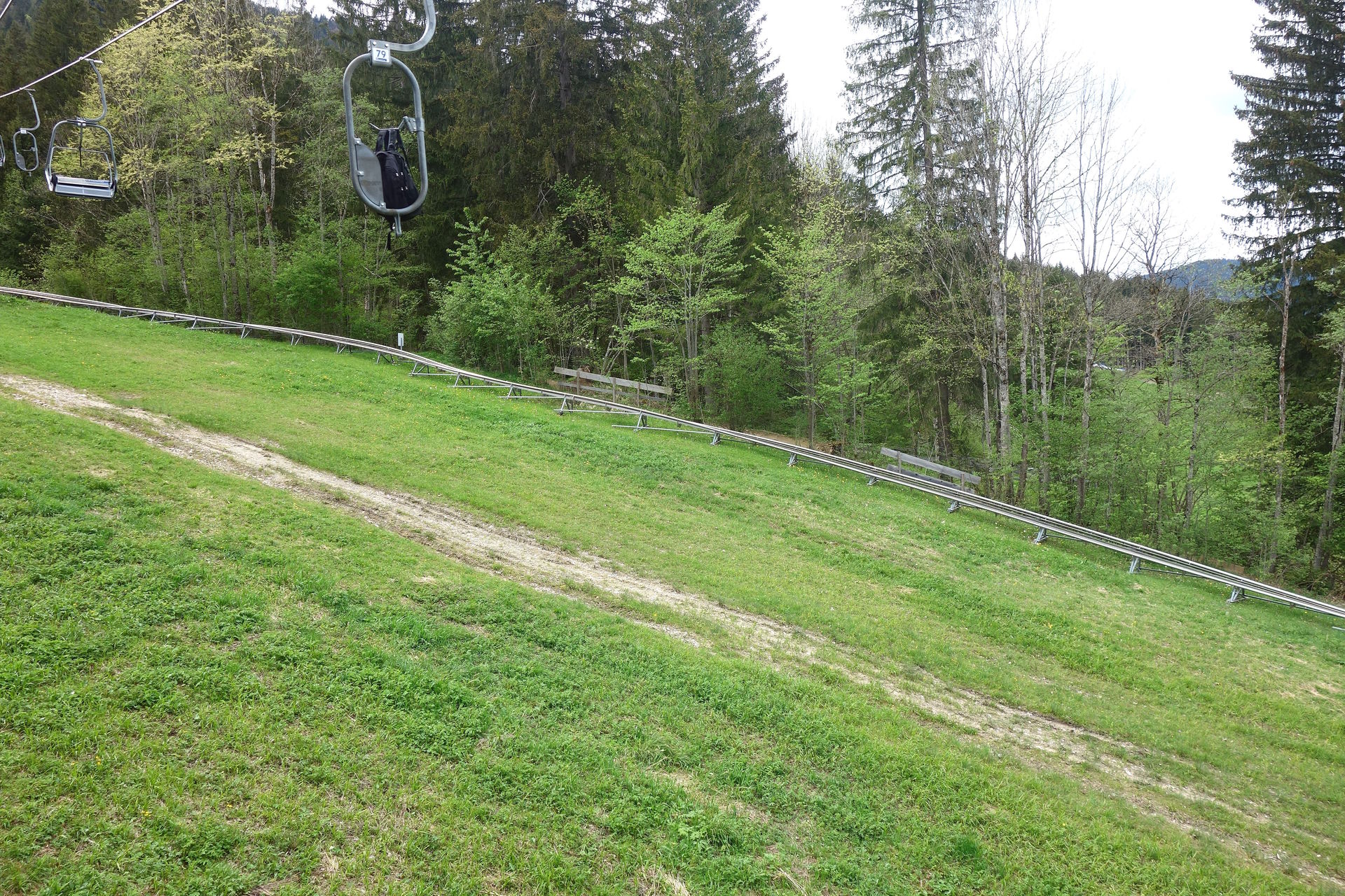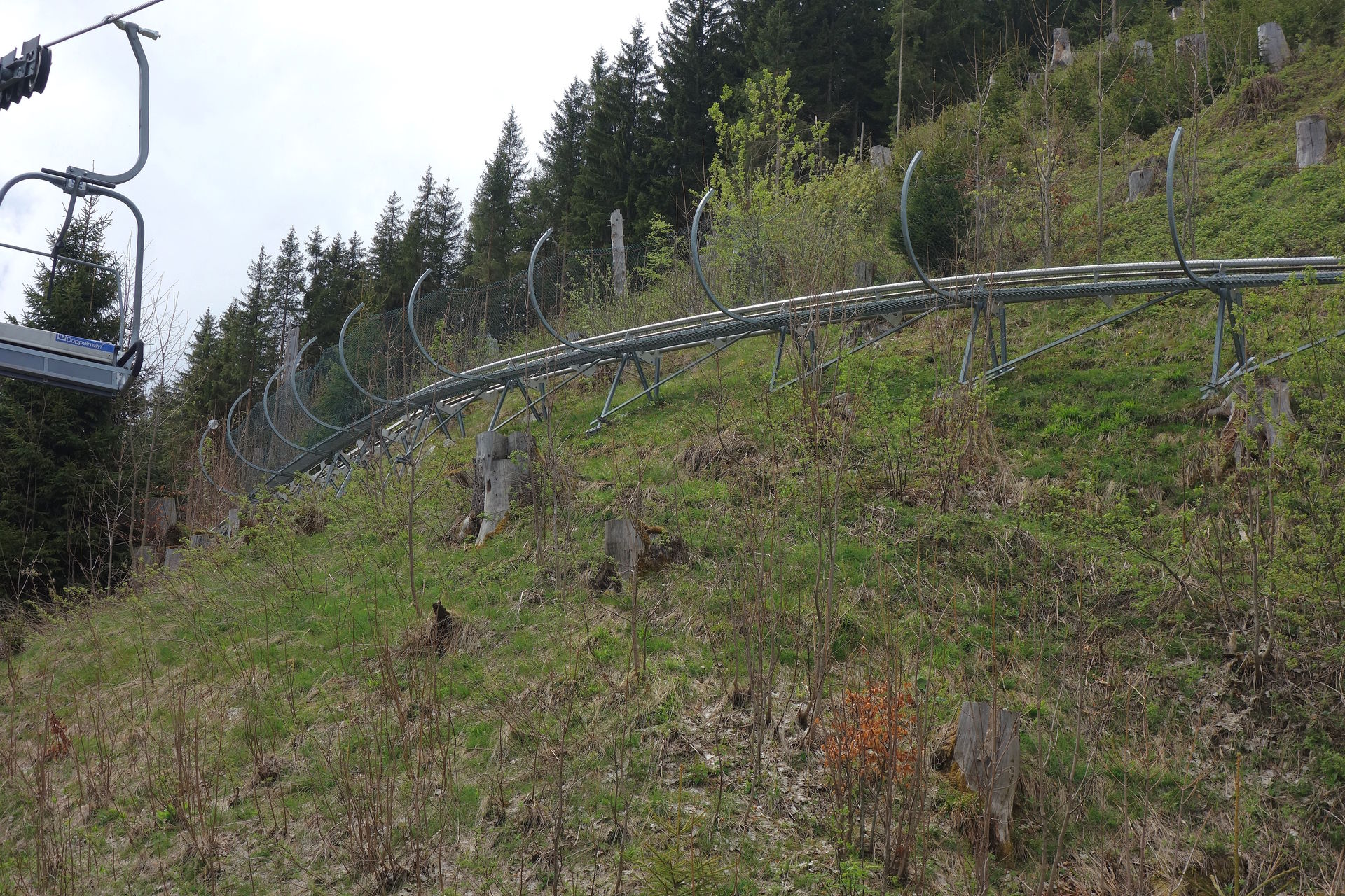 Die Fahrt beginnt mit leichten Schlenkern entlang des Hangs parallel zur Sesselbahn, ehe man diese mit zunehmendem Gefälle kreuzt.