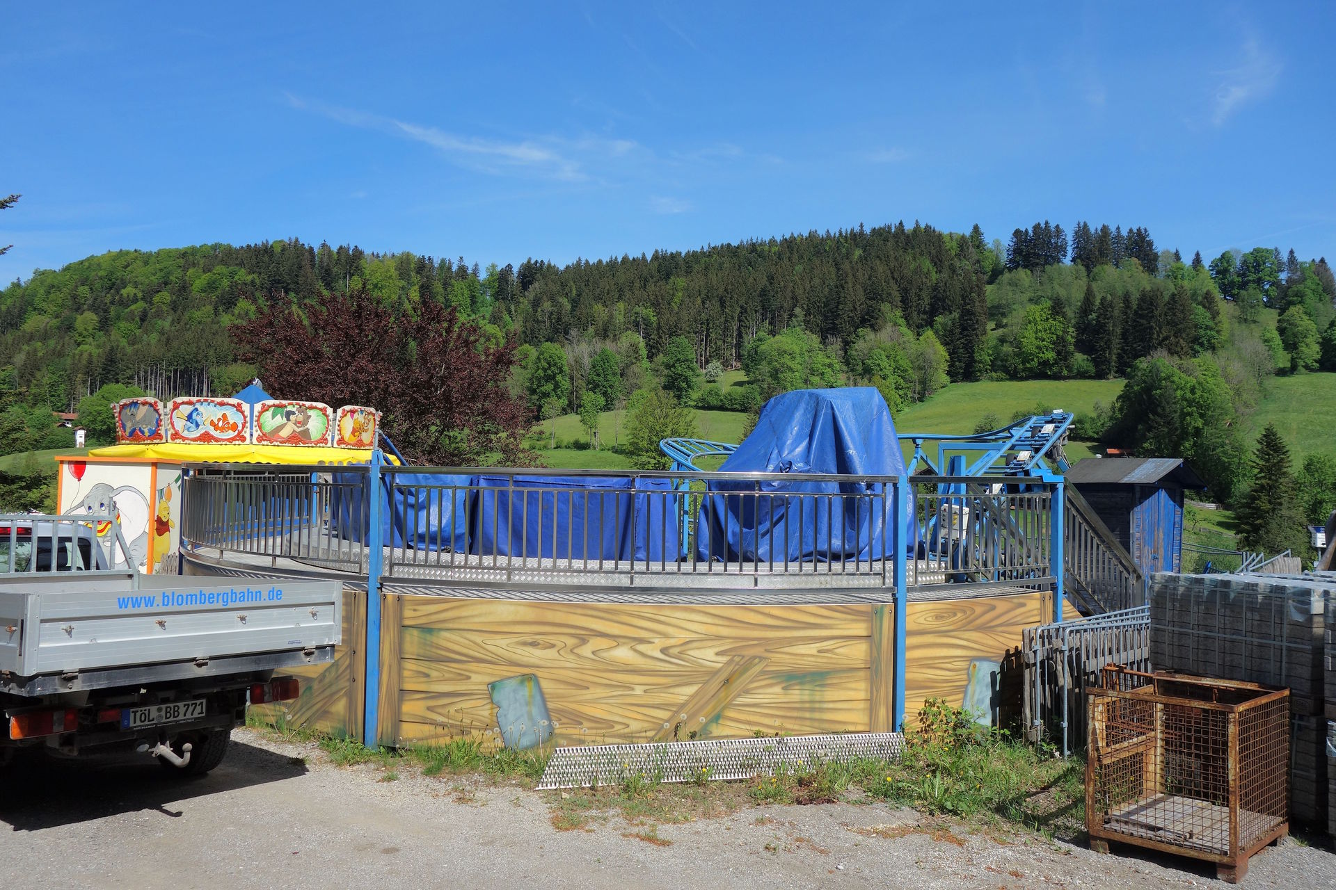 Dass das unter der Woche wohl nichts werden würde, war mir schon bei der Planung klar, aber laut mko1994 soll es am Sonntag genauso ausgesehen haben - ich hatte am Steuer leider nicht so genau hinschauen können. Dabei wurde der Blombini Express im CC tatsächlich einmal am 01. Mai und sogar viermal am 12. Mai - dem Sonntag nach unserem Besuch - abgehakt. Nunja, ich hab das Ding für mich einfach mal ausgeblendet. Vielleicht findet sich ja irgendwann ein vierter Standort für den Mini Otto aus dem Hause I.E. Park, wo die Chancen auf einen Haken größer sind. Debütiert hatte die Bahn 2003 im Tobiland in Köln. 2007 erfolgte der Umzug nach Bayern, zunächst ins Lollihop München und 2014 dann zum Blomberg.