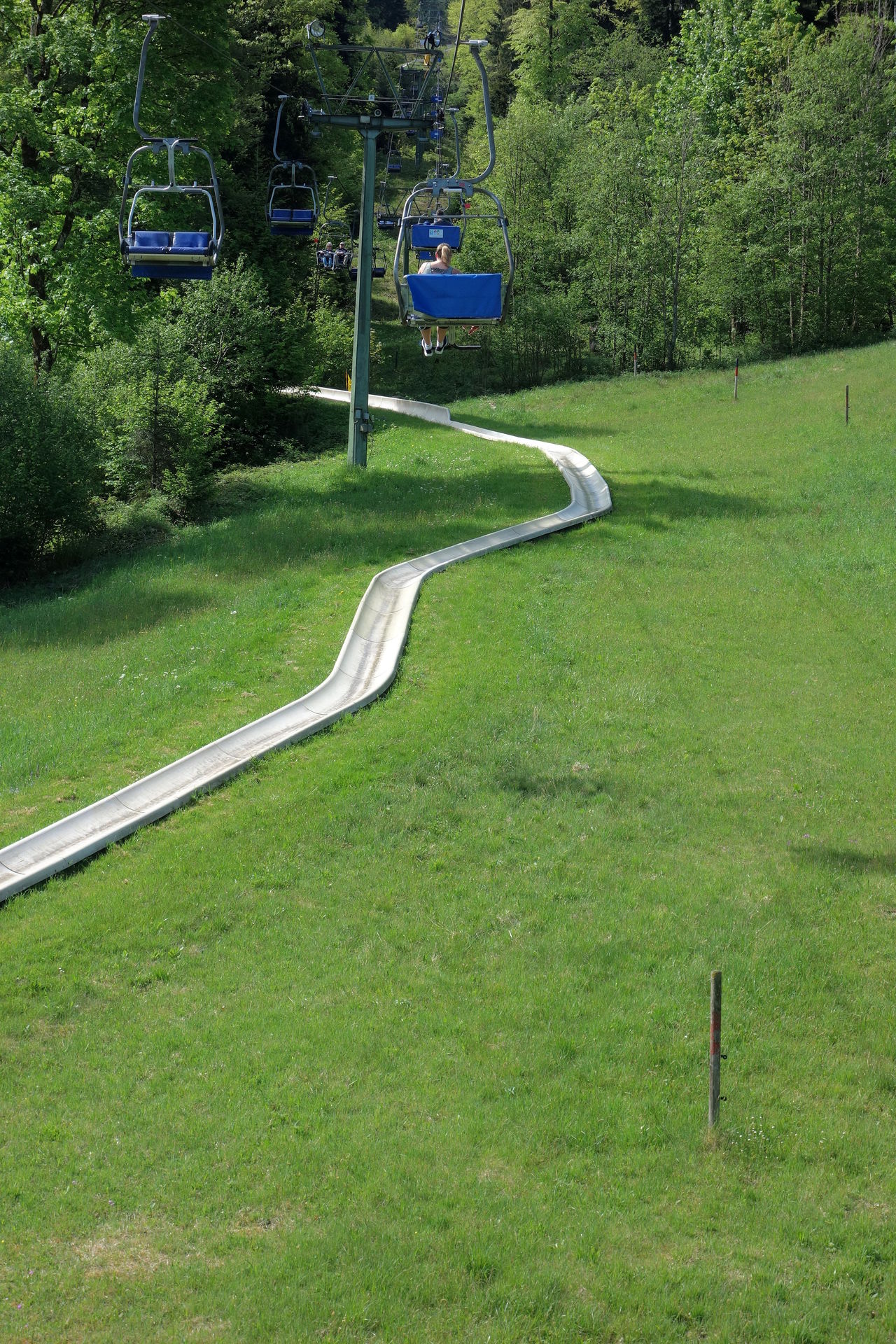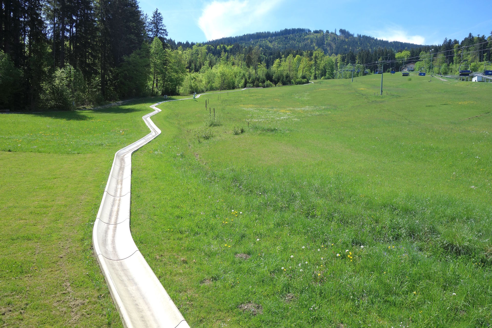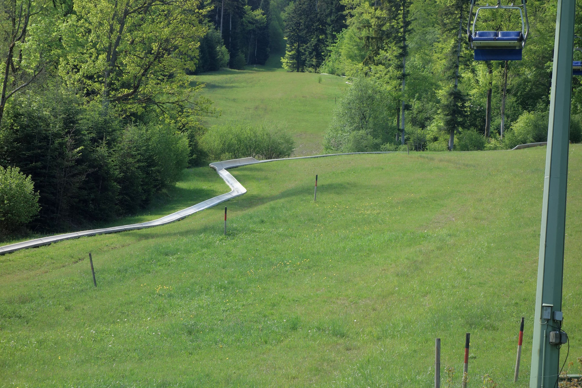 Die Sesselbahn überwindet auf einer Länge von 1.800 Metern einen Höhenunterschied von 517 Metern - jedenfalls laut dem offiziellen Magazin zum 50-jährigen Jubiläum, gemäß der Angaben zu den Höhen der Stationen auf der offiziellen Webseite müssten es eigentlich sogar 533 Meter sein. Demnach liegt die Talstation auf 703 Metern, während sich die Bergstation in einer Höhe von 1.236 Metern befinden soll. Wer nach ganz oben will, passiert dabei 26 Stützen. 1976 wurde allerdings auf einer Höhe von 890 Metern eine einseitige Mittelstation eingerichtet, die zur Erschließung der im selben Jahr eröffneten Sommerrodelbahn dient. Aussteigen kann man hier nur bei der Bergfahrt, talwärts schwebt man deutlich höher an dem Holzpodest vorbei. Die Familie vor uns hatte sich glücklicherweise dazu entschieden, zunächst die Bergstation zu erkunden und dann zur Sommerrodelbahn zu wandern. Wir konnten uns also unbehelligt auf die Rodelschlitten schwingen und die 1.286 Meter lange Strecke ohne Angst vor Bremsern in Angriff nehmen.