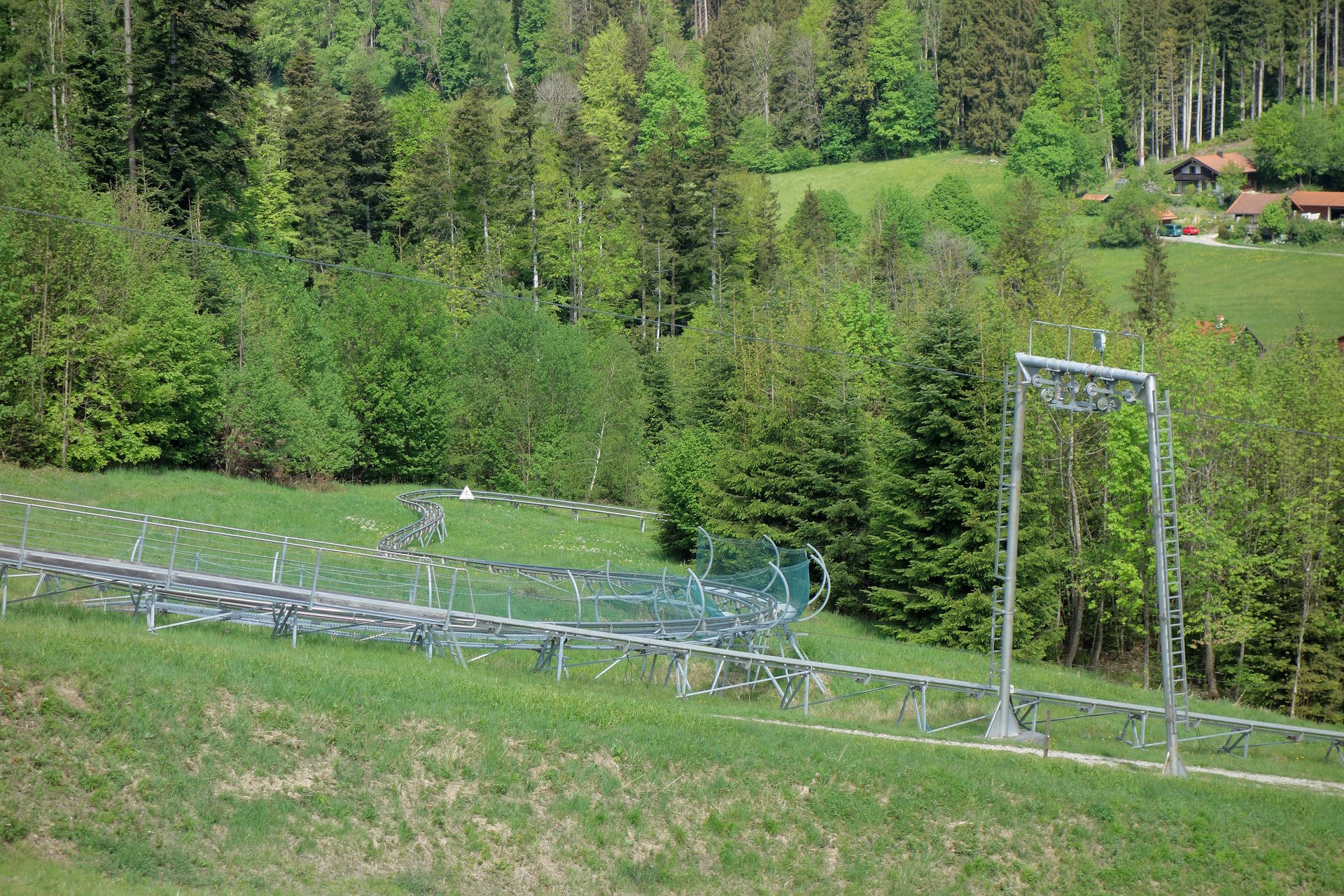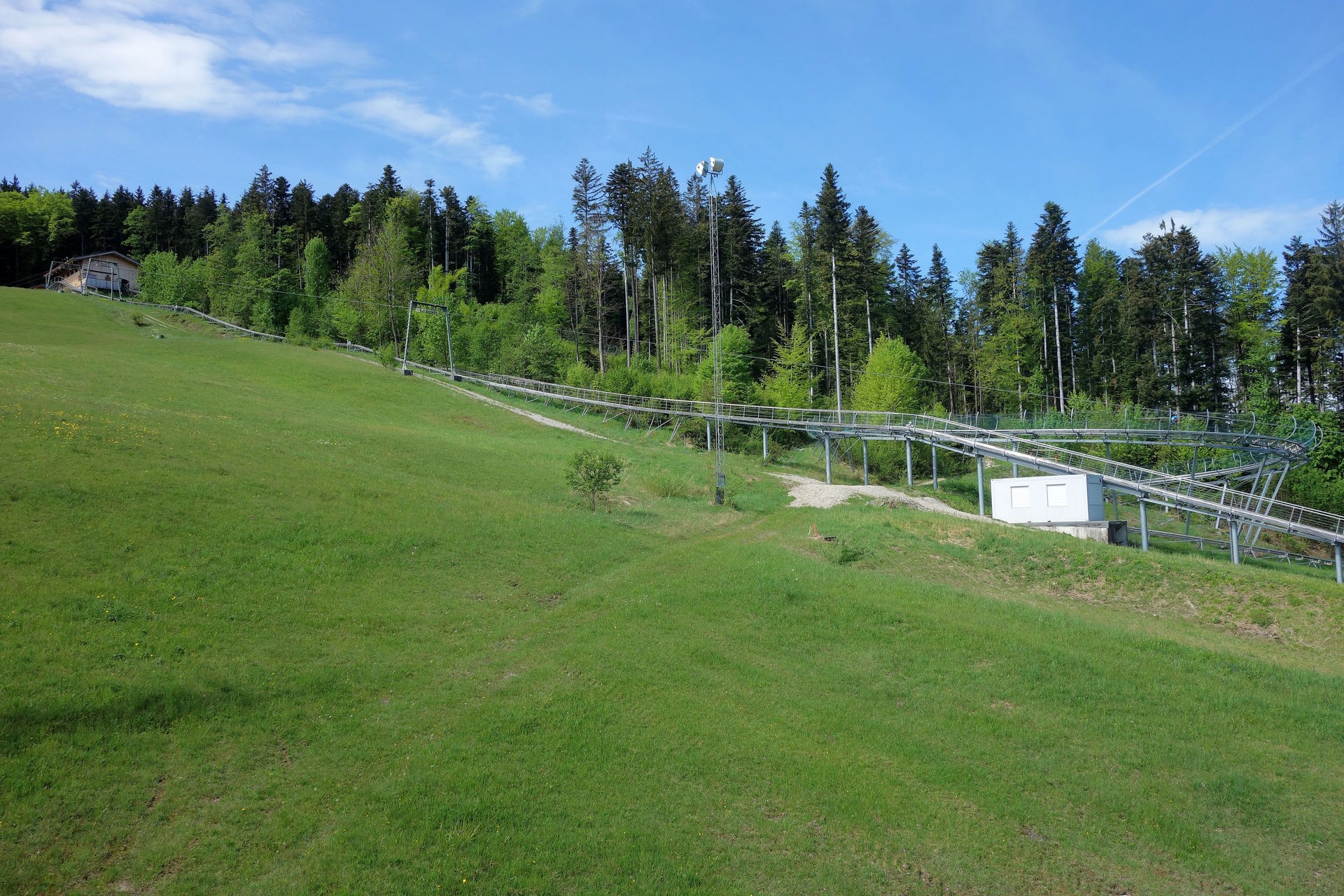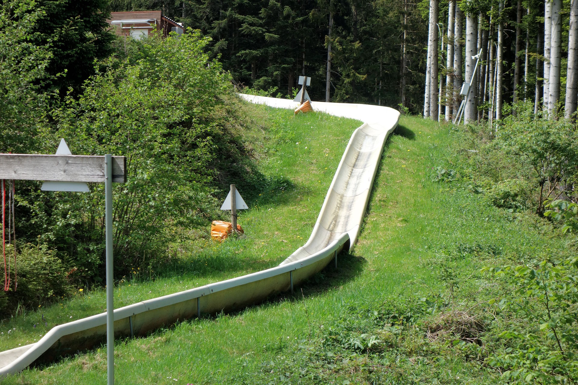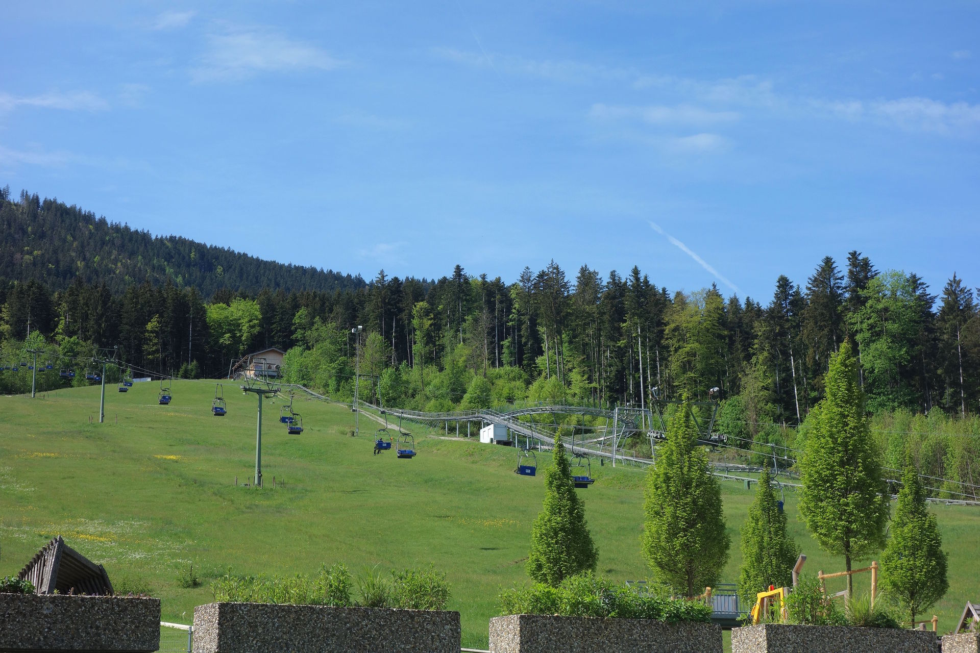 Die Sesselbahn überwindet auf einer Länge von 1.800 Metern einen Höhenunterschied von 517 Metern - jedenfalls laut dem offiziellen Magazin zum 50-jährigen Jubiläum, gemäß der Angaben zu den Höhen der Stationen auf der offiziellen Webseite müssten es eigentlich sogar 533 Meter sein. Demnach liegt die Talstation auf 703 Metern, während sich die Bergstation in einer Höhe von 1.236 Metern befinden soll. Wer nach ganz oben will, passiert dabei 26 Stützen. 1976 wurde allerdings auf einer Höhe von 890 Metern eine einseitige Mittelstation eingerichtet, die zur Erschließung der im selben Jahr eröffneten Sommerrodelbahn dient. Aussteigen kann man hier nur bei der Bergfahrt, talwärts schwebt man deutlich höher an dem Holzpodest vorbei. Die Familie vor uns hatte sich glücklicherweise dazu entschieden, zunächst die Bergstation zu erkunden und dann zur Sommerrodelbahn zu wandern. Wir konnten uns also unbehelligt auf die Rodelschlitten schwingen und die 1.286 Meter lange Strecke ohne Angst vor Bremsern in Angriff nehmen.