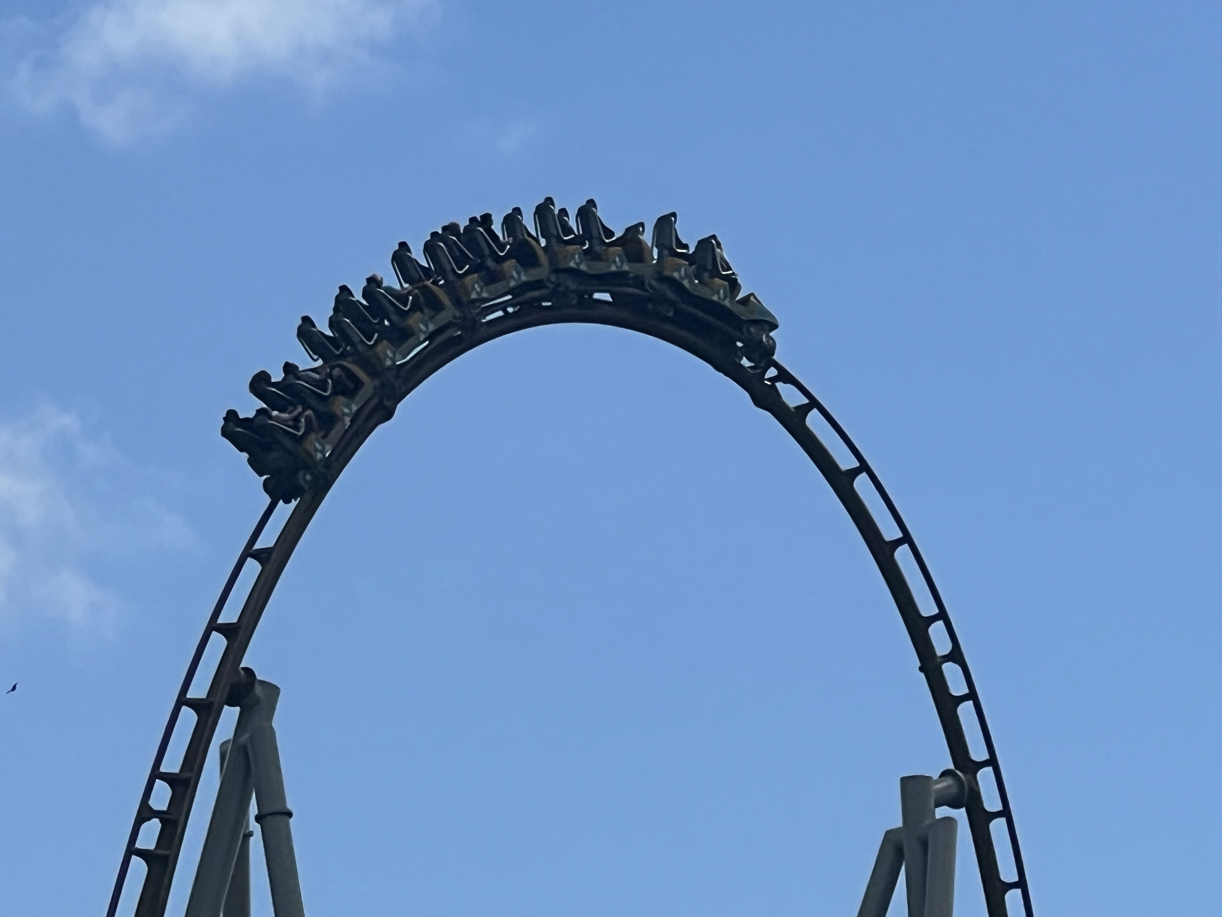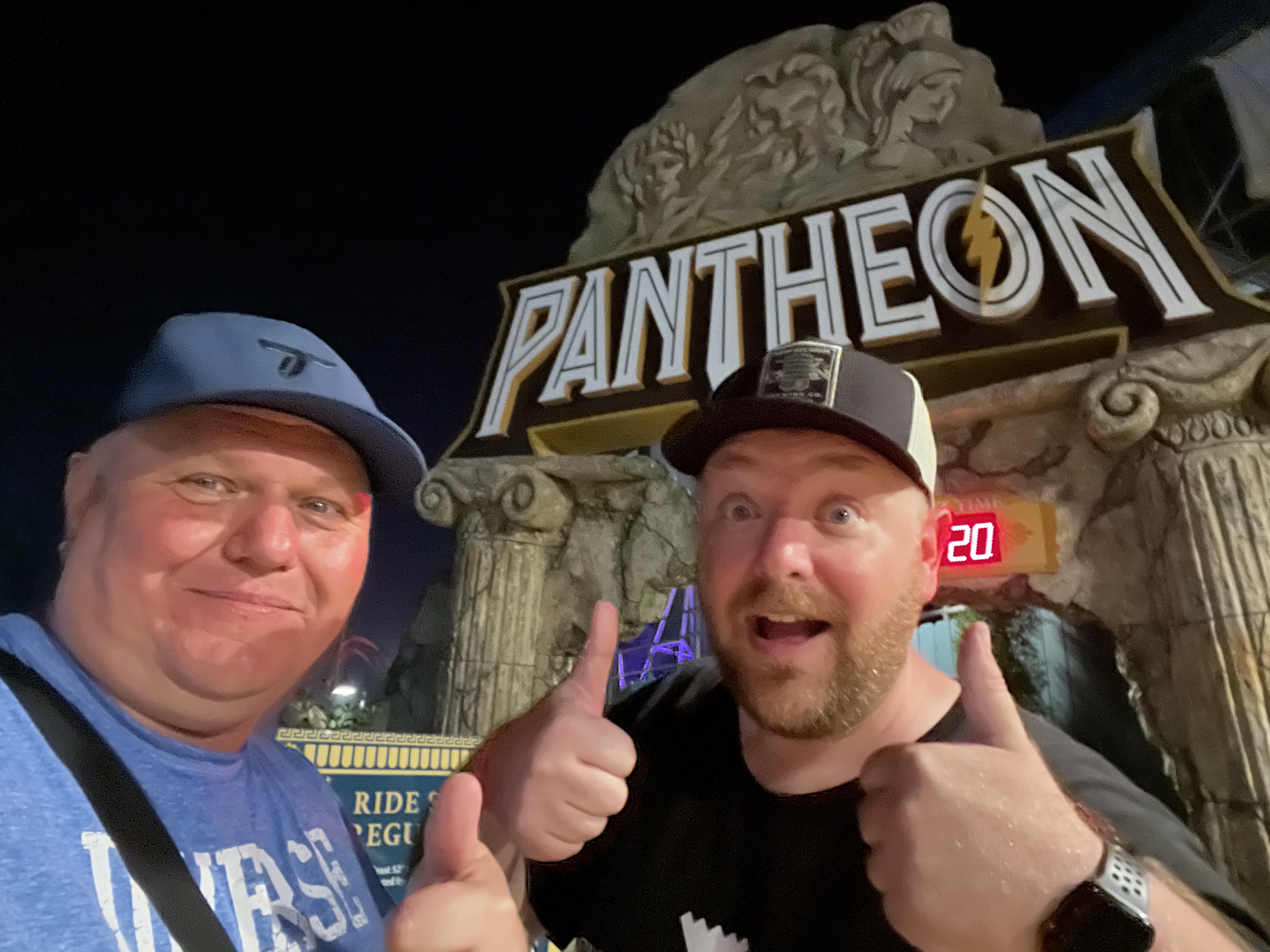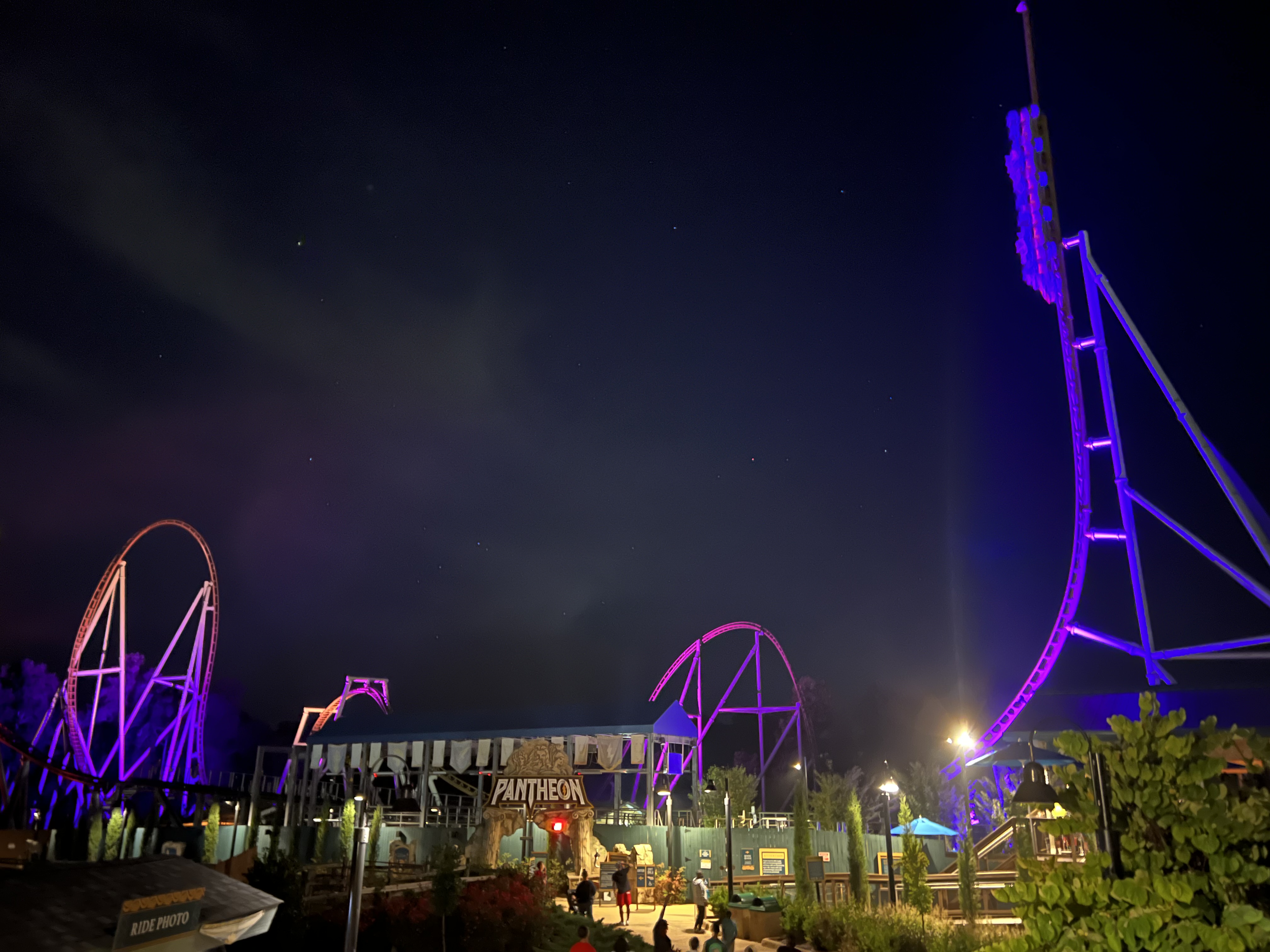 Nach zwei Fahrten Pantheon (Frontrow und Backrow) im Dunkeln ging es dann zum Tagesabschluss noch mal so Richtung in die Dunkelheit: Und zwar zu Wiederholungsfahrten auf Apollo's Chariot. Das ist ein krönender Abschluss gewesen. Man fährt komplett im Dunkeln, da die Strecke ausserhalb an der Peripherie des Parks entlangführt und verzichtet auf Beleuchtung der Strecke wie man es bei Pantheon tut. Ob Front oder Back Row: Beides bereitet uns Fahrt für Fahrt einen Heidenspaß.