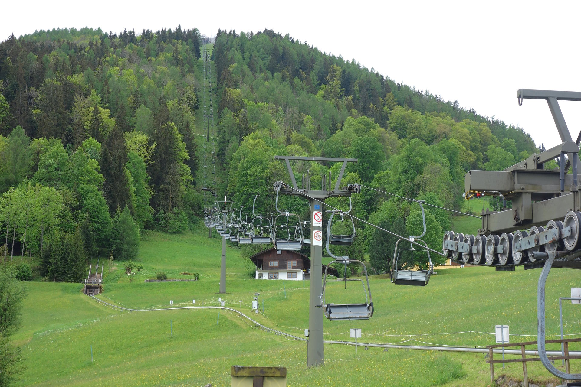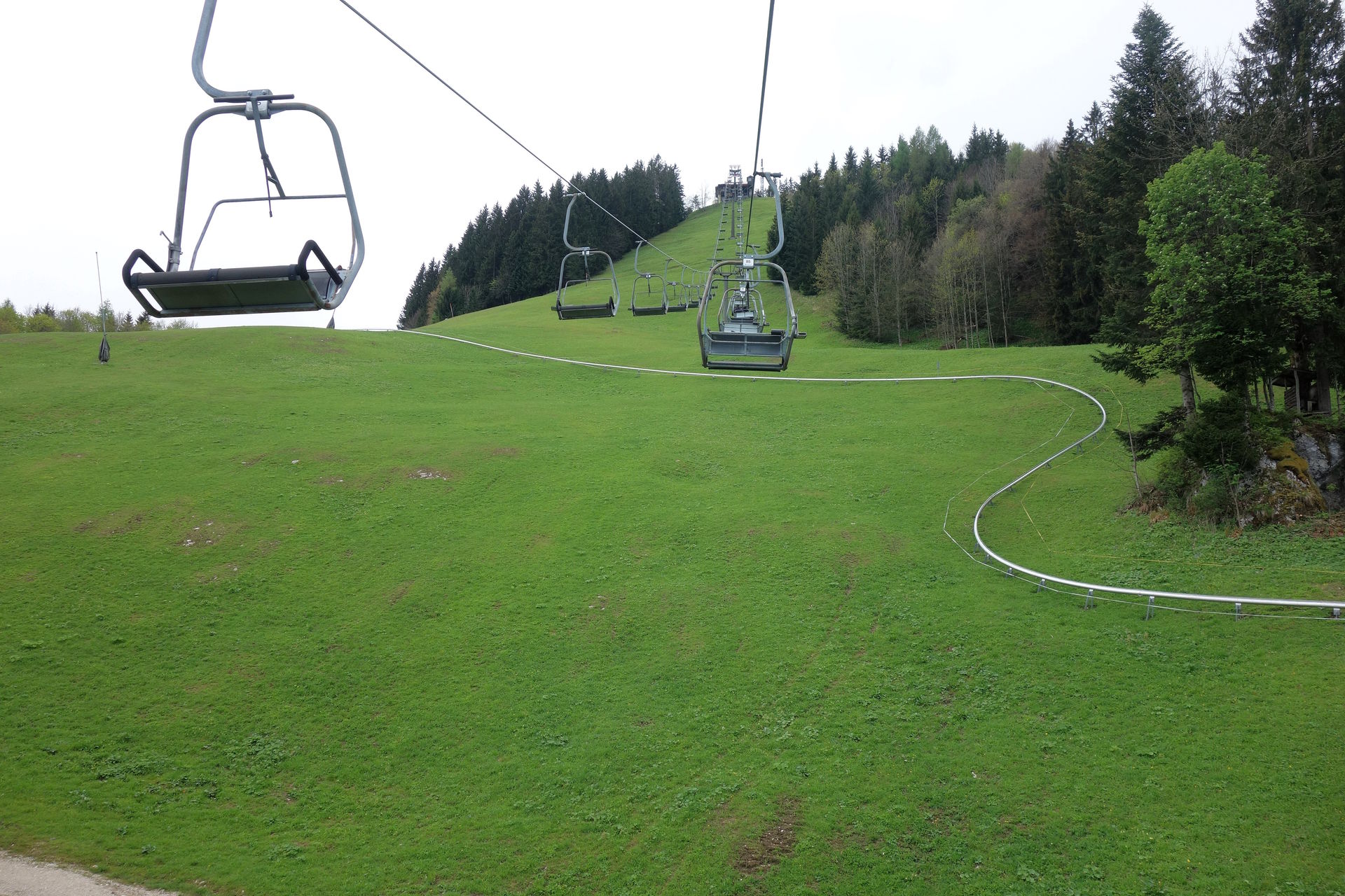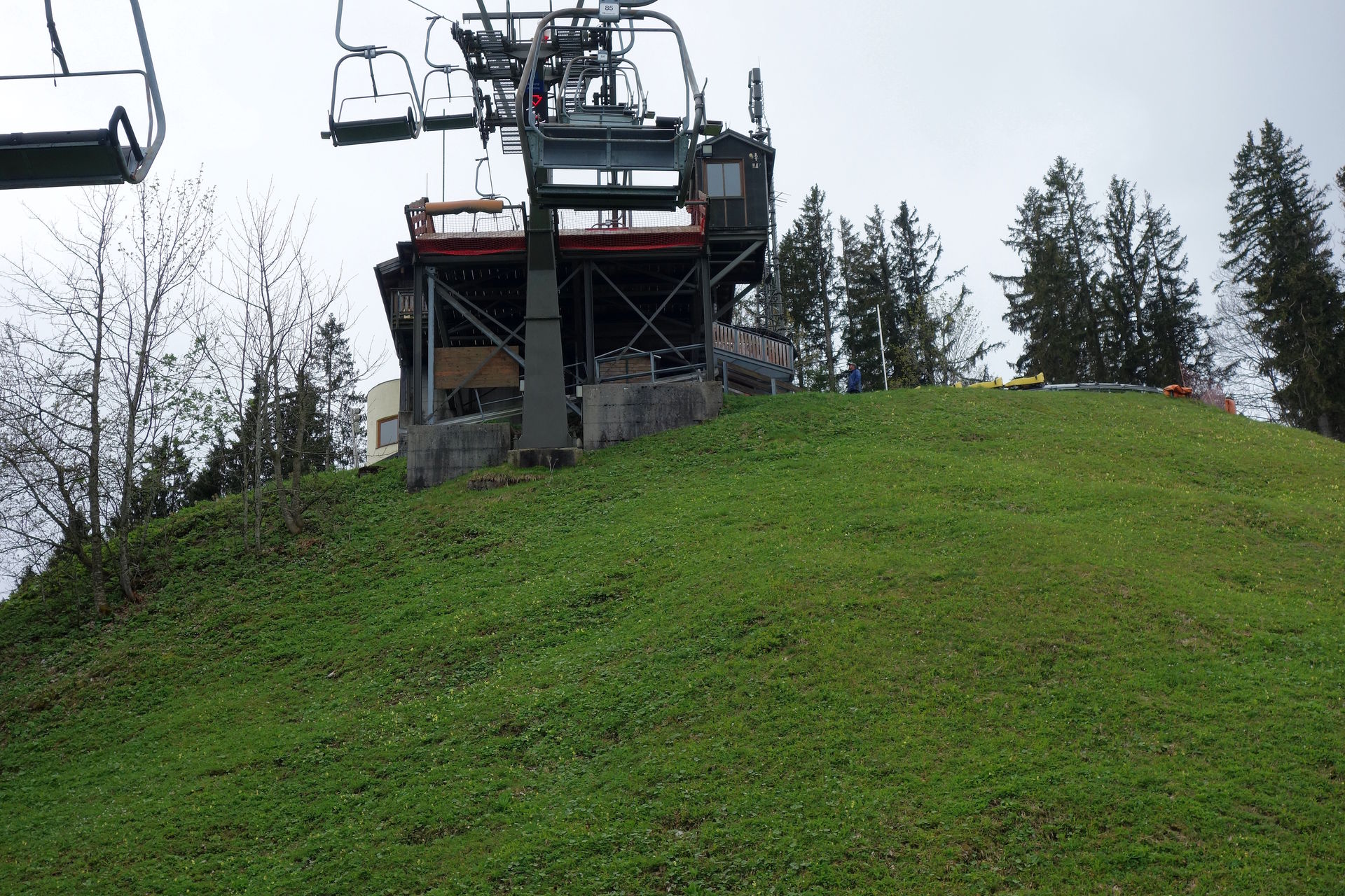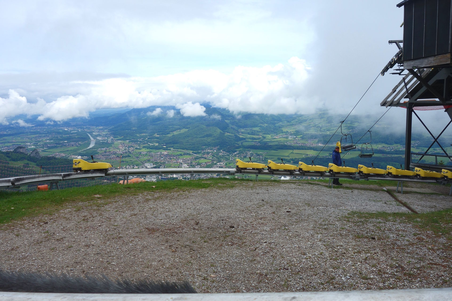 Zudem bestätigte das Schild am Zugang zum Wartebereich den optischen Eindruck: geschlossen. Ob dies nun wetterbedingt so bleiben sollte (laut Homepage öffnet man nur bei gutem Wetter und in der Nacht hatte es ja geregnet), oder ob man nur etwas später öffnen würde, konnten wir aber leider nicht erkennen. Immerhin waren aus der Werkstatt des Lifts Geräusche zu vernehmen, es schien also jemand da zu sein. Nach ein paar Minuten sahen wir dann auch zwei oder drei Schlitten die Rodelbahn herunterkommen. Offenbar Mitarbeiter auf morgendlicher Probefahrt, deren kurzer Unterhaltung nach dem Ausstieg wir entnehmen konnten, dass eine Öffnung wohl möglich sei. Eine Mitarbeiterin kam schließlich auf uns zu und bestätigte dies, es dauere allerdings noch ein wenig. Derweil wurde endlich der Lift angeschmissen und einer der Mitarbeiter klappte nacheinander die vorbeikommenden Sessel herunter. Und das waren einige. Wir hatten schon überlegt, ob der zwischenzeitlich wieder nach oben gefahrene Kollege sie dort nicht spaßeshalber nochmal hochklapen würde, aber irgendwann kamen tatsächlich runtergeklappte Sessel unten an und wir konnten unsere Tickets für je 17? erwerben - mit dem pflichtgemäßen Hinweis, dass die Abfahrt per Rodelbahn natürlich nur möglich sei, wenn es nicht wieder anfangen würde zu regnen. Aber nachdem die Wolken in der Zwischenzeit den Blick auf den Gipfel freigegeben hatten, waren wir recht zuversichtlich.