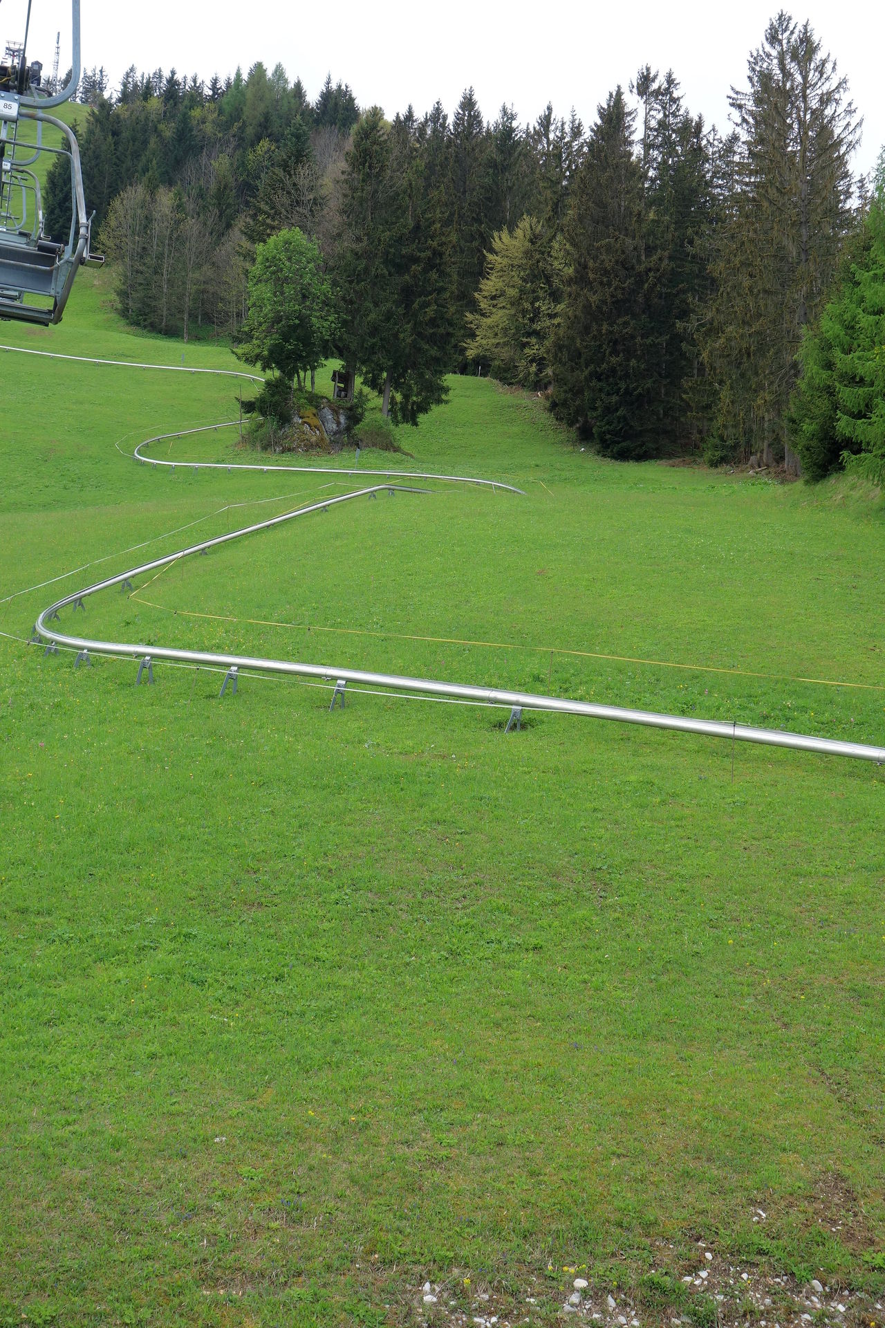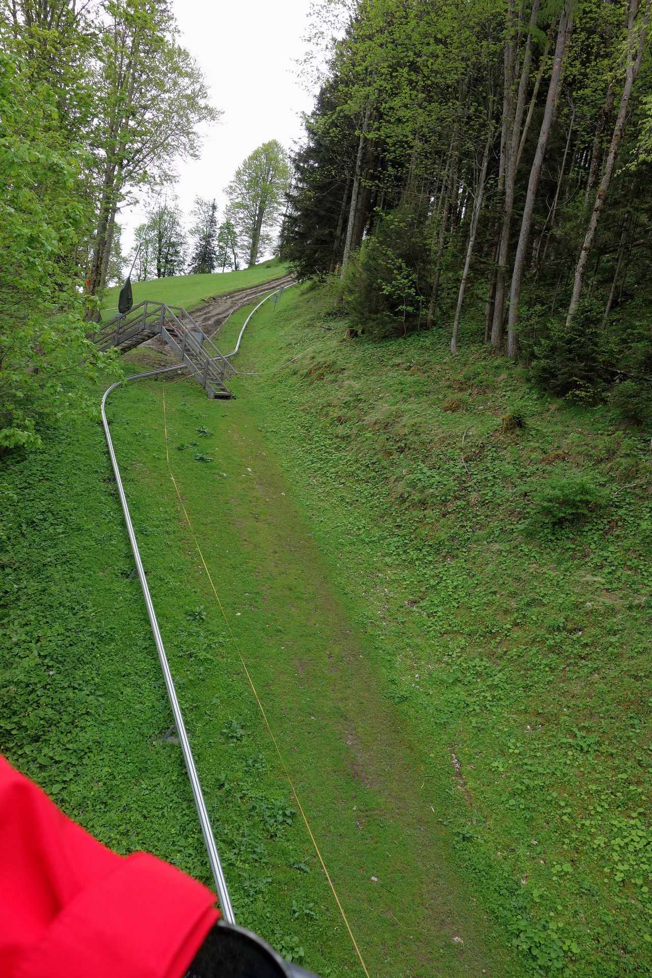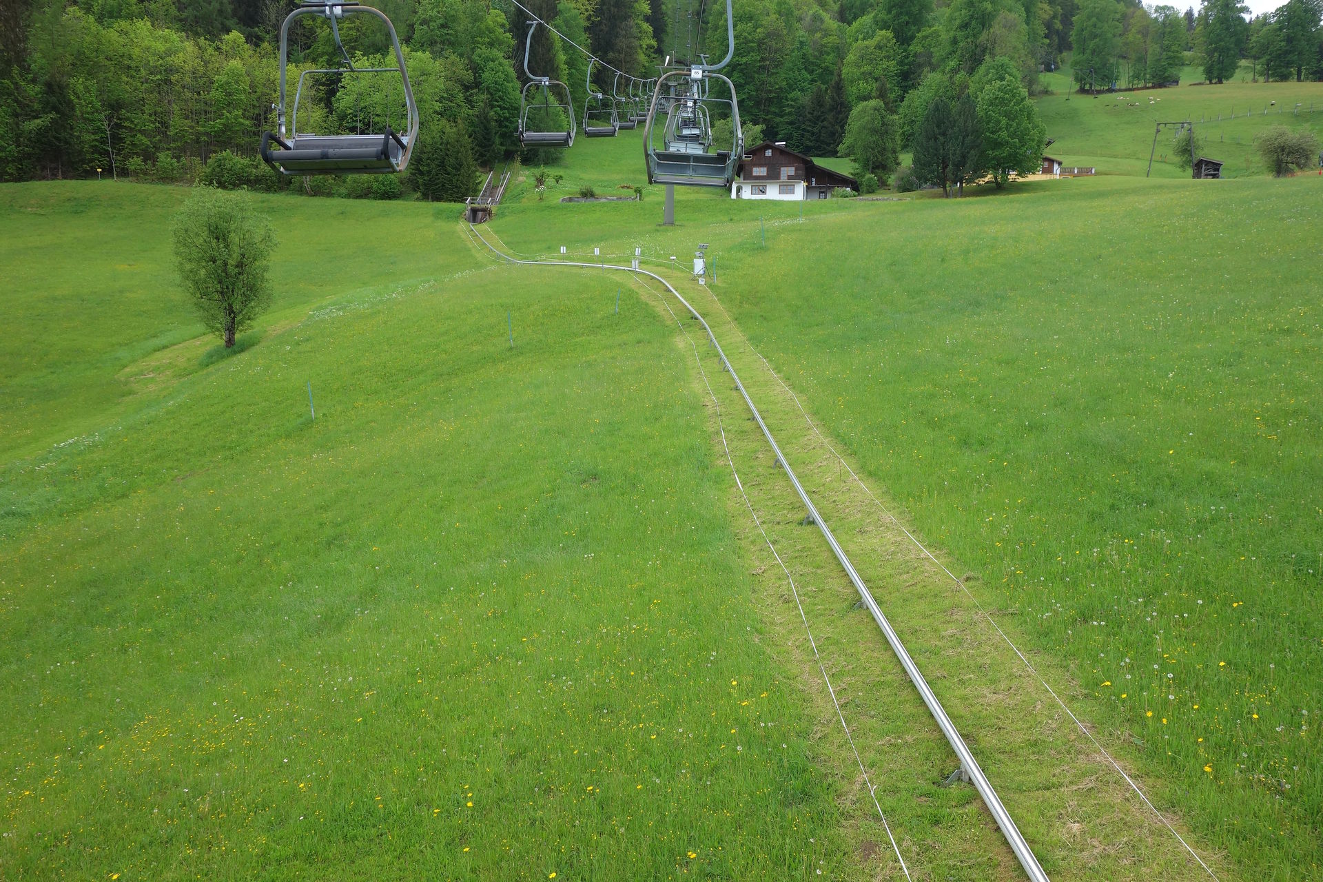 Zudem bestätigte das Schild am Zugang zum Wartebereich den optischen Eindruck: geschlossen. Ob dies nun wetterbedingt so bleiben sollte (laut Homepage öffnet man nur bei gutem Wetter und in der Nacht hatte es ja geregnet), oder ob man nur etwas später öffnen würde, konnten wir aber leider nicht erkennen. Immerhin waren aus der Werkstatt des Lifts Geräusche zu vernehmen, es schien also jemand da zu sein. Nach ein paar Minuten sahen wir dann auch zwei oder drei Schlitten die Rodelbahn herunterkommen. Offenbar Mitarbeiter auf morgendlicher Probefahrt, deren kurzer Unterhaltung nach dem Ausstieg wir entnehmen konnten, dass eine Öffnung wohl möglich sei. Eine Mitarbeiterin kam schließlich auf uns zu und bestätigte dies, es dauere allerdings noch ein wenig. Derweil wurde endlich der Lift angeschmissen und einer der Mitarbeiter klappte nacheinander die vorbeikommenden Sessel herunter. Und das waren einige. Wir hatten schon überlegt, ob der zwischenzeitlich wieder nach oben gefahrene Kollege sie dort nicht spaßeshalber nochmal hochklapen würde, aber irgendwann kamen tatsächlich runtergeklappte Sessel unten an und wir konnten unsere Tickets für je 17? erwerben - mit dem pflichtgemäßen Hinweis, dass die Abfahrt per Rodelbahn natürlich nur möglich sei, wenn es nicht wieder anfangen würde zu regnen. Aber nachdem die Wolken in der Zwischenzeit den Blick auf den Gipfel freigegeben hatten, waren wir recht zuversichtlich.