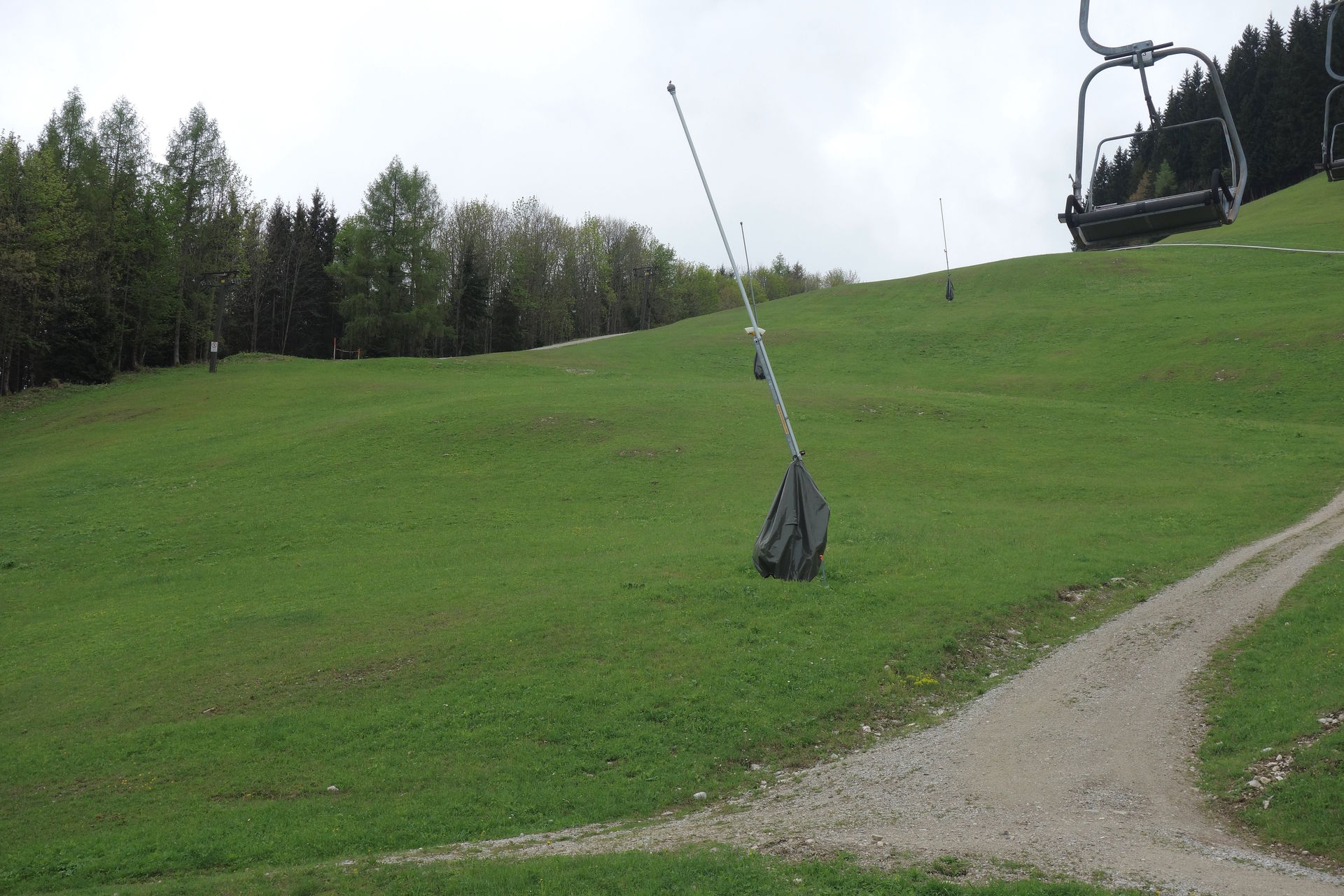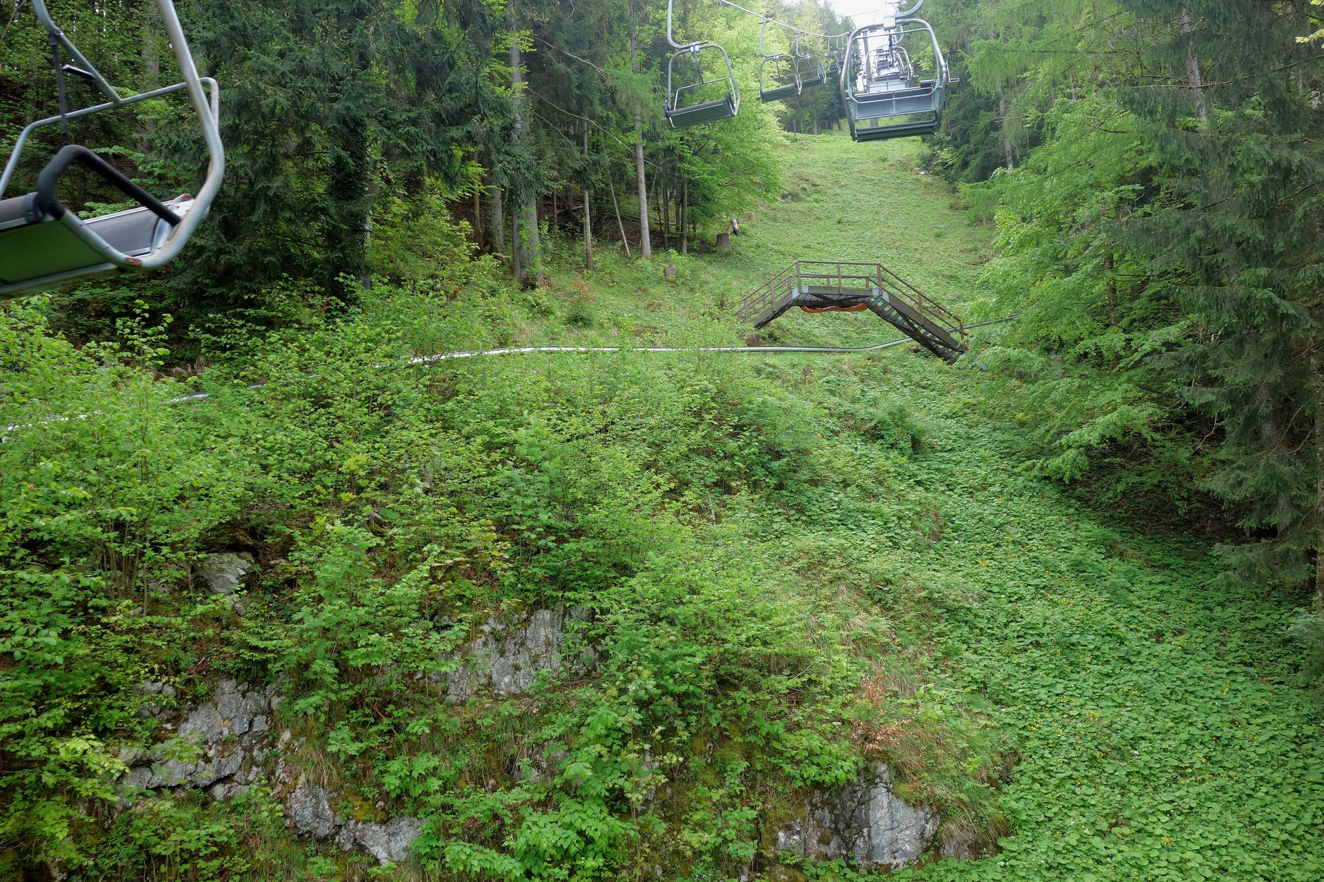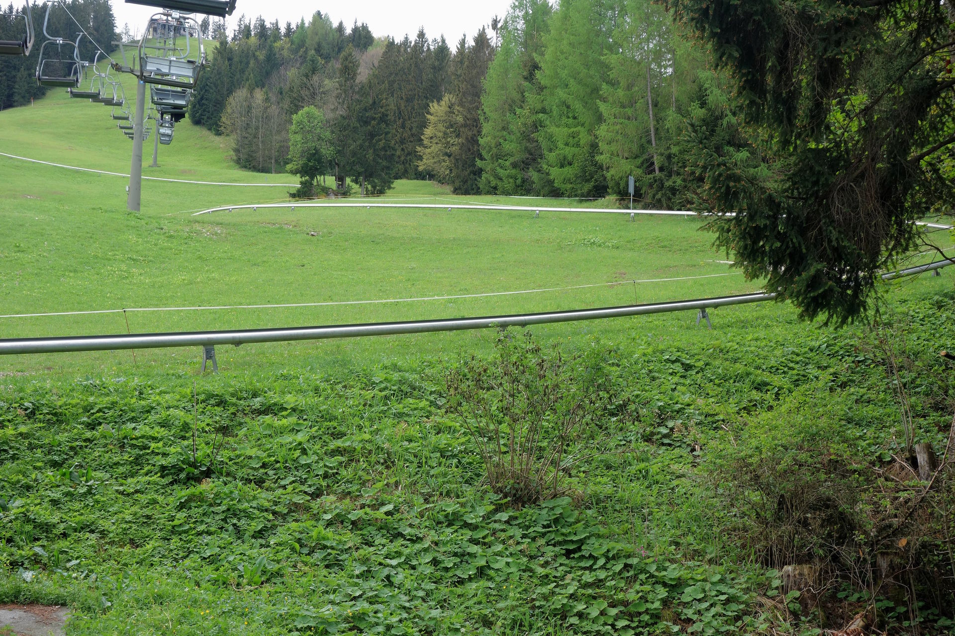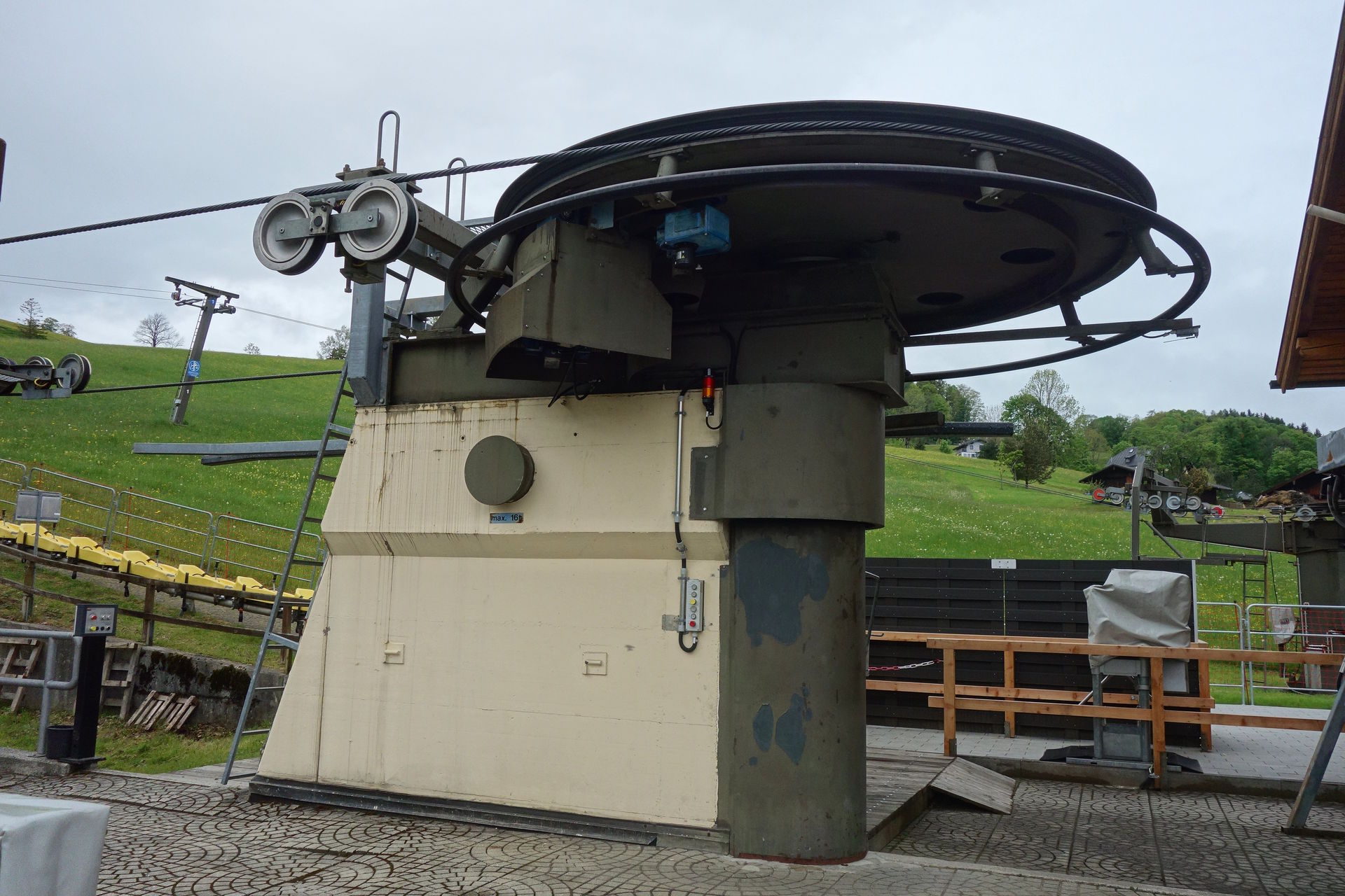 Zudem bestätigte das Schild am Zugang zum Wartebereich den optischen Eindruck: geschlossen. Ob dies nun wetterbedingt so bleiben sollte (laut Homepage öffnet man nur bei gutem Wetter und in der Nacht hatte es ja geregnet), oder ob man nur etwas später öffnen würde, konnten wir aber leider nicht erkennen. Immerhin waren aus der Werkstatt des Lifts Geräusche zu vernehmen, es schien also jemand da zu sein. Nach ein paar Minuten sahen wir dann auch zwei oder drei Schlitten die Rodelbahn herunterkommen. Offenbar Mitarbeiter auf morgendlicher Probefahrt, deren kurzer Unterhaltung nach dem Ausstieg wir entnehmen konnten, dass eine Öffnung wohl möglich sei. Eine Mitarbeiterin kam schließlich auf uns zu und bestätigte dies, es dauere allerdings noch ein wenig. Derweil wurde endlich der Lift angeschmissen und einer der Mitarbeiter klappte nacheinander die vorbeikommenden Sessel herunter. Und das waren einige. Wir hatten schon überlegt, ob der zwischenzeitlich wieder nach oben gefahrene Kollege sie dort nicht spaßeshalber nochmal hochklapen würde, aber irgendwann kamen tatsächlich runtergeklappte Sessel unten an und wir konnten unsere Tickets für je 17? erwerben - mit dem pflichtgemäßen Hinweis, dass die Abfahrt per Rodelbahn natürlich nur möglich sei, wenn es nicht wieder anfangen würde zu regnen. Aber nachdem die Wolken in der Zwischenzeit den Blick auf den Gipfel freigegeben hatten, waren wir recht zuversichtlich.