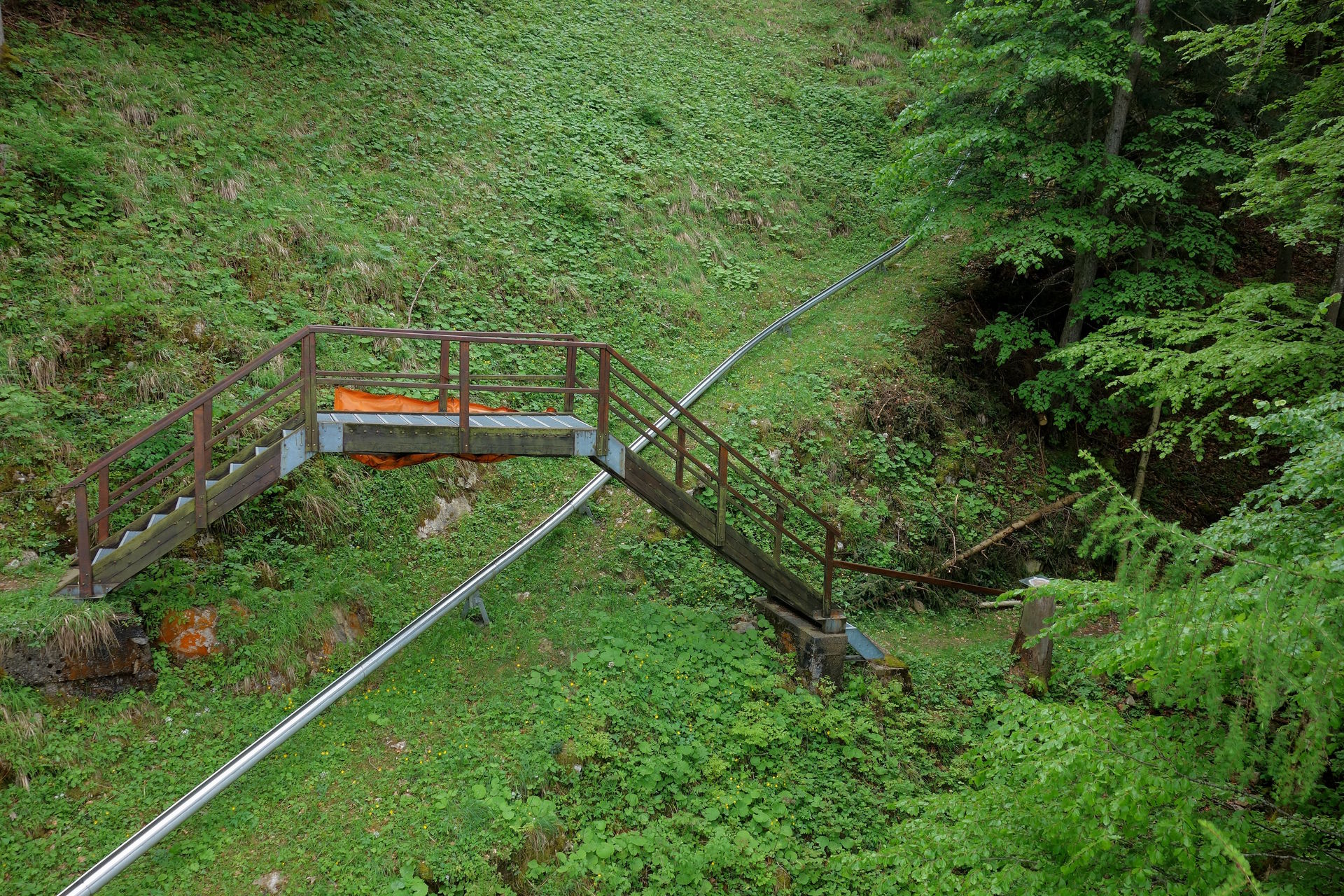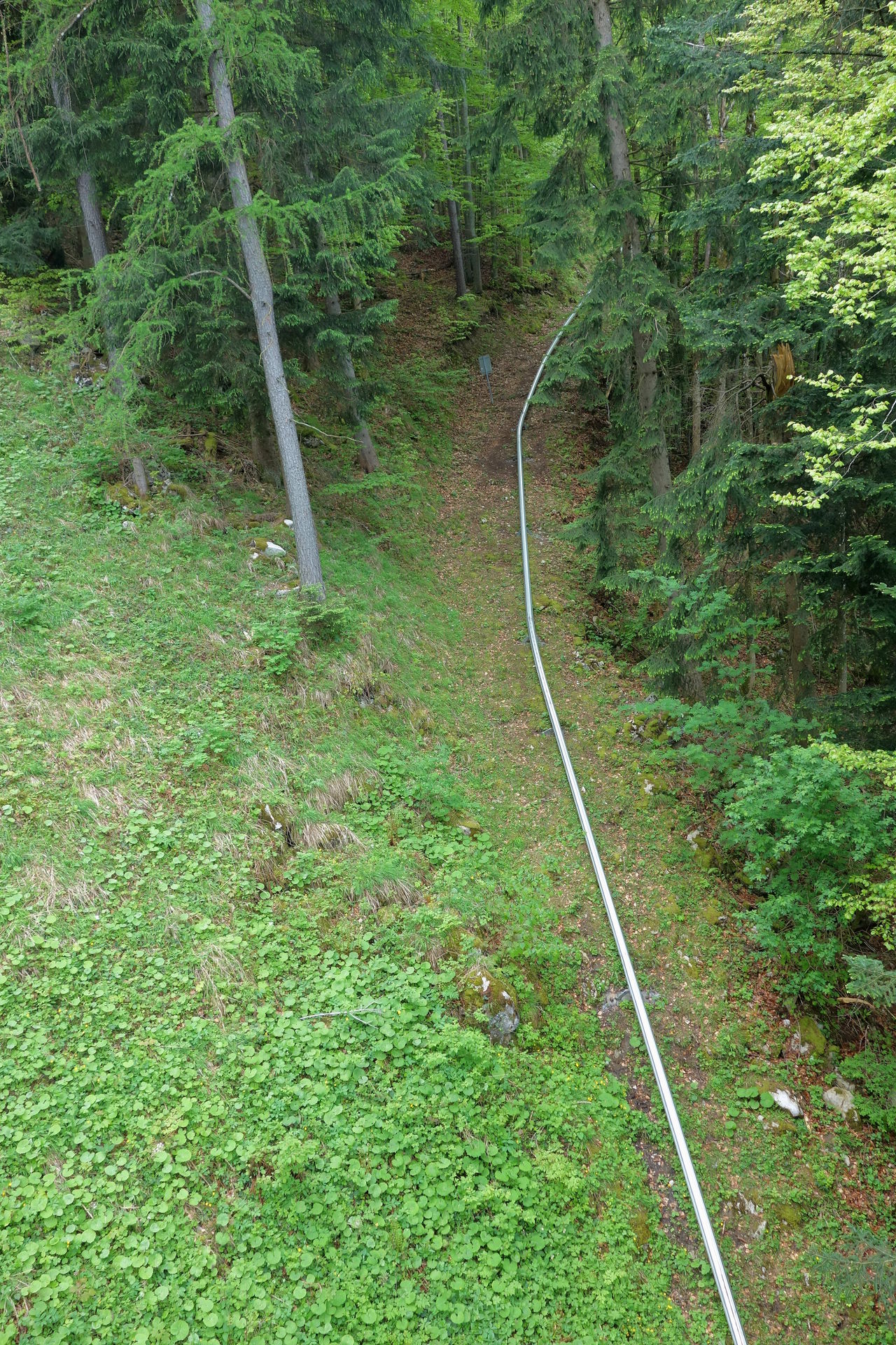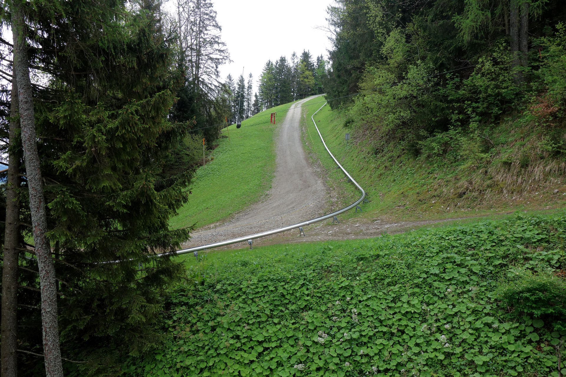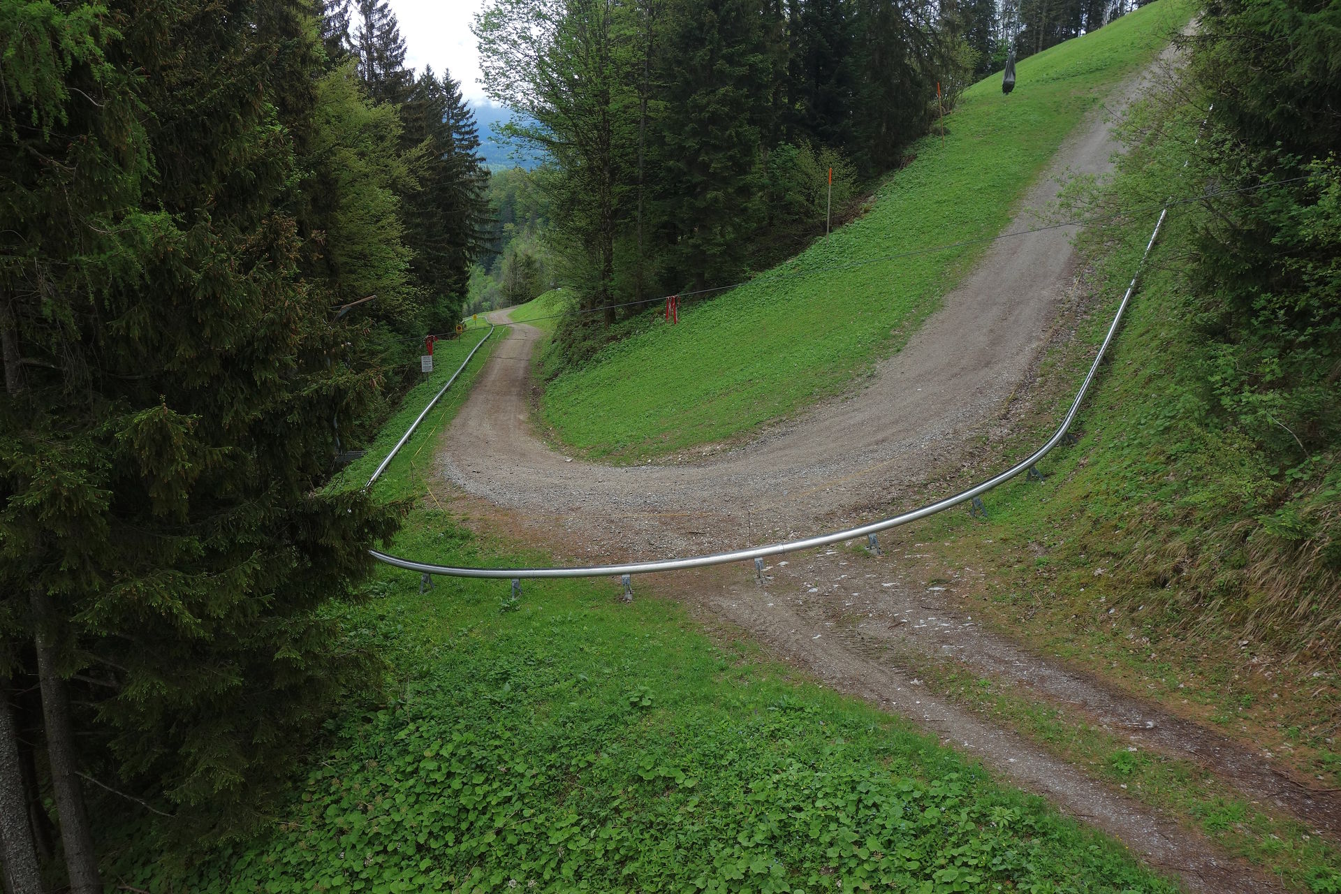 Die Fahrt beginnt recht unspektakulär entlang eines Wirtschaftsweges von der Seilbahntrasse weg in Richtung Osthang, mehr oder weniger gerade und nicht sonderlich steil. Aber dann löst sich die Strecke vom Weg und das Gefälle nimmt zu, hinein in eine erste steile Linkskurve. Danach flacht die Strecke wieder ab und folgt erneut einem weitestgehend geraden Weg zur Bergstation des oberen Zinkenlifts. Nach diesem Vorgeplänkel geht es anschließend aber richtig los.