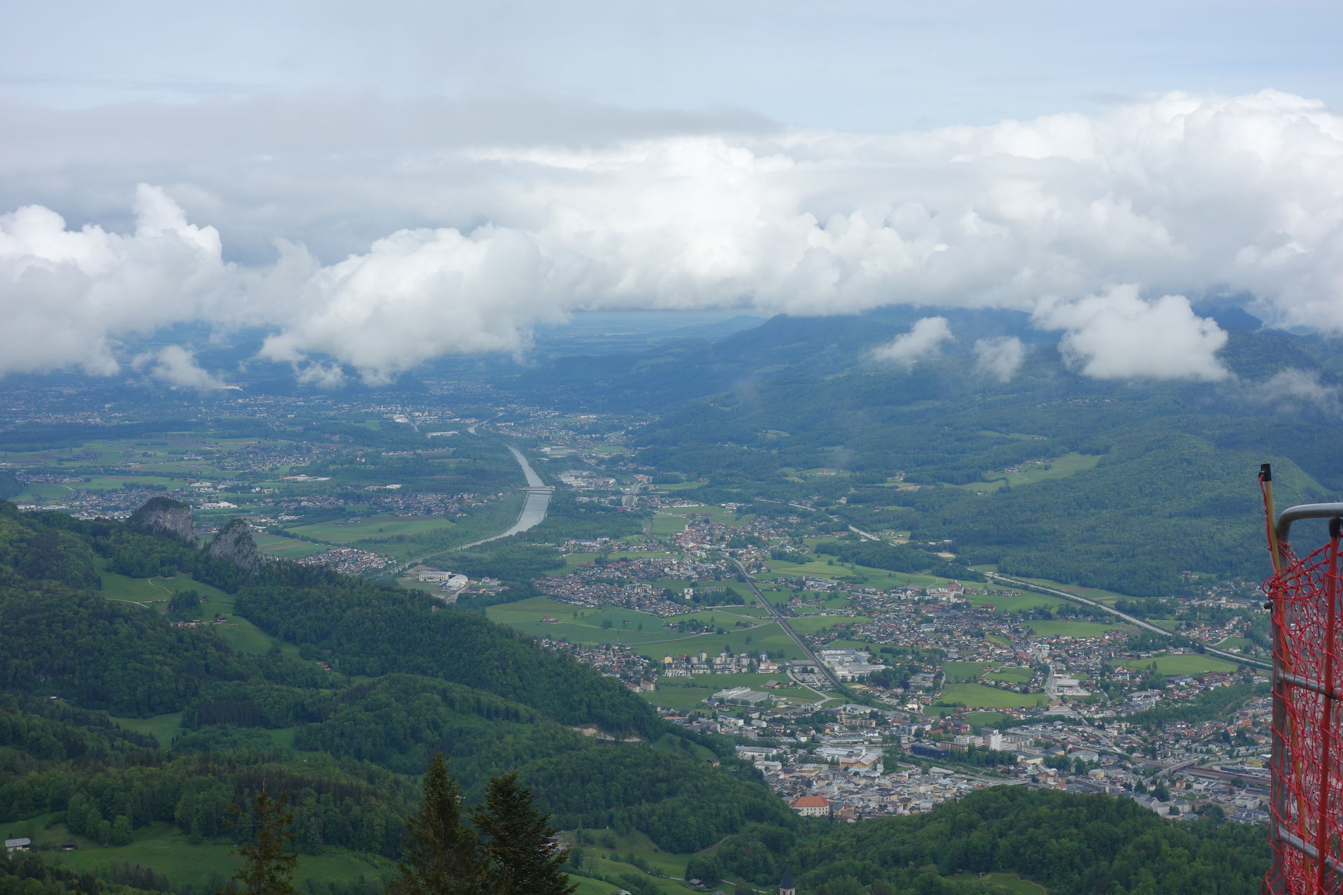 Relativ mittig am unteren Bildrand sticht ein orangerotes Dach heraus, das zur Halleiner Stadtpfarrkirche zu den Hll. Antonius Er. und Hieronymus gehört. Diese war 1193 erstmals urkundlich erwähnt worden und ab 1833 war ein gewisser Conrad Franz Xaver Gruber dort als Stadtpfarrchorregent tätig. Der hatte zuvor die Melodie zum heute bekanntesten Weihnachtslied Stille Nacht, heilige Nacht komponiert. Neben der Kirche gibt es daher ein Museum rund um das Leben und Wirken des Komponisten, sein Grab befindet sich auf dem Vorplatz. Von rechts unten ins Bild kommend ist die erwähnte Tauernautobahn zu erkennen, über die wir angereist waren. Sie kreuzt mit einer zu erahnenden Brücke die Salzach, welche anschließend in nördlicher Richtung weiter durch Salzburg fließt. Teile der Hauptstadt des gleichnamigen Bundeslandes sind unmittelbar unterhalb der Wolkendecke zu sehen.