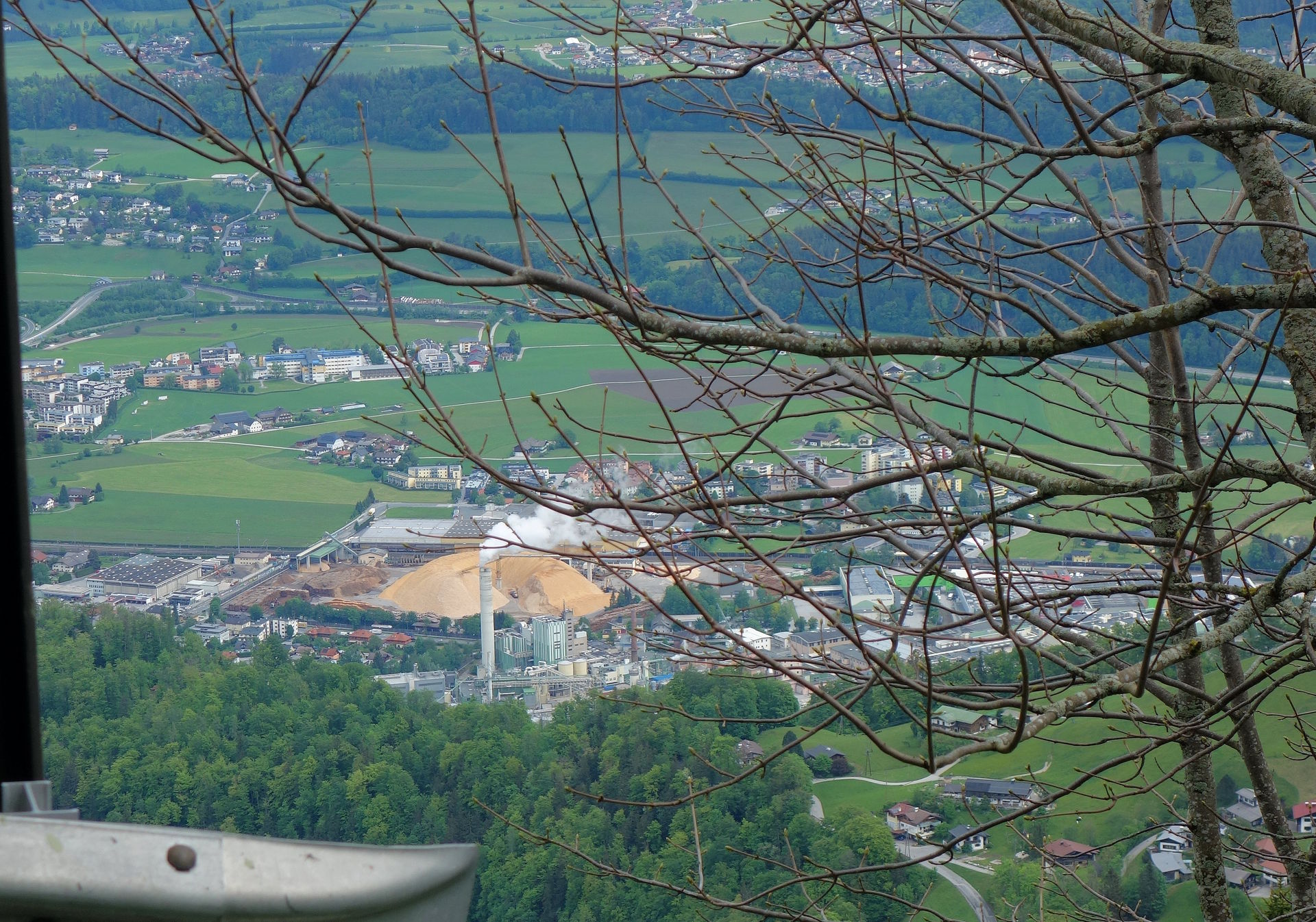 Mit bestem Blick auf Hallein - der hellbraune Haufen ist das Holzhackschnitzel-Lager des Zellstoffherstellers AustroCel.