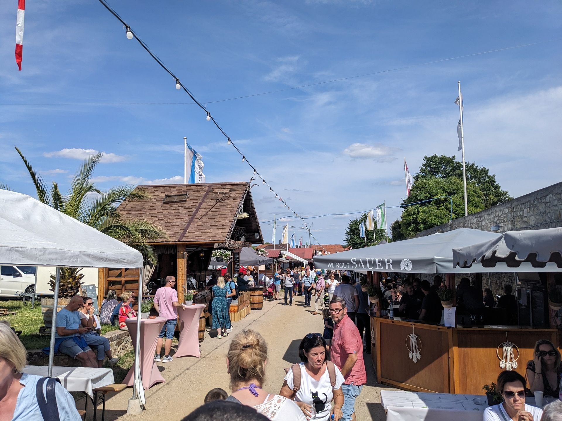 Im Wesentlichen ist das ein Weinfest. Die Weinstände und auch die restliche Gastronomie ziehen sich den Reichsritterstift hinauf bis in die Weinberge: