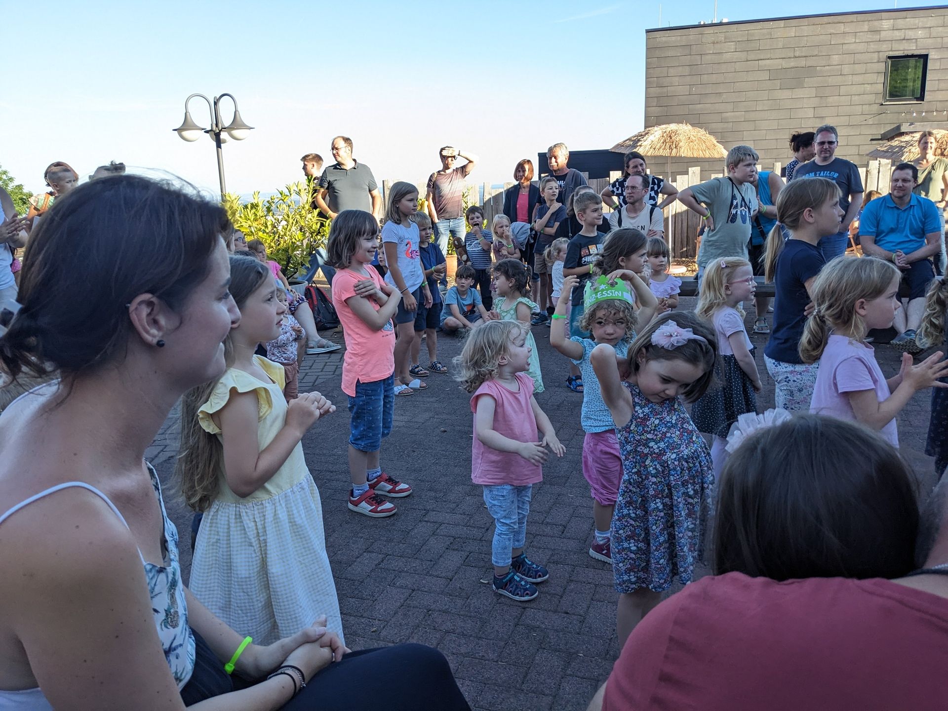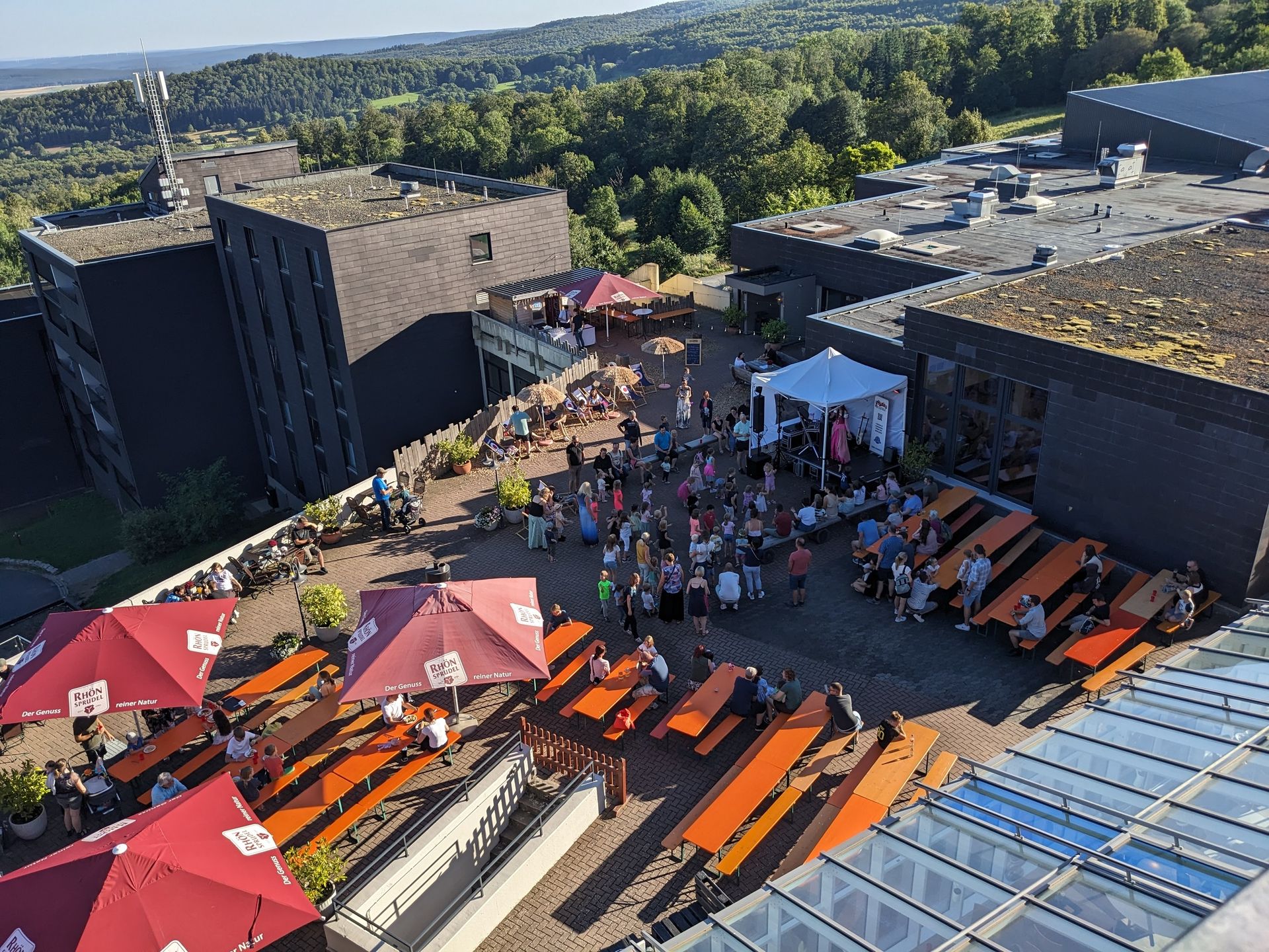 Blick auf die untere Terrasse, auf der (bei gutem Wetter) auch Teile des Animationsprogramms stattfinden: