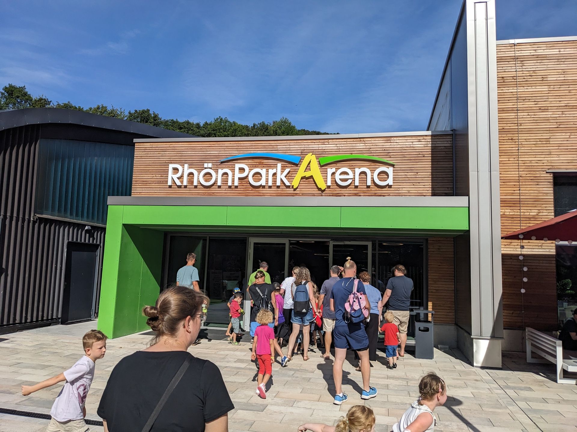 Und damit ist man auch schon fast bei der RhönPark Arena angekommen. Der linke Hallenteil besteht schon länger, vermutlich war das im Ursprung auch mal eine Tennishalle, und beherbergt einen Indoorspielplatz. Der Rest wurde erst vor kurzem angebaut. In der Mitte verbindet ein Foyer die Bereiche: