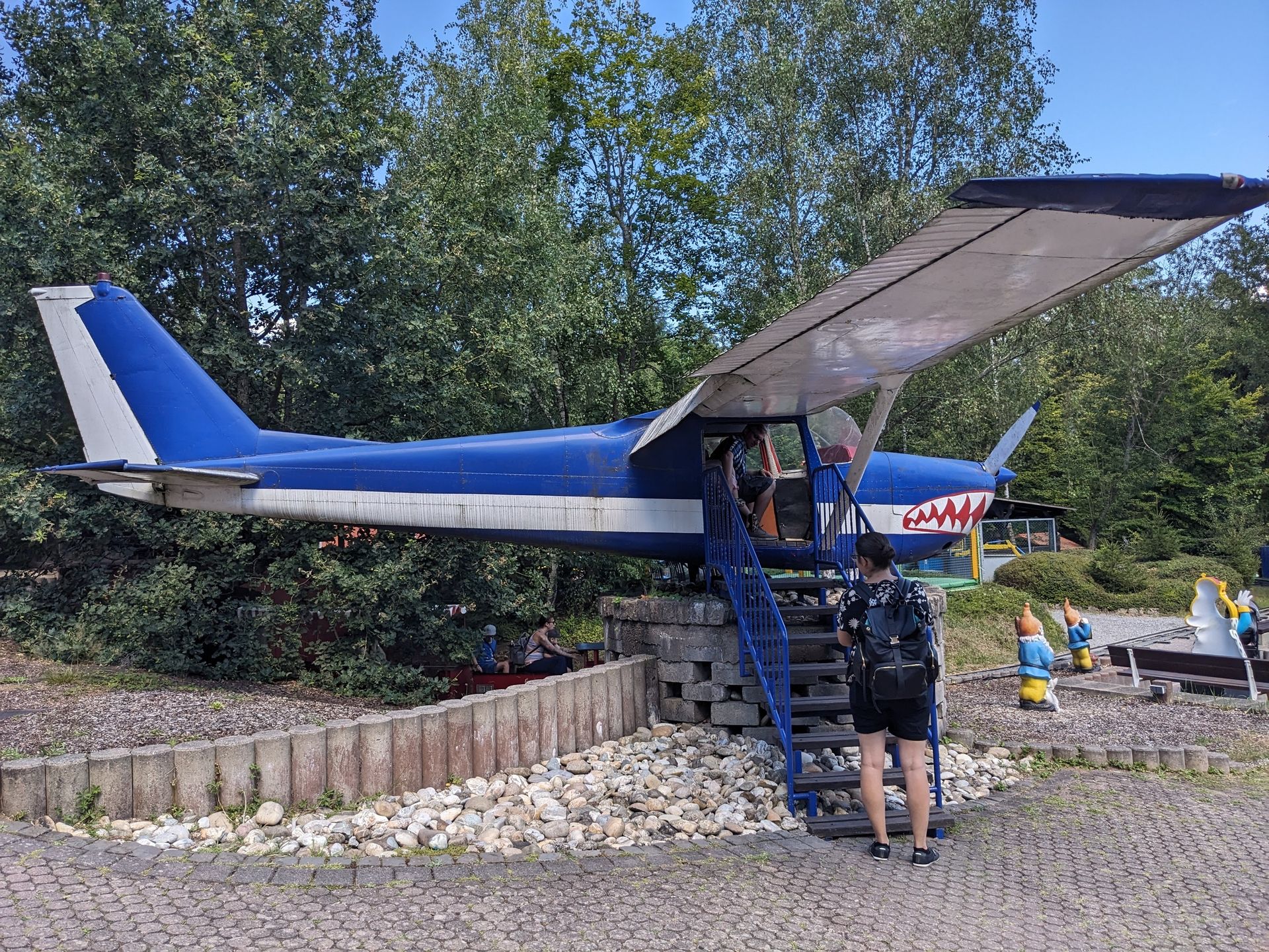 Gegenüber des Eingangs wartet ein Flugzeug auf Nachwuchspiloten: