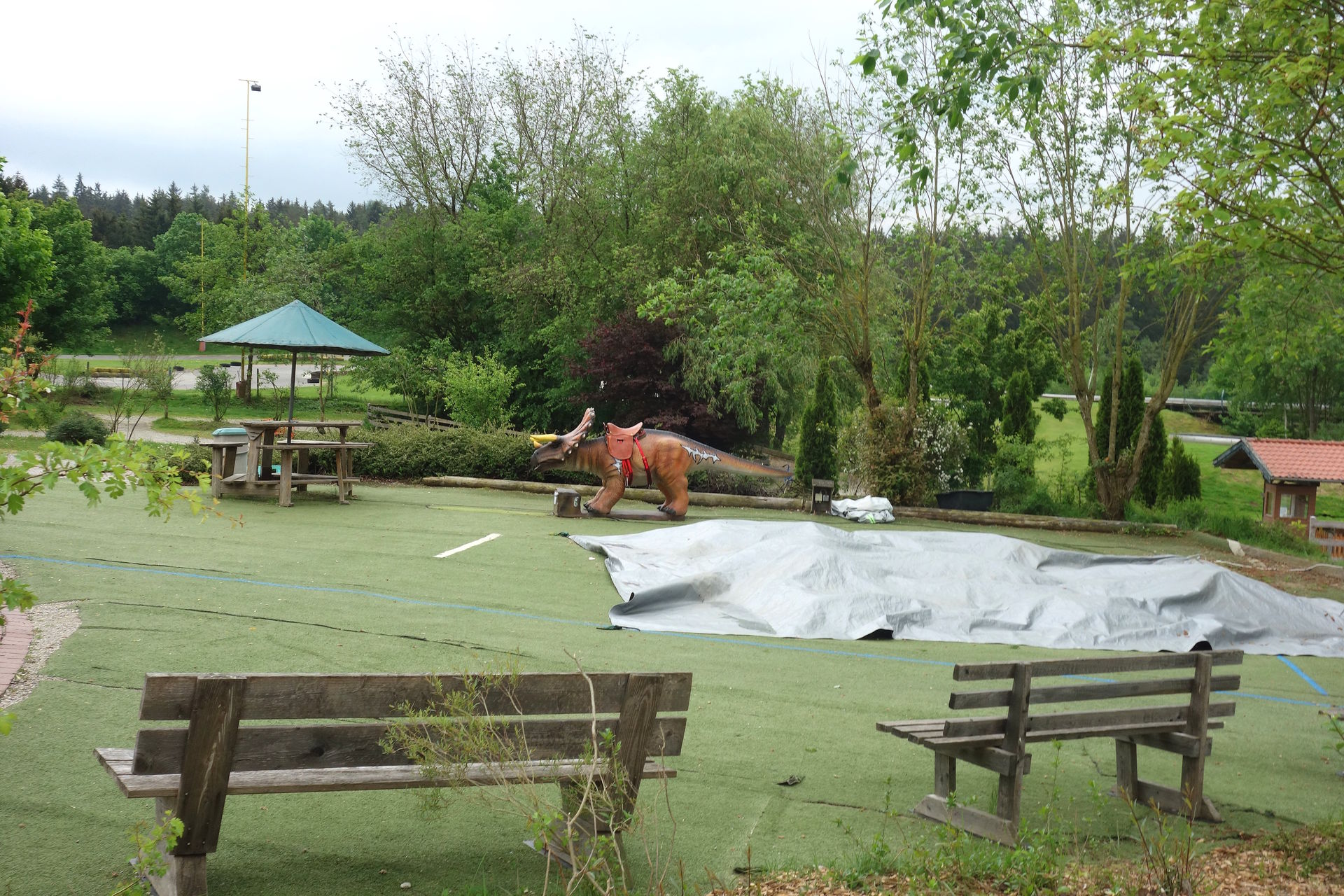 Abgesehen von einem Mitarbeiter, der den Rasen rund um die Minigolf-Anlage mähte, war zunächst auch keine Menschenseele zu sehen.