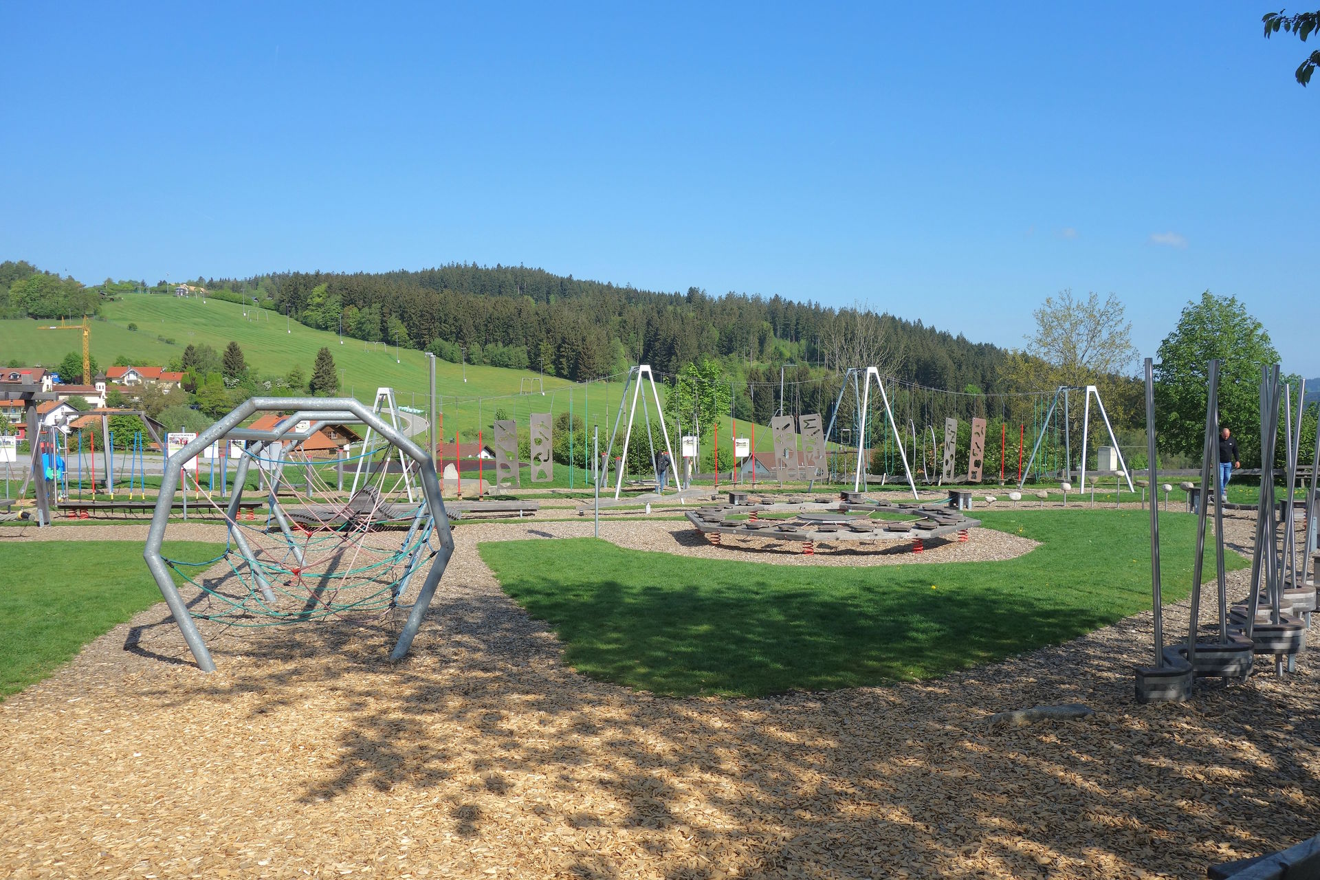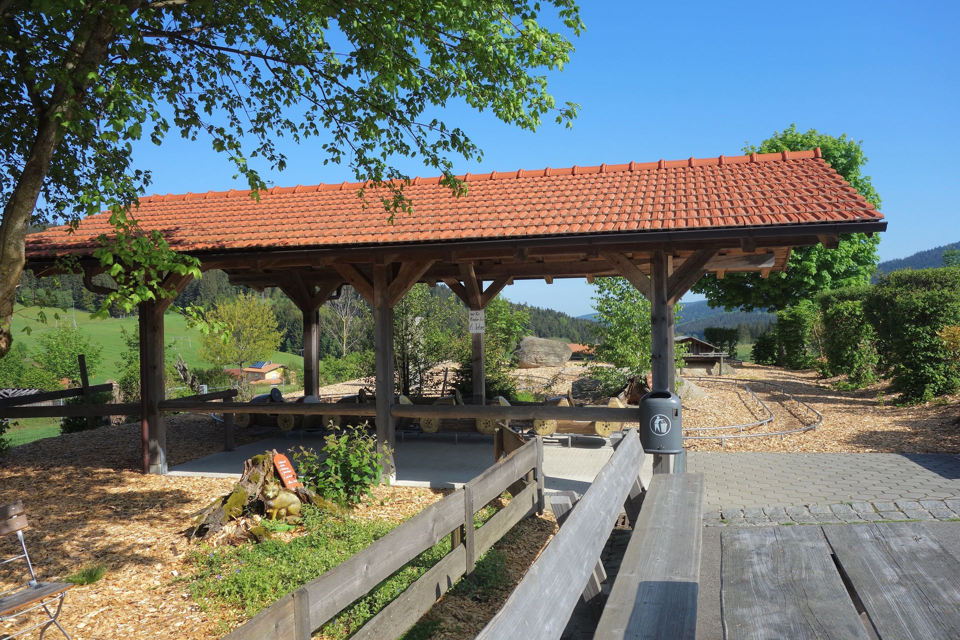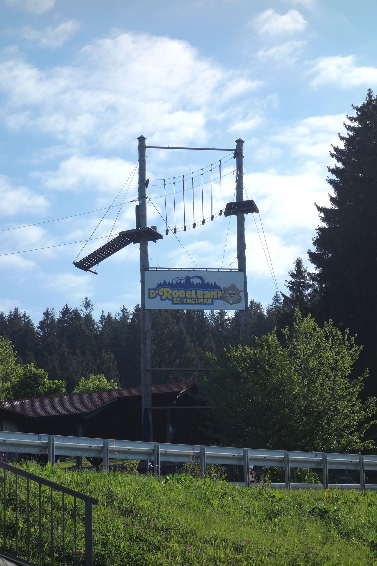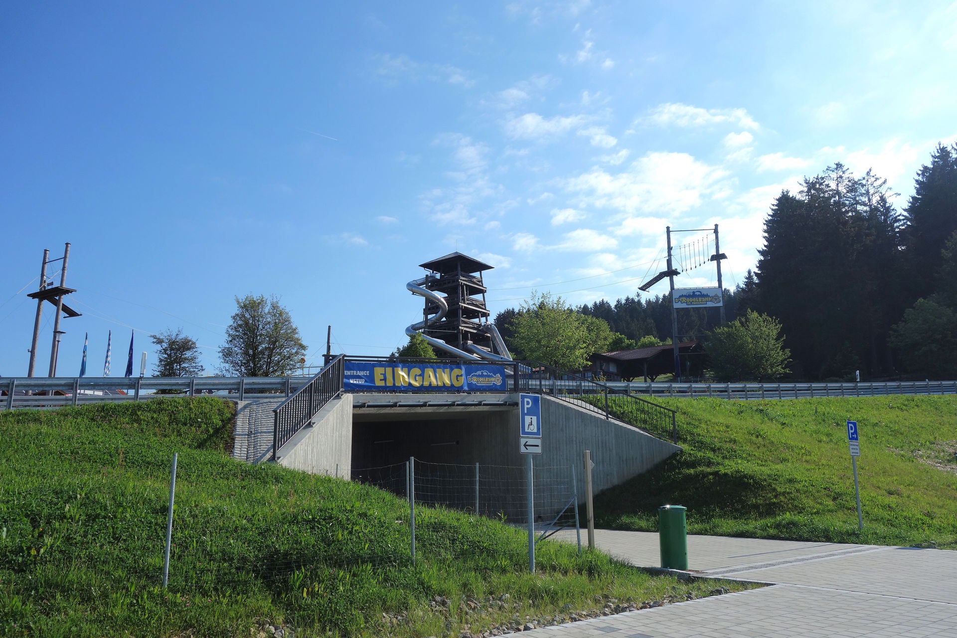 Der war 2007 eröffnet worden, damals aber noch ohne Rutschen. Wann die ergänzt wurden, konnte ich leider nicht herausfinden, könnte mir aber vorstellen, dass sie 2014 zusammen mit dem Bayerwald-Fox und dem dahinter liegenden Abenteuergolf mit 12 Löchern installiert wurden. Im Wald daneben wurde 2017 zudem der Kuglwoid - eine große Kugelbahn-Anlage, die in Eigenregie entstand - eröffnet. Für diese Attraktionen gibt es weder Chips noch Gauditaler, man zahlt sie einfach direkt. Den Kuglwoid kann man für 2€ uneingeschränkt erkunden, für die Holzkugeln werden zudem 10€ Pfand erhoben. Eine Runde Abenteuergolf kostet 4€, hier werden für Schläger und Ball 2€ Pfand aufgerufen. Der Bayerwald-Fox kostet 7€, der Aussichtsturm an sich und die Rutschen sind kostenfrei nutzbar. Alle genannten Preise gelten für Erwachsene, Kinder und Gruppen sind natürlich etwas günstiger. Beim Bayerwald-Fox handelt es sich um eine Seilrutsche, die auf 6 Etappen eine Strecke von fast 300 Metern überwindet. Aus dem zweitobersten Stockwerk des Aussichtsturms führt die erste Etappe knapp 30 Meter Richtung Straße, wo man - wie im allerersten Bild zu sehen - über Balken nochmal ein wenig Höhe aufbaut.
