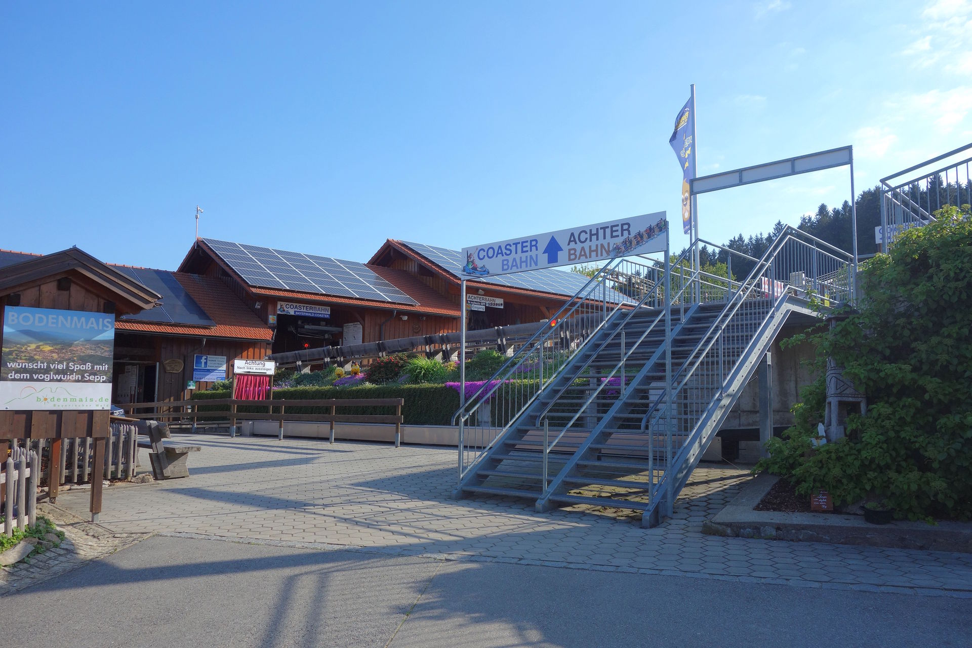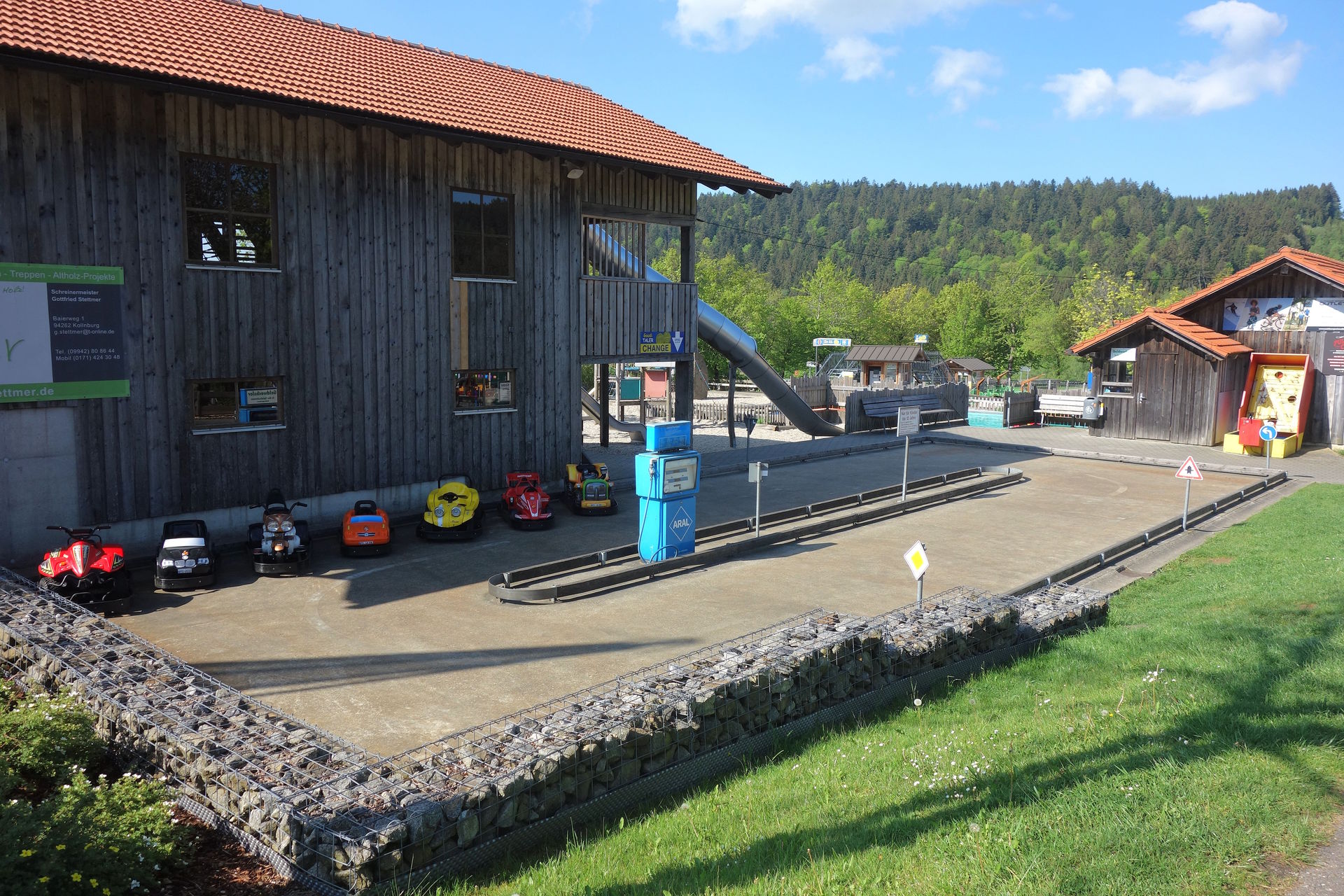 Gut 3 Kilometer weiter hatte 1952 bei Markbuchen am Fuße des 1.024 Meter hohen Predigtstuhls ein erster, einfacher Skilift eröffnet. Zehn Jahre später wurde daraus ein richtiger Schlepplift, dem zahlreiche weitere Lifte rund um Sankt Englmar folgten - bis Ende der 80er waren es ganze 18 Lifte. So auch am Westhang des sich zwischen Grün und Sankt Egidi auf etwas über 870 Meter erhebenden Egidi-Buckels. Bei so viel Konkurrenz kann man sich denken, dass nicht allen Liften eine rosige Zukunft beschieden war. So stand wohl auch der Egidi-Lift seit 1987 still, weshalb die damaligen Betreiber sicherlich froh waren, als die Grundstückseigentümer sie Mitte der 90er von der trotz allem zu zahlenden Pacht erlösten. Elfriede Bindl hatte die Idee, das Gelände für eine Sommerrodelbahn zu nutzen. Auch wenn der alte Schlepplift entgegen der ersten Planungen nicht für den Bergtransport der Schlitten genutzt werden konnte, wurde der Bayerwald-Bob zusammen mit einem Imbiss samt Spielplatz schließlich 1998 eröffnet. Gleich im ersten Jahr wurde D'Rodelbahn von 50.000 Menschen besucht und so machten sich Elfriede und ihr Mann Franz schon bald Gedanken darüber, wie sie den Erfolg auch auf Tage mit schlechterem Wetter ausweiten könnten. Die Lösung war ein Alpine Coaster, sodass 2008 der Bayerwald-Coaster das Angebot ergänzte. Ab 2012 erfolgte der kontinuierliche Ausbau mit zahlreichen weiteren Attraktionen zum Rodel- und Freizeitparadies - inklusive richtiger Achterbahn im Jahr 2016. Inzwischen sind die einstigen Geschäftspartner ausgestiegen, dafür hat Sohn Maximilian 2020 die Geschäftsführung übernommen und auch die drei anderen Kinder helfen natürlich fleißig im Familienunternehmen mit. Aber zurück zu unserem Feiertags-Besuch.