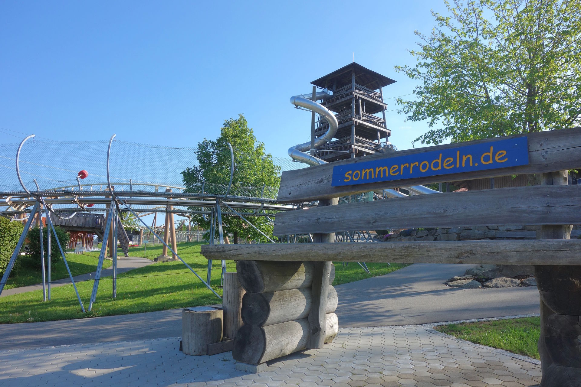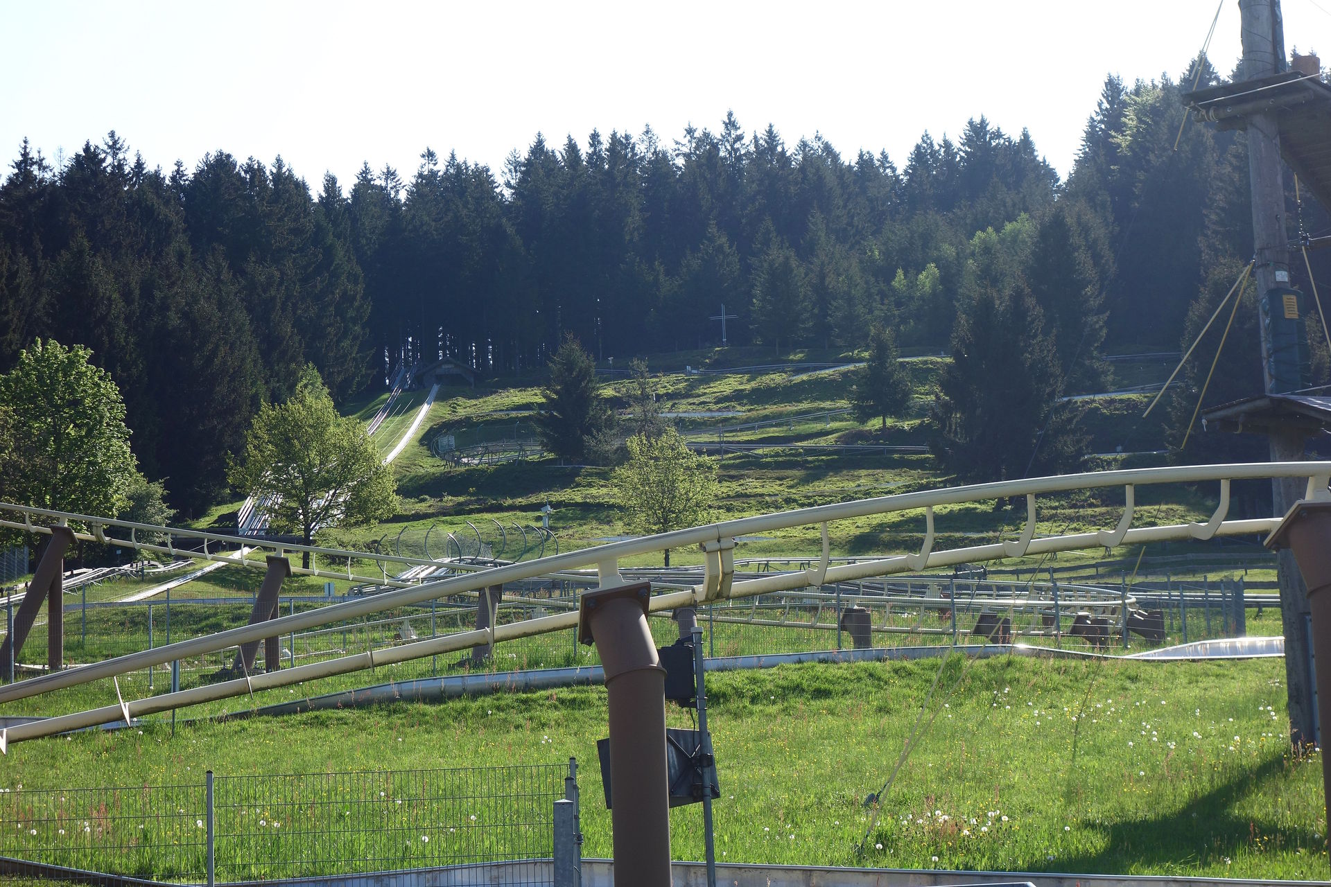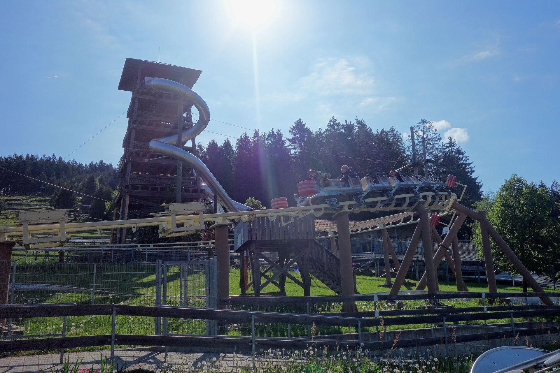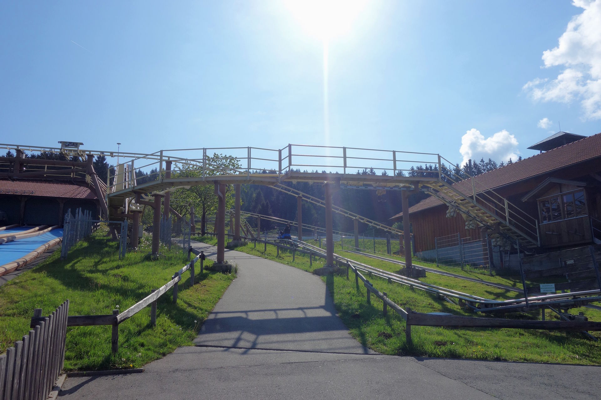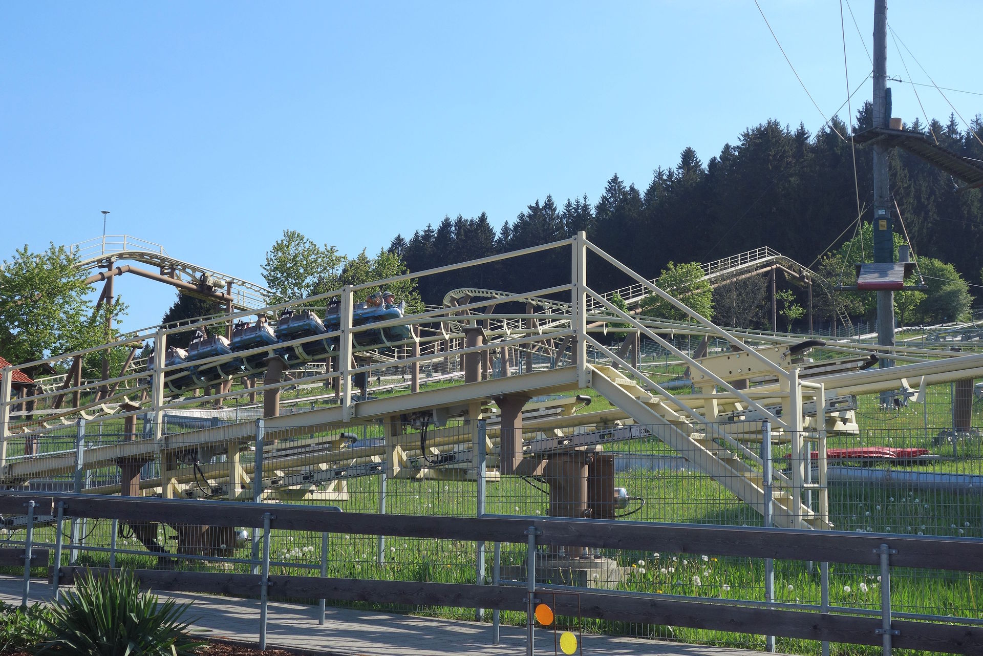Zierer gefertigt - wohl nicht zuletzt, weil Parkbetreiber Franz Bindl früher selbst dort gearbeitet hatte. Bei rcdb und Konsorten wird die Bahn als einzige Auslieferung des Rock Runners gelistet - der auf der Webseite des Herstellers keine Erwähnung mehr findet. Letztlich handelte es sich einfach um einen gesonderten Namen für Terrain Coaster aus der Force-Reihe. Drei Züge besitzt die Bahn, das war an diesem Morgen definitiv noch zu viel, auch wenn sie nur aus jeweils fünf zweisitzigen Wagen bestehen. Daher war nur ein einzelner Zug auf der Strecke. Passend zu den drei Zügen gibt es auch drei Lifthills. Einmal ein kleiner mit Reibrädern, der aus der Station heraus über die Lifte der Rodelbahnen und einen Weg führt.