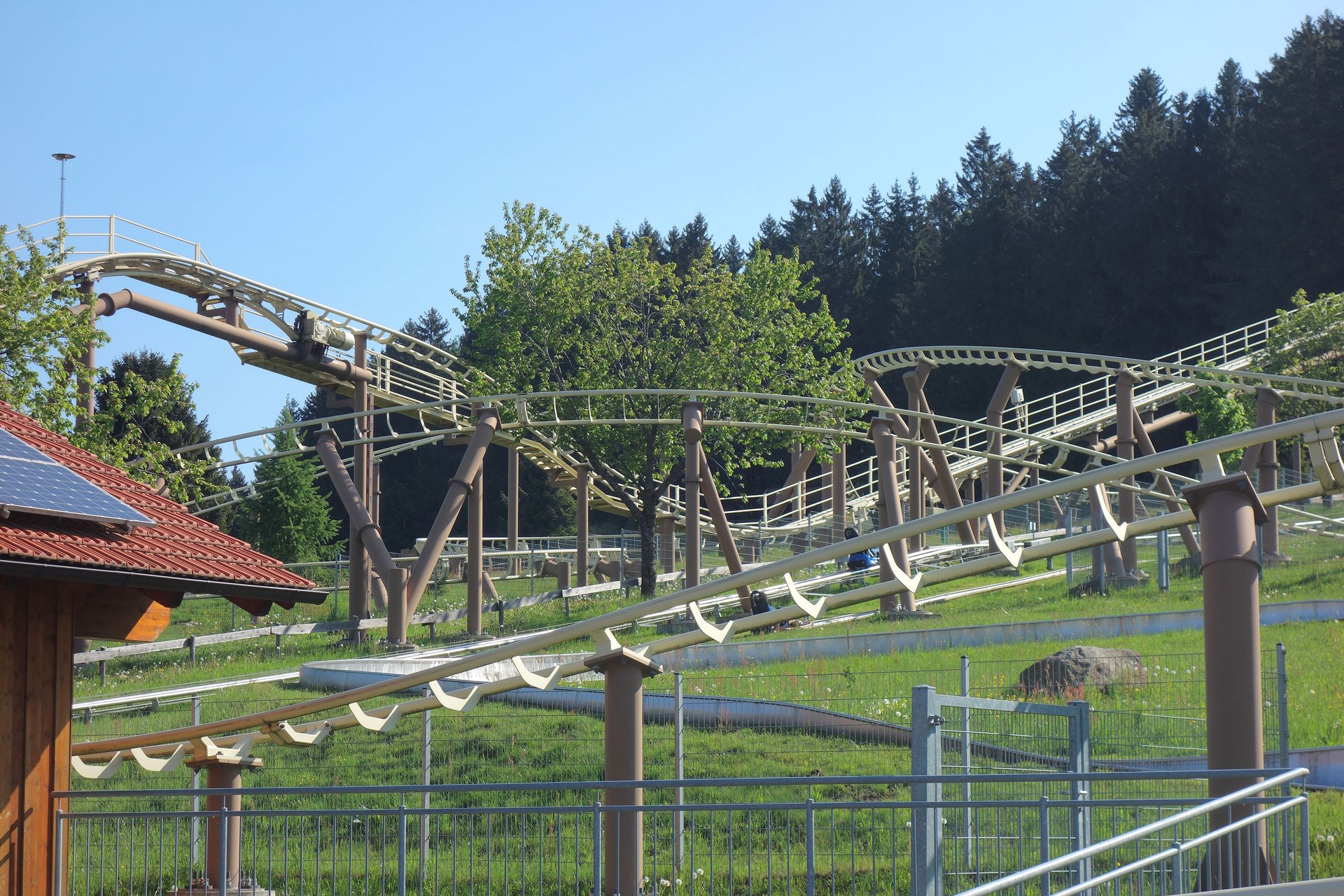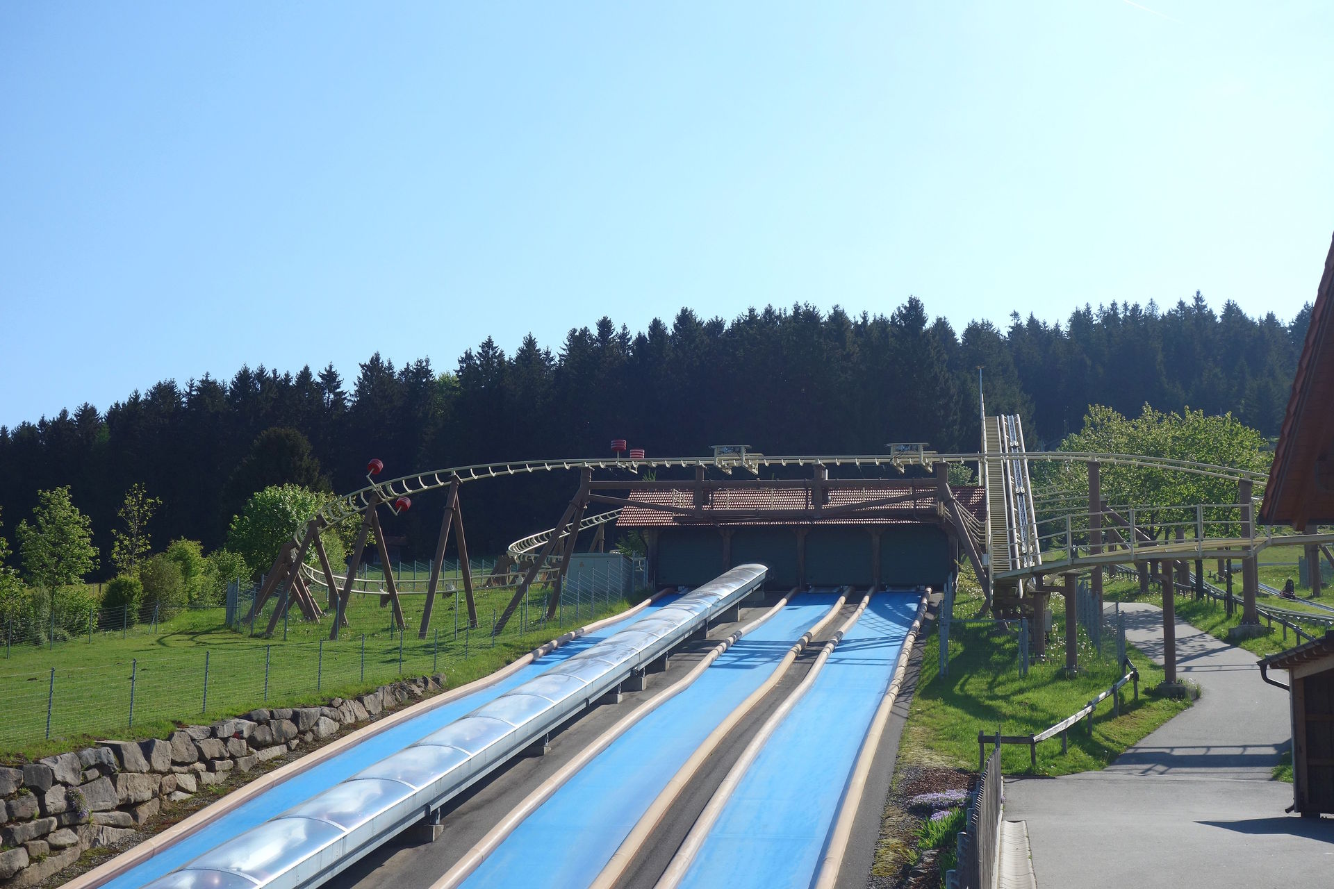Kreisel führt. Danach wird erneut die Wannenbahn gekreuzt, die anschließende Linkskurve wird in Etappen absolviert und von kleineren Jumps unterbrochen, wobei sie abermals den Bob kreuzt. Schließlich noch drei Serpentinenkurven mehr oder weniger parallel zur Wannenbahn, dann ist auch hier der Ausstieg erreicht. Sowohl der Bayerwald-Bob als auch der Bayerwald-Coaster haben mir sehr gut gefallen. Letzterer vor allem, weil die Magnetbremsen nur wenige Meter nach dem Lift und für eine sanfte Verzögerung in der letzten Serpentine vor dem Ausstieg zum Einsatz kommen. Die eigentliche Strecke kann man ungestört absolvieren.