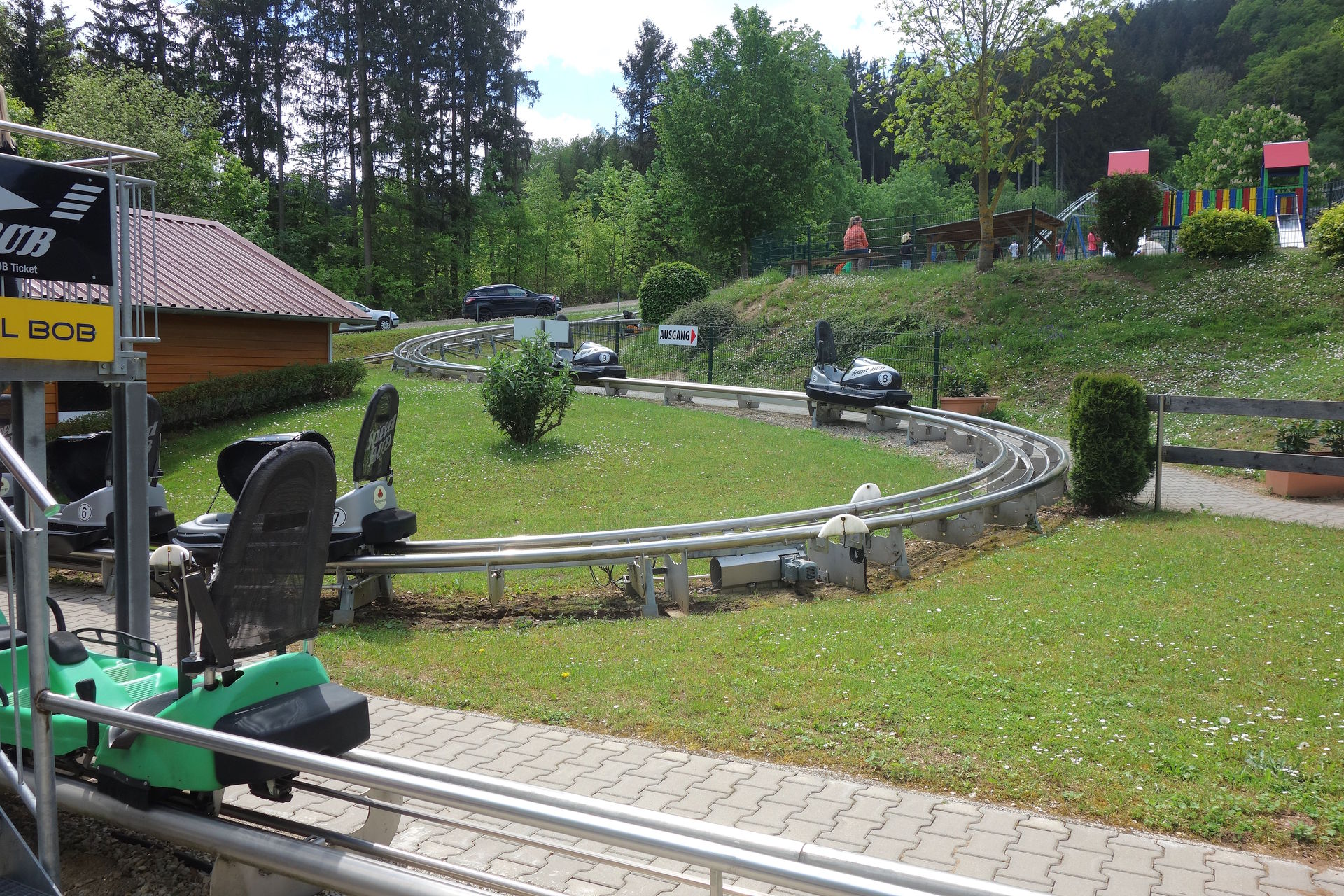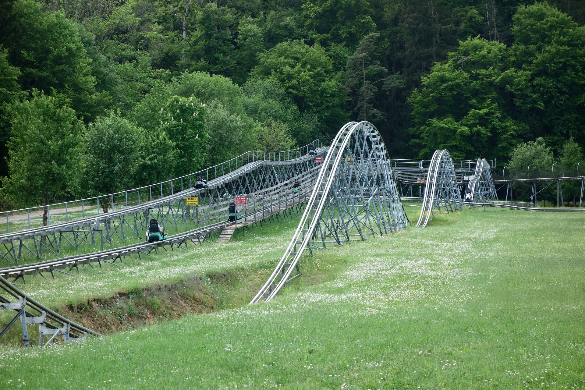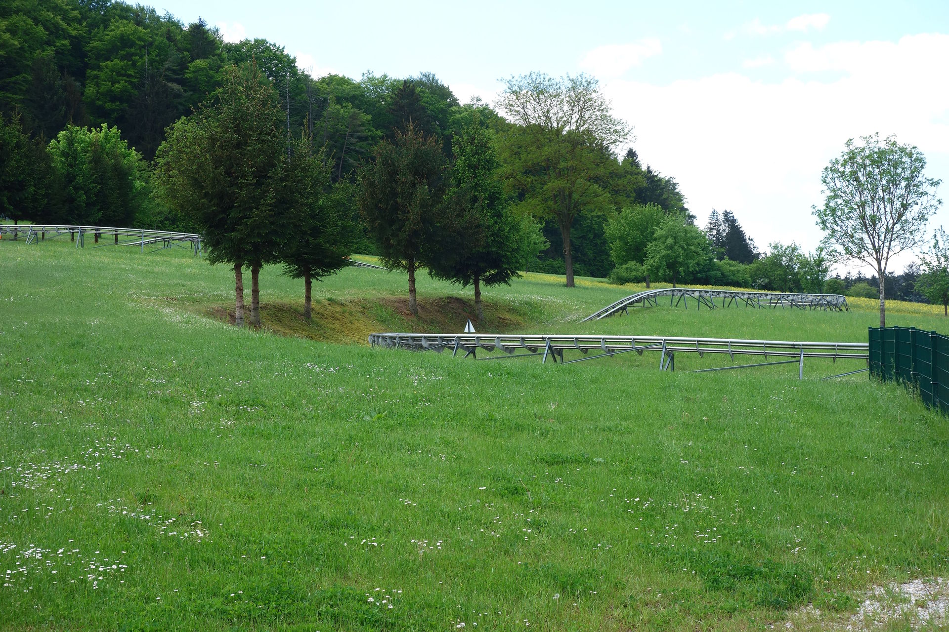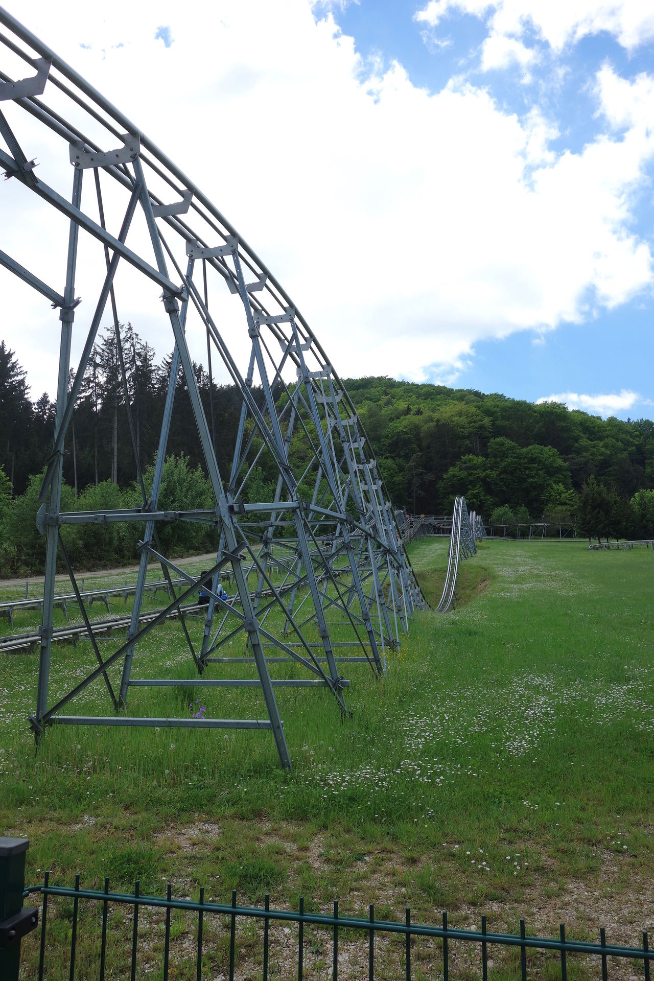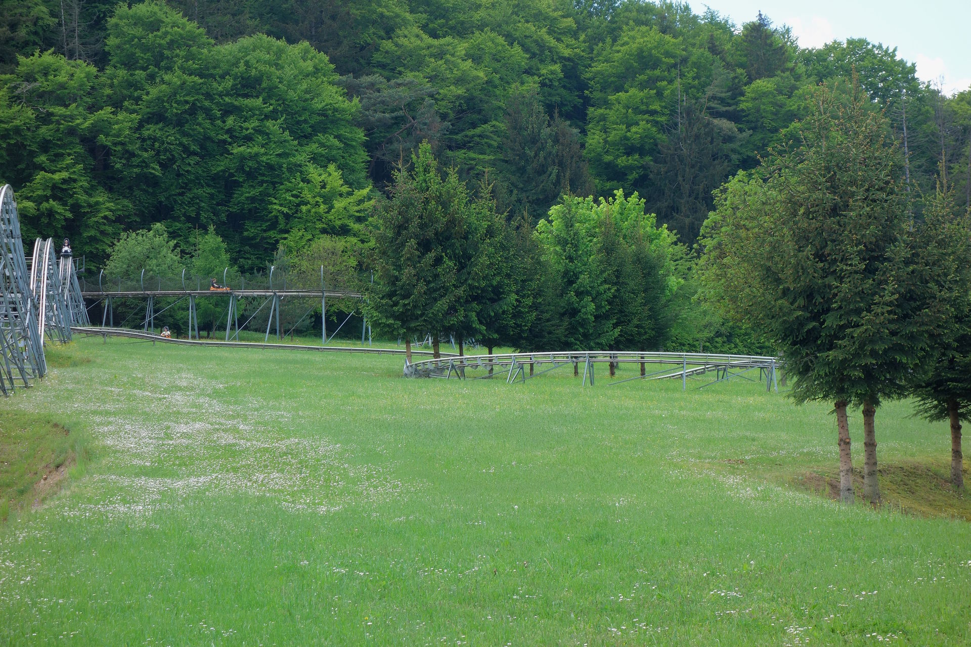 Fazit: So ganz optimal scheint mir der ausgewählte Hang für eine Sommerrodelbahn nicht zu sein, wenn man den Start schon so weit aufständern muss. Dafür sieht man im weiteren Verlauf dann an mehreren Stellen, dass Erdreich abgetragen werden musste, um das Layout wie gewünscht umsetzen zu können. Das Layout ist bis auf den schwachen Start soweit in Ordnung, so ein richtiges Highlight fehlt aber. Ähnliches gilt für den Speed Coaster, der passt sich halt mal so gar nicht ins Gelände ein und sieht einfach nur hässlich aus. Dass man sich hier voll auf die