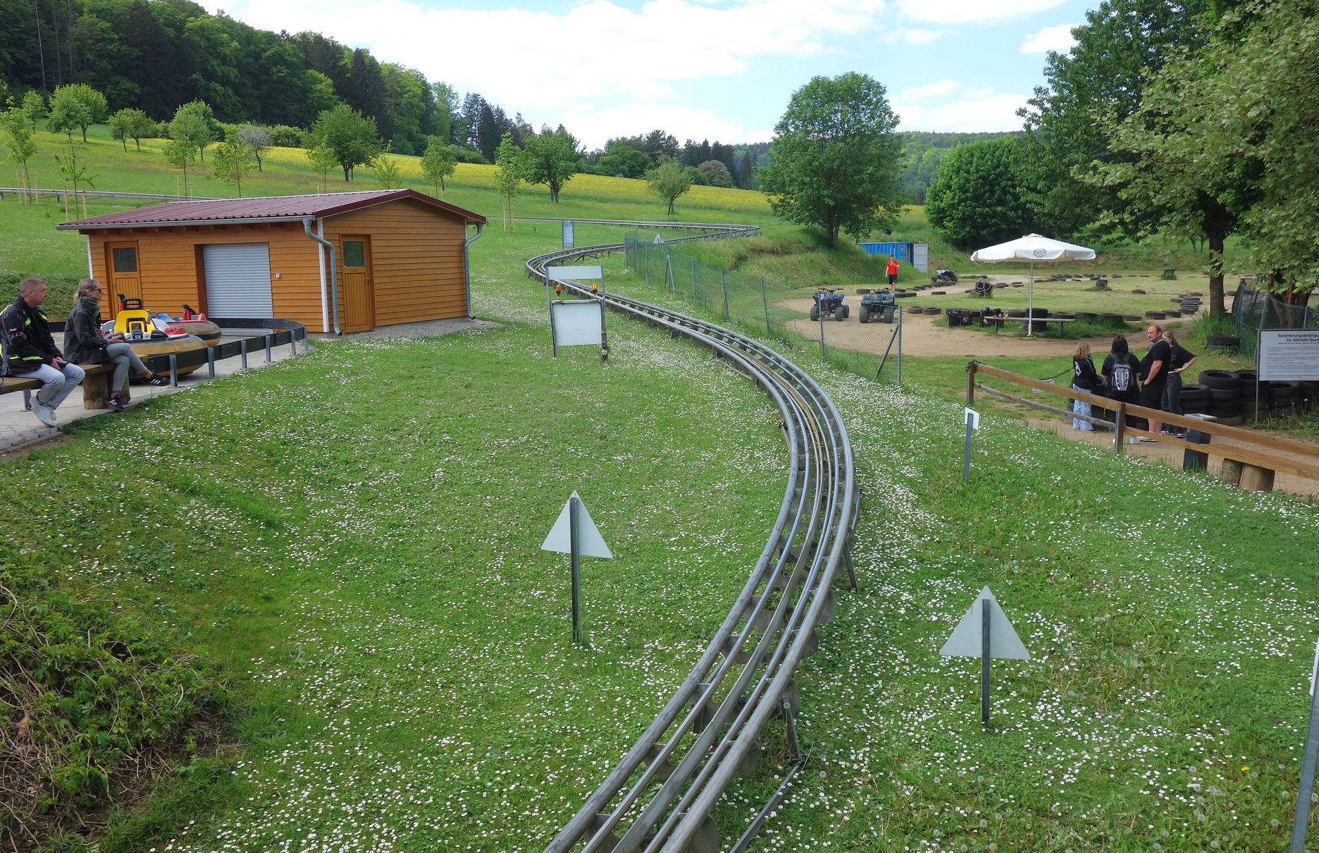 Kreisel zu Beginn kommt man untenraus auch dank der beiden Jumps doch noch auf eine vernünftige Geschwindigkeit. Oder würde man kommen, wenn man an einem leeren Tag da wäre. Bei dem Feiertags-Andrang wurden die Schlitten natürlich in einer extrem engen Taktung rausgeschickt, sodass ein ungebremstes Absolvieren des Kurses kaum möglich war. So richtige Bremser blieben uns aber glücklicherweise erspart, wenn ich mich recht entsinne. Altersbedingt kommt der AltmühlBOB zudem etwas ruppig daher mit Schienenstößen, die ihrem Namen alle Ehre machen. Eine knappe Stunde hatten wir für beide Fahrten gebraucht, dann machten wir uns umgehend wieder auf den Weg zum Auto. Denn ein letztes Ziel hatten wir noch vor uns.
