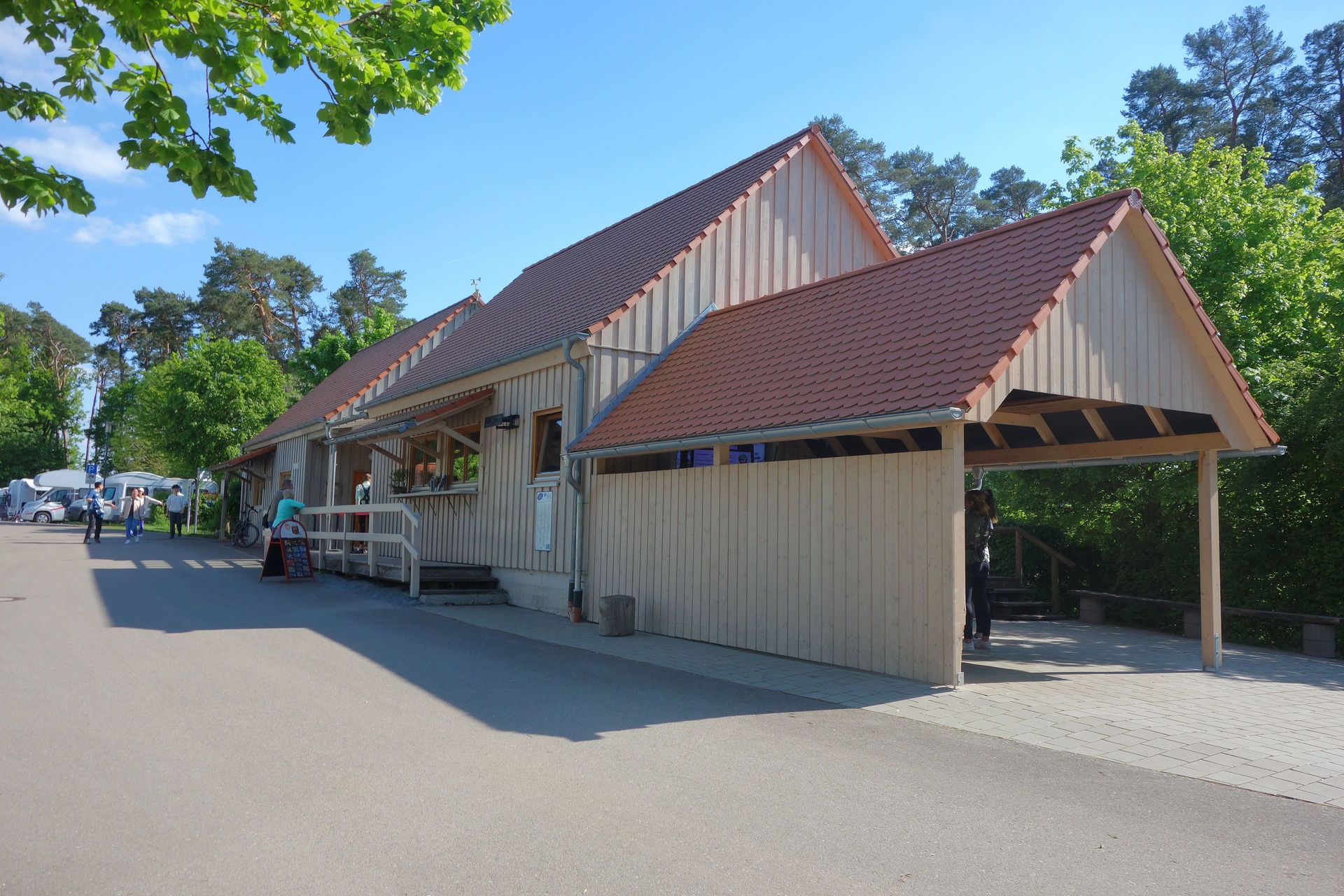 Aus Riedenburg ging es weitere rund 100 km weiter nach Westen - und über die A9 auch ein Stückchen nach Norden - bis nach Mittelfranken. Unser viertes Feiertags-Ziel war der größte Stausee des Fränkischen Seenlands, der von 1983 bis 1999 mithilfe eines 1,7 km langen Erddamms aufgestaut wurde. Dem großen Brombachsee sind als Vorsperren der über einen künstlichen Überleiter aus dem Altmühlsee und dem namensgebenden Brombach gespeiste kleine Brombachsee, sowie der vom Igelsbach gespeiste Igelsbachsee vorgelagert, die jeweils mit Zwischendämmen (1,1 und 0,6 km lang) vom eigentlichen Stausee abgetrennt werden. Direkt am Damm des Igelsbachsees liegt das zu Spalt gehörende Dorf Enderndorf und westlich davon am nördlichen Seeufer der Abenteuerwald Enderndorf, den wir gegen 15:20 Uhr erreichten. Auch hier war der große Parkplatz erwartungsgemäß gut gefüllt, wir fanden aber tatsächlich noch eine Lücke recht weit vorne und zahlten die auch hier fälligen 2€ Parkgebühren.