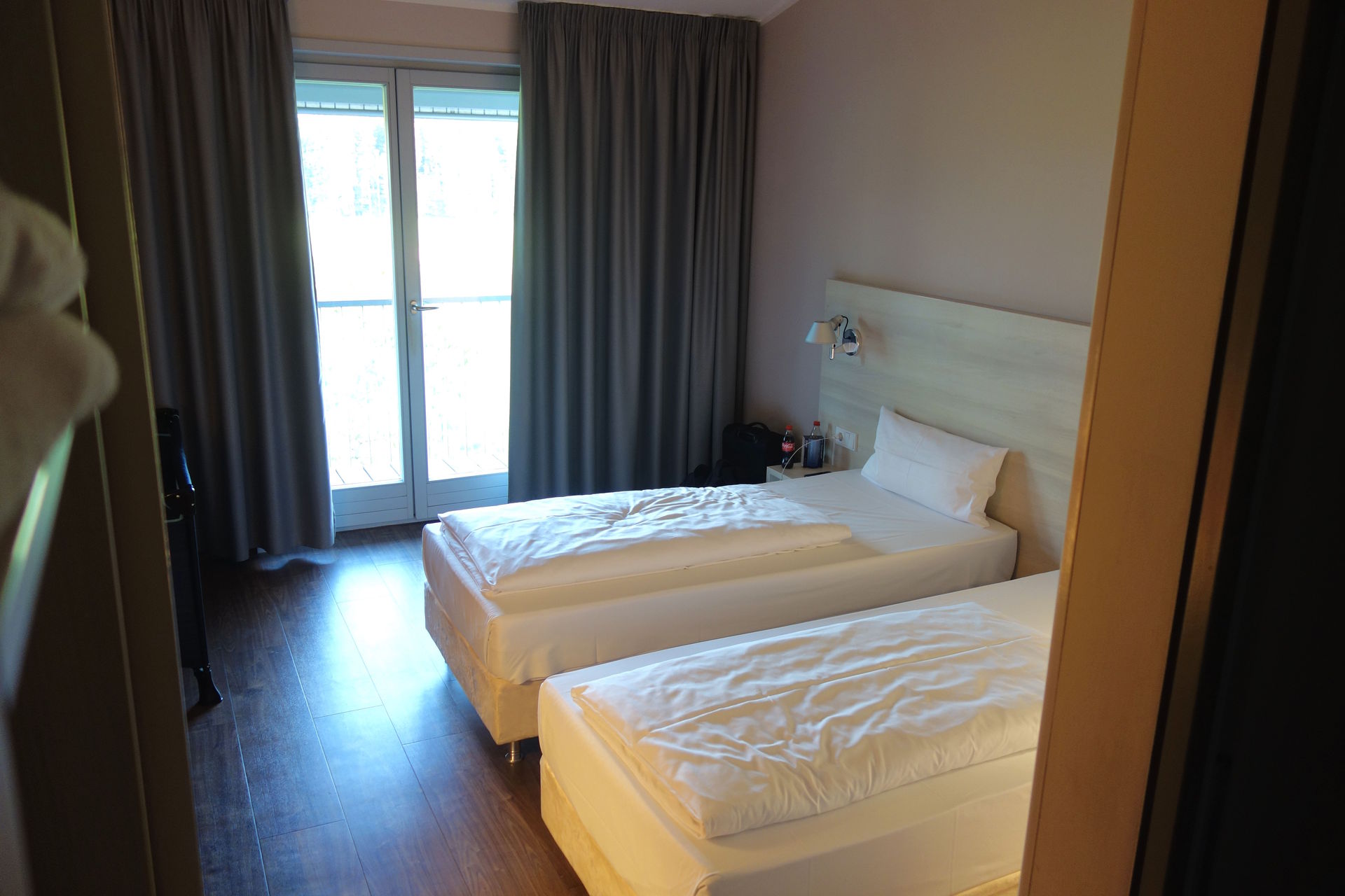 So kamen nochmal über 200 km hinzu, bis wir inklusive dringend nötiger Essenspause gute drei Stunden später auf die Rastanlage Irschenberg Süd abfuhren. Zu dieser gehört auch ein Motel bzw. Hotel, wo wir uns für günstige 80€ einquartiert hatten. Tatsächlich hatte ich diese Unterkunft schon für die ursprüngliche Planung im Auge, aber wegen der Lage direkt an der Autobahn war ich skeptisch. Der optisch eher an Garagen erinnernde Motel-Anbau direkt neben dem Parkplatz sah auch nicht unbedingt einladend aus. Aber nachdem wir in der Raststätte eingecheckt hatten, verflogen die Zweifel recht schnell. Der Gebäudeteil direkt am Parkplatz scheint nur die Vierbettzimmer zu beherbergen. Für uns ging es über eine verglaste Brücke zu einem separat dahinter liegenden Gebäude, dessen drei Etagen dank der Hanglage quasi unterhalb des Rastplatzniveaus liegen.