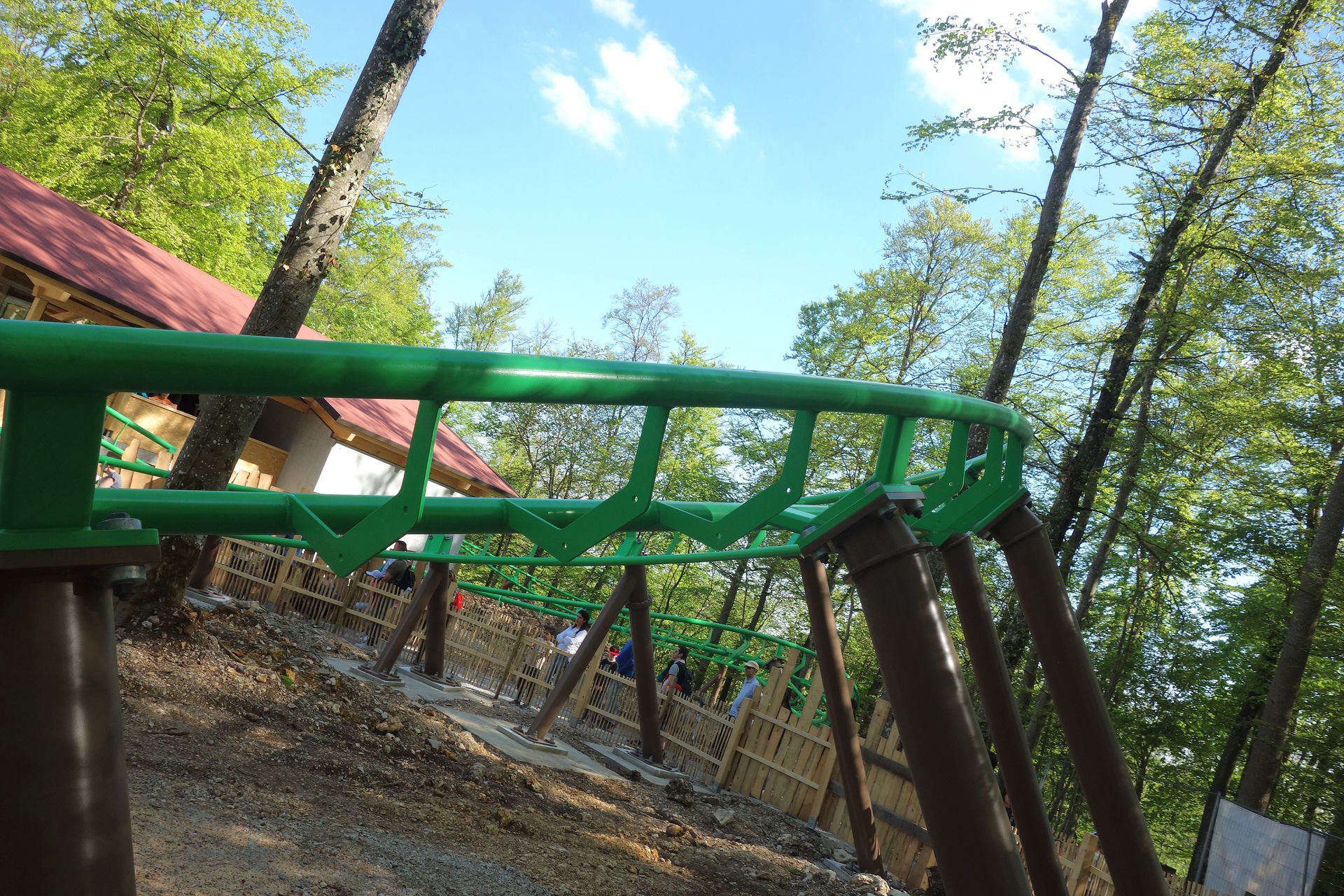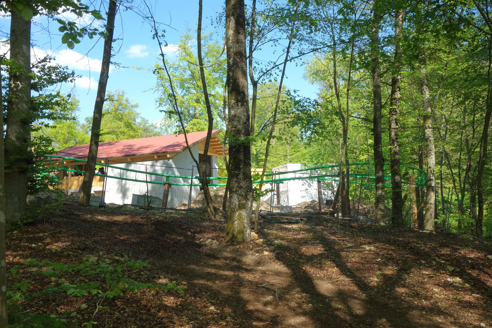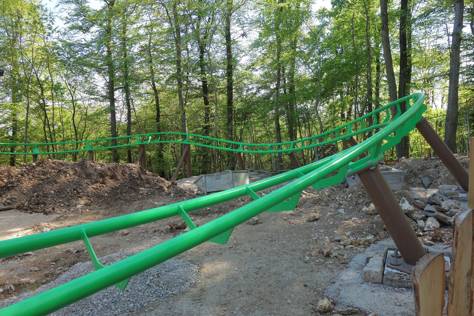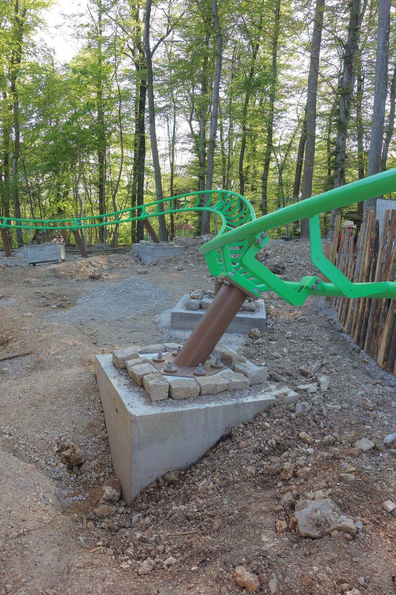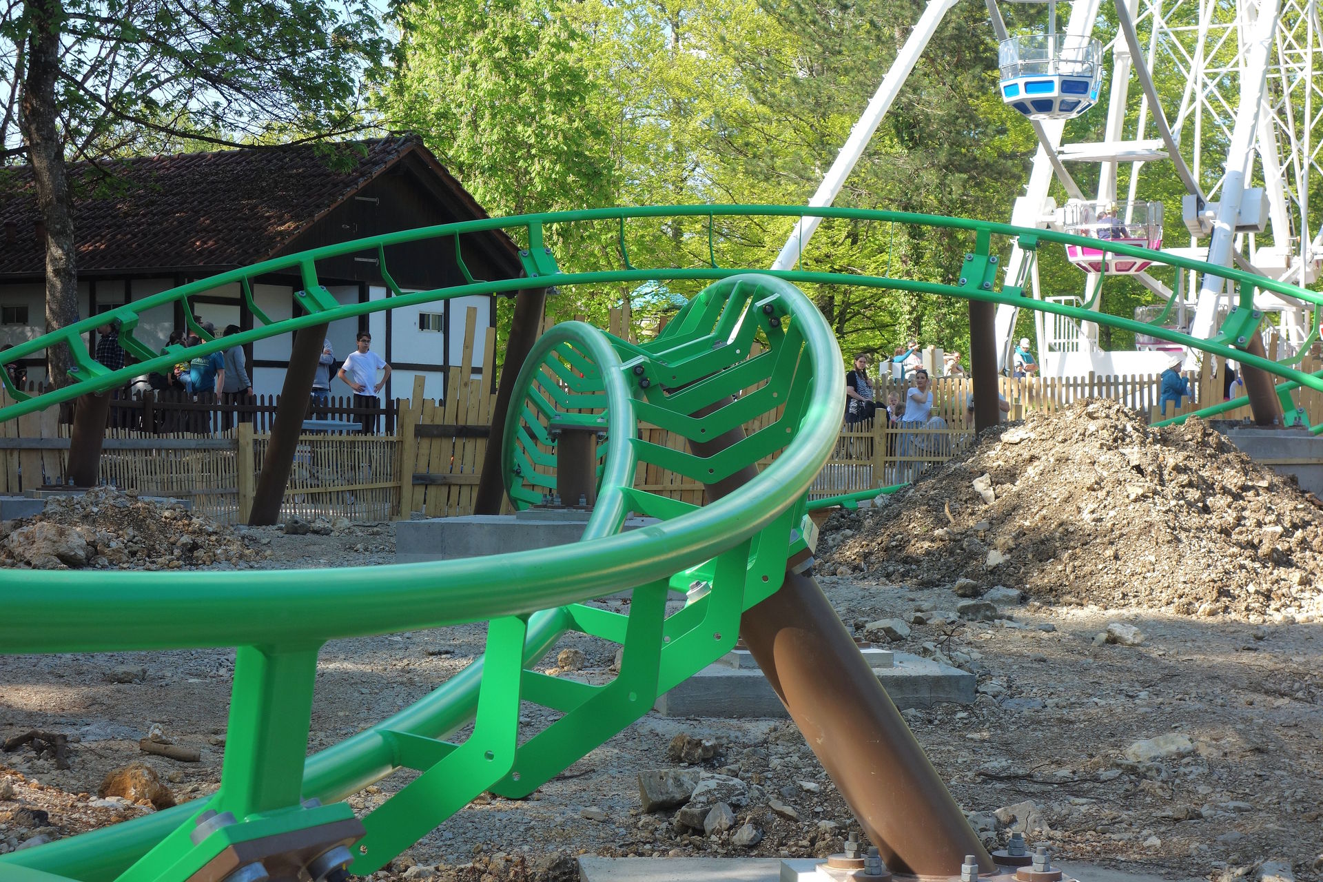 Zierer soll nach einer Generalüberholung und Modernisierung weiterverkauft werden. Ich hoffe, er findet nochmal ein schönes, neues Zuhause. Unmittelbar nach dem Abbau der alten Achterbahn - und der benachbarten Eisenbahn, die innerhalb des Parks umzog - begannen die Bauarbeiten für den Wichtelexpress, der von ART Engineering geliefert wurde. Denn schon sieben Monate später sollte die neue Achterbahn für die Besucher freigegeben werden. Ein genaues Datum nannte der Park natürlich nicht, man sprach immer nur von Mai. Daher hatte ich den Park zwar als Option - wahlweise für den Anreisetag oder den Abreisetag - eingeplant, rechnete aber eher mit einer Eröffnung später im Monat. Obwohl in der Woche vor der Tour tatsächlich schon die ersten 30 Besucher (Jahreskartenbesitzer, welche die Jungfernfahrt im Rahmen eines Presse-Events gewonnen hatten) eine Runde drehen durften, mussten wir auf dem Hinweg noch mit dem Schwaben Park vorliebnehmen. Dienstags erreichte uns dann die Nachricht, dass der Wichtelexpress seit dem Vortag offiziell eröffnet sei. Perfektes Timing also, um den nagelneuen Count auf dem Heimweg auszutesten.