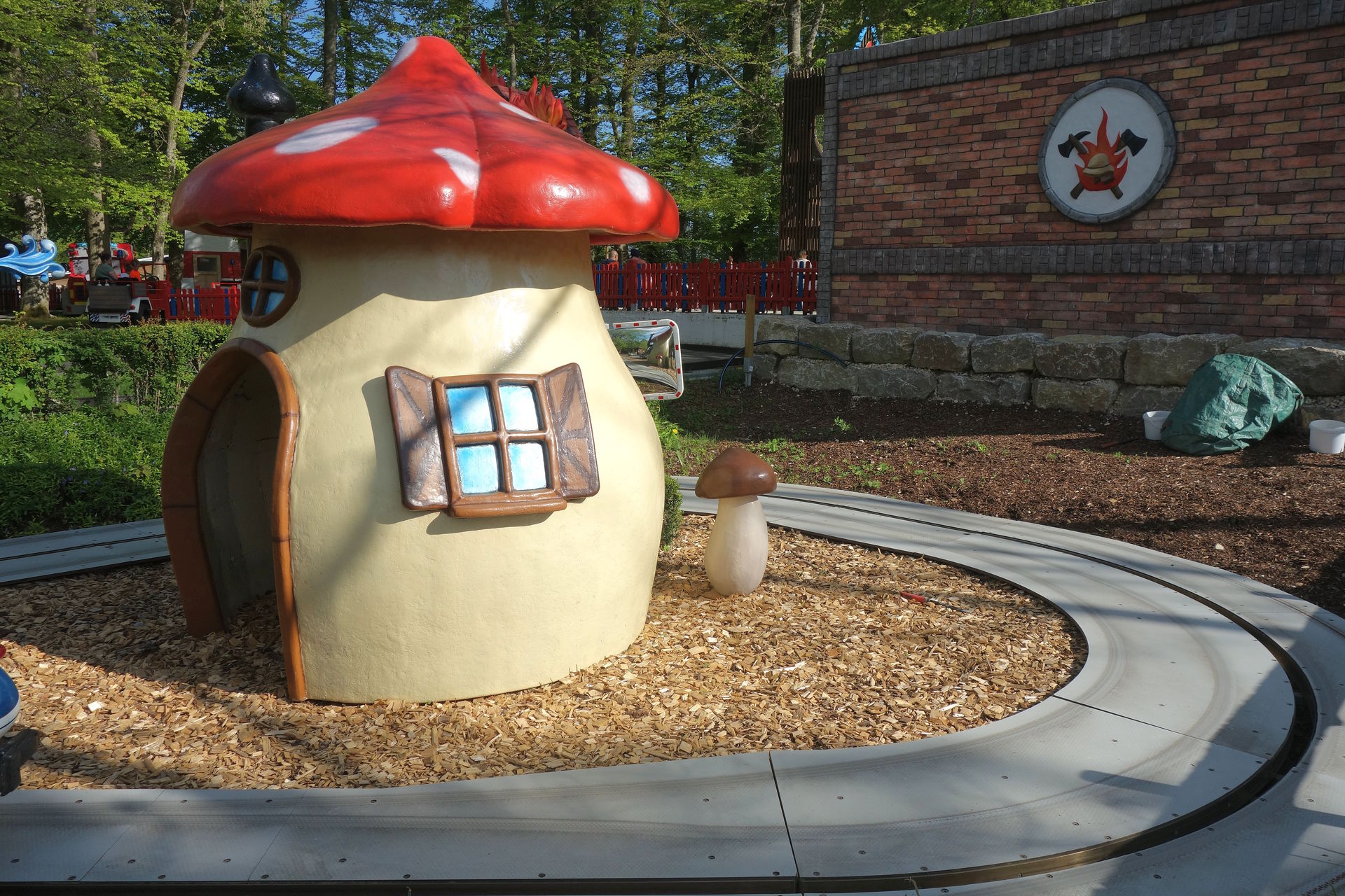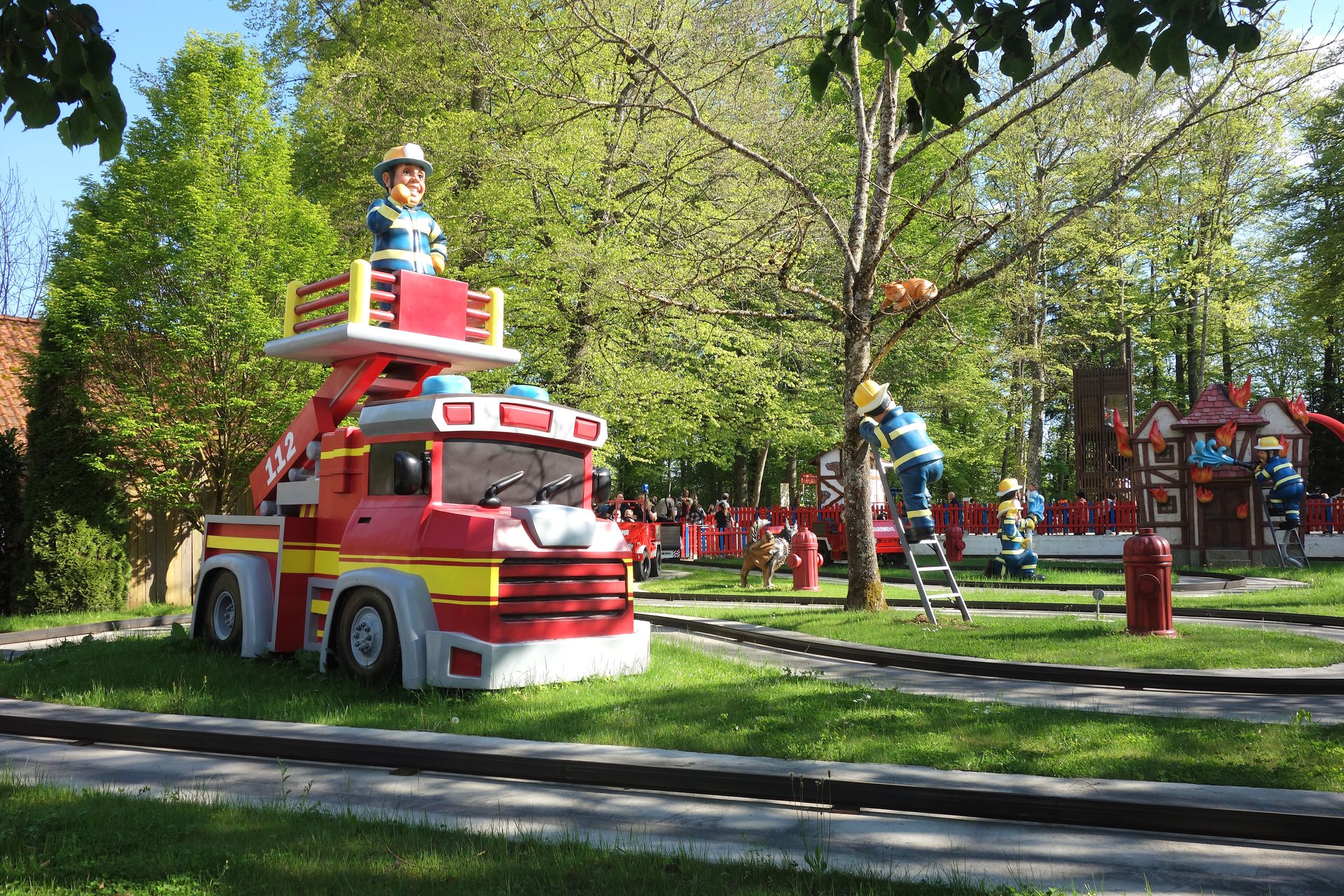 Die Feuerwehr-Fahrt wurde von Metall-Technik Kirschner in Winterberg gebaut (für den Vertrieb von deren Anlagen zeichnet offenbar abc rides verantwortlich) und ersetzte die 1990 eröffnete Oldtimer-Fahrt. Das war wohl auch einer der Gründe, weshalb man sich für eine Anlage von Kirschner entschieden hat, denn dessen Fahrzeuge waren zum Zeitpunkt der Bestellung die einzigen, welche die engen Kurvenradien von 3 Metern des bestehenden Layouts absolvieren konnten. Die Streckenführung der Oldtimer wurde nämlich beibehalten, es änderten sich lediglich die Fahrtrichtung und die Platzierung der Station. Und natürlich die Gestaltung. So sind die viersitzigen Feuerwehr-Unimogs natürlich mit einem Blaulicht ausgestattet, das von den Mitfahrern individuell ein- und ausgeschaltet werden kann. Auch die Fahrgeschwindigkeit kann - in einem gewissen Rahmen - über das Gaspedal nach Belieben gesteuert werden. Reflexlichttaster und Ultraschall sorgen als Abstandssensoren dafür, dass es nicht zu Auffahrunfällen kommt. Passend dazu wurde der Feuerwehr-Spielplatz vom finnischen Spielplatz-Spezialisten Lappset entworfen und gebaut. Er besteht aus einem Kletterturm mit Rutschen, der die Feuerwehrstation darstellt, einer sogenannten Wall-Holla - quasi eine Wand, in der man über verschiedene Ebenen ebenfalls herumklettern kann - und einem Sona. Letzterer ist ein einfacher Bogen mit zugehörigen Bodenmarkierungen, der über Knopfdruck verschiedene interaktive Spiele anbietet. Vom einfachen Dance Battle, über Aerobic bis hin zu Matheaufgaben.