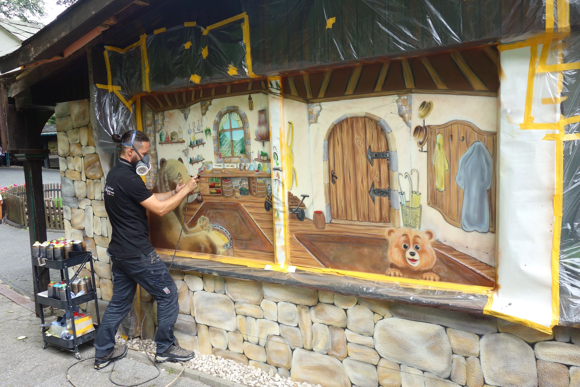 Der aus Rumänien stammende Airbrush-Künstler Teodor Morar hat in den letzten Jahren schon diverse Figuren im Eifelpark aufgehübscht und einige der Gebäude thematisch passend gestaltet. Darunter die Toilettenanlage auf dem Westernplatz innen wie außen und die Stallungen des Eifelpark-Bauernhofs von außen. Die Toiletten im Untergeschoss des SB-Restaurants am Tatzenplatz hatten laut seiner Facebook-Chronik 2022 bereits eine neue Innengestaltung erhalten, nun wurde die Gestaltung außen fortgesetzt. Auf dem Bild legt er gerade letzte Hand an der Seite zum Hauptweg an. Kann sich wirklich sehen lassen und wertet ben Bereich nochmals deutlich auf.